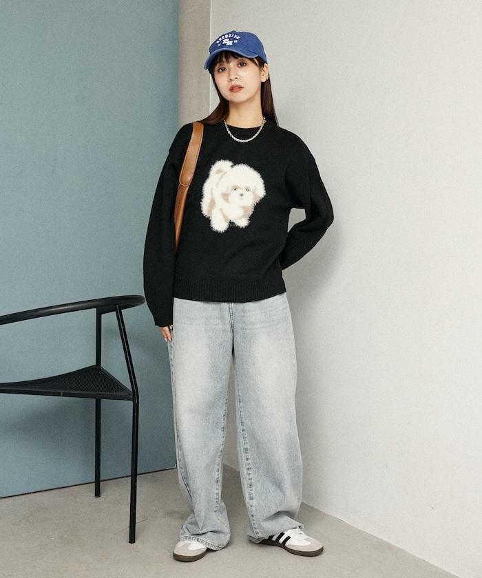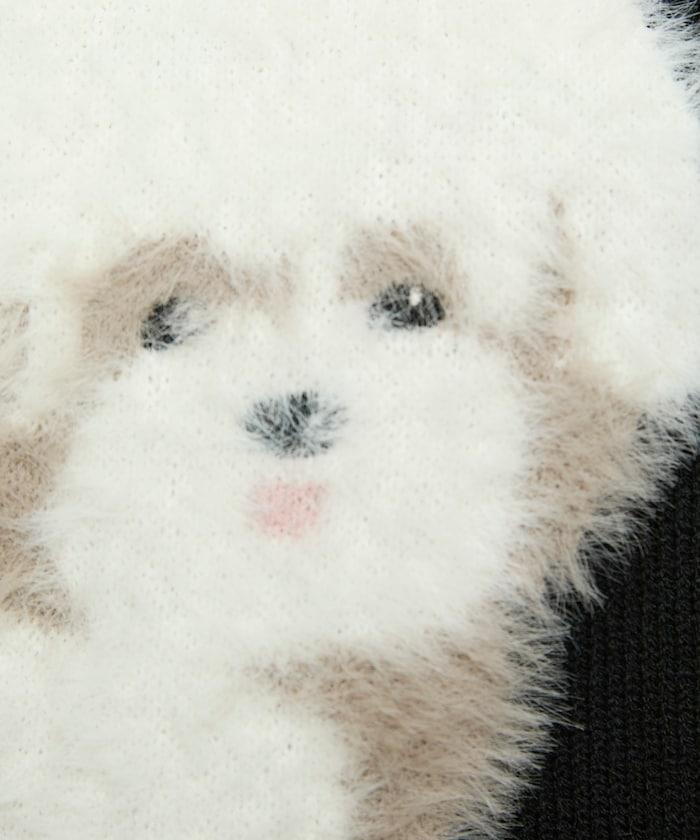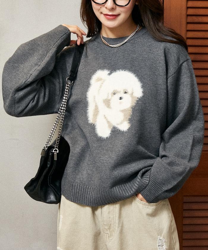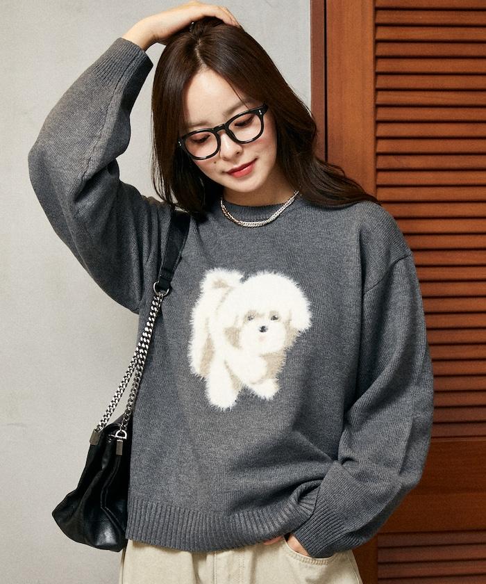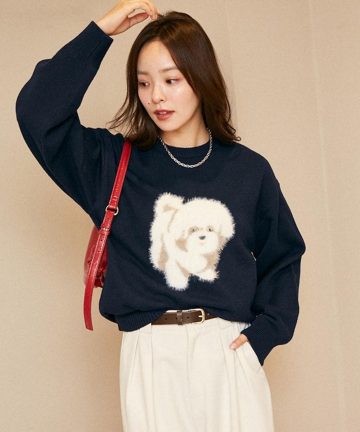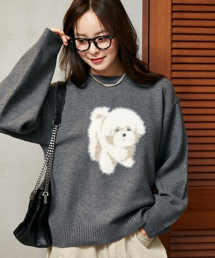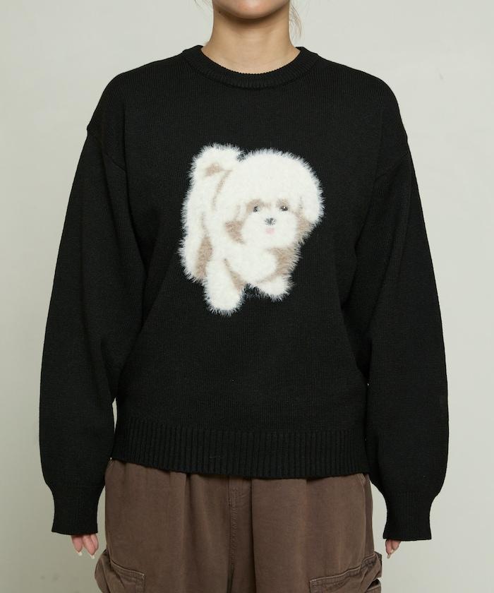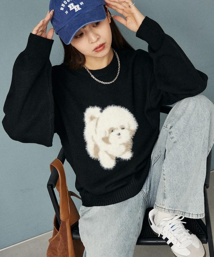 用蓬鬆的羽毛紗線編織的小狗提花圖案應用於胸前,設計感十足。