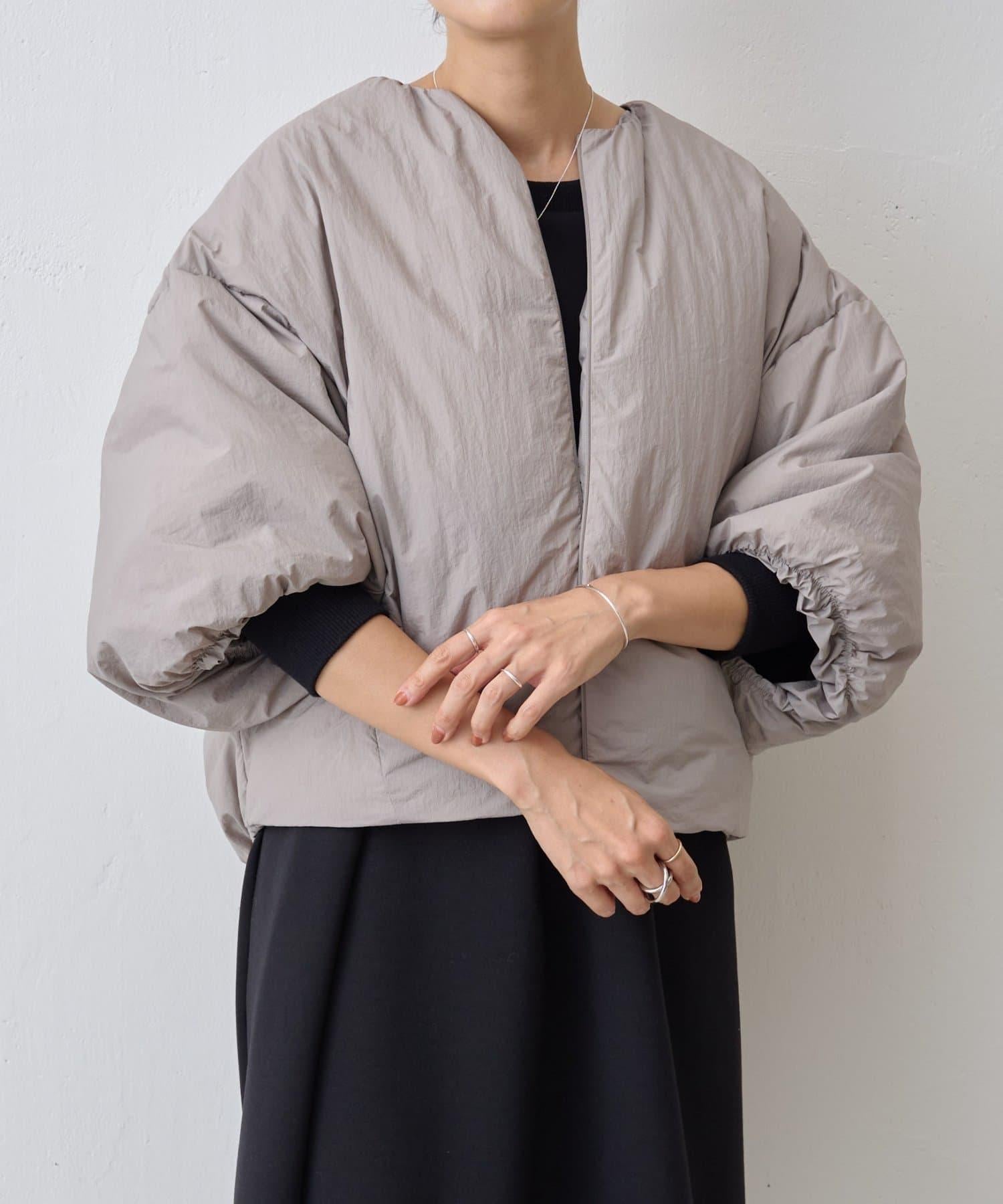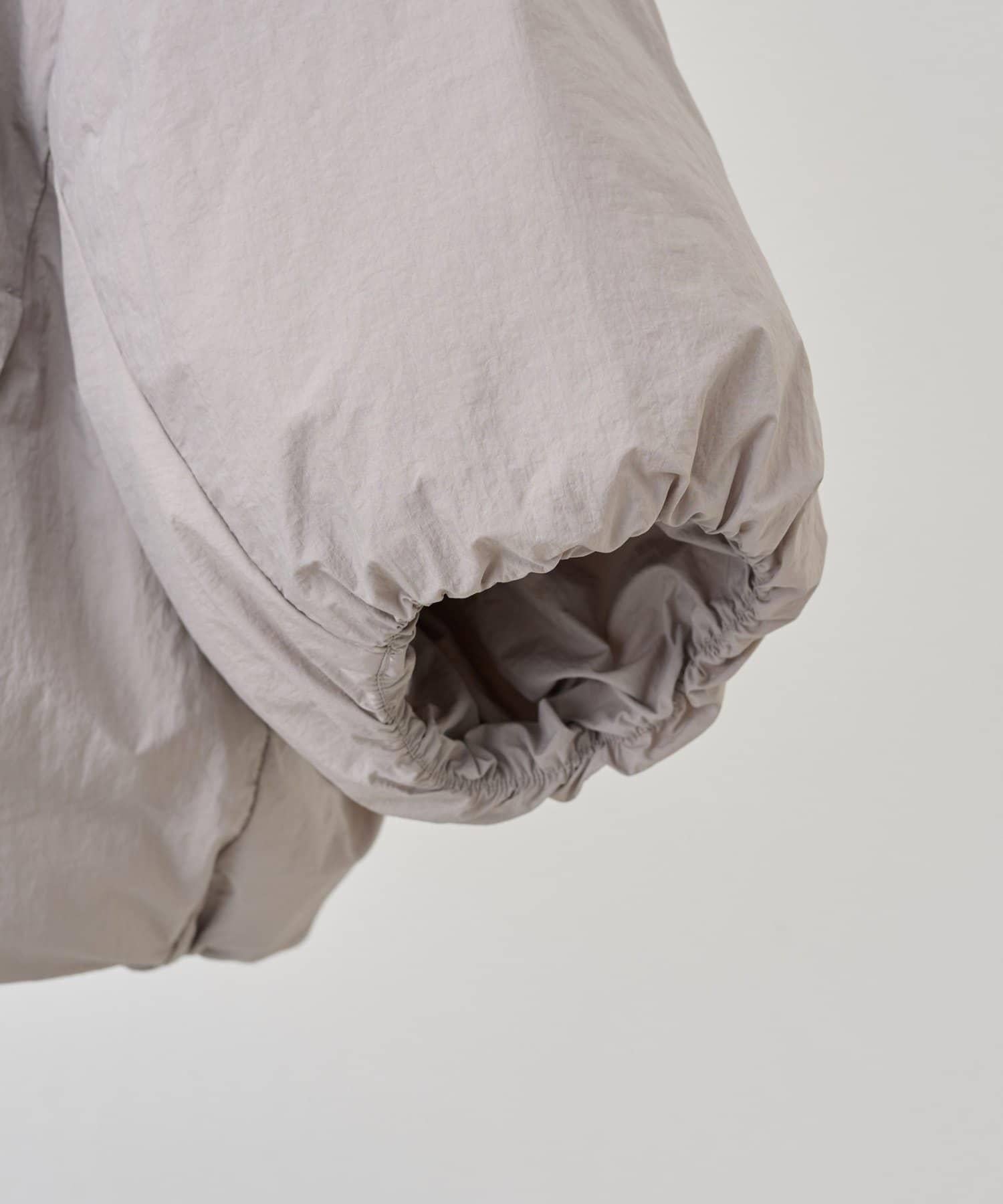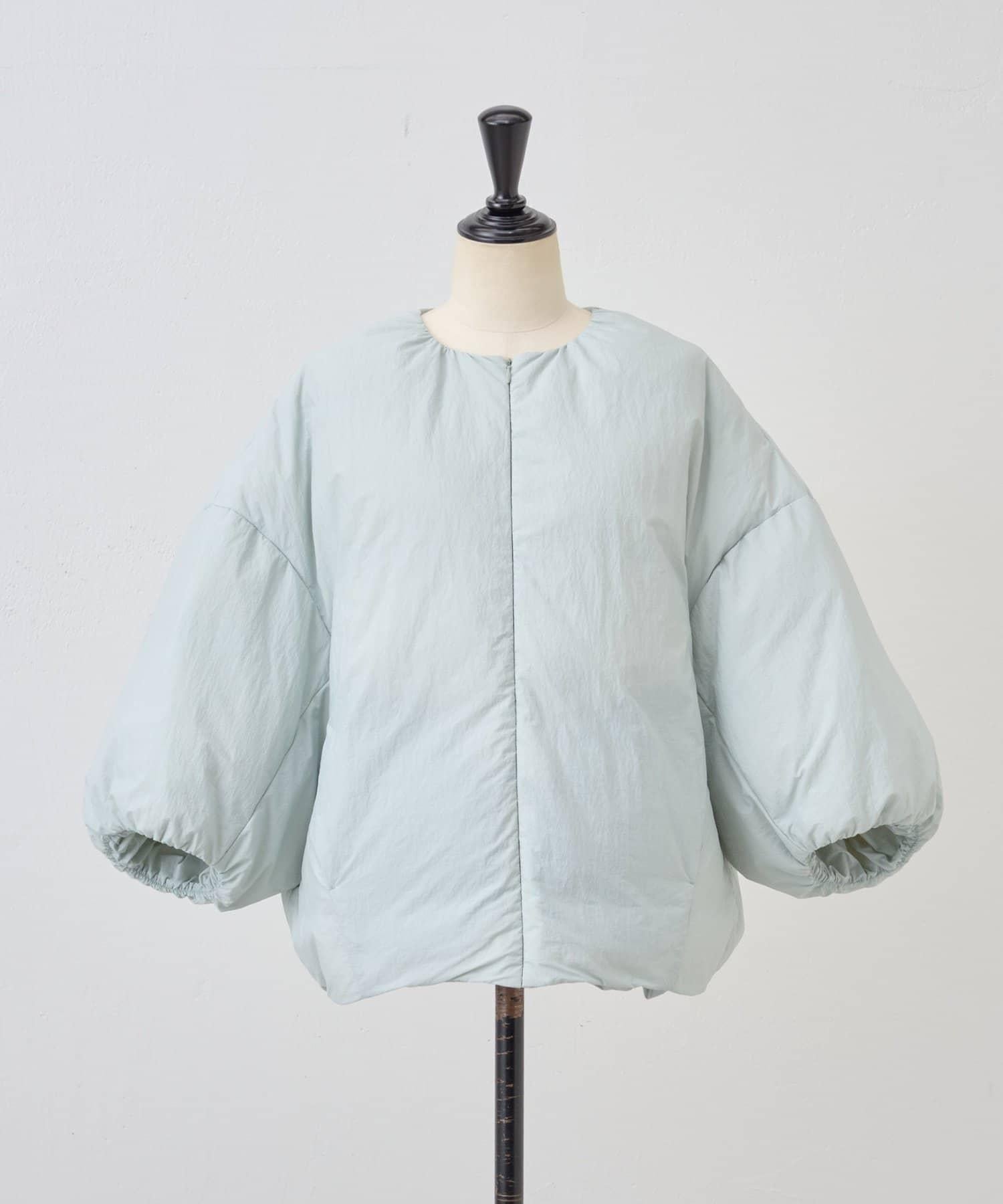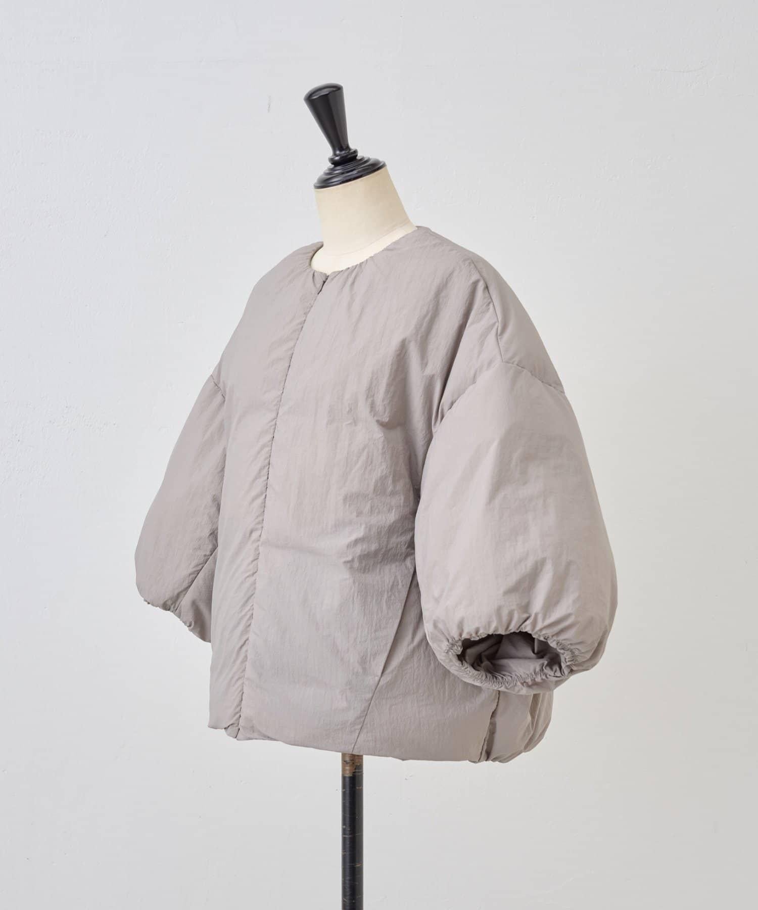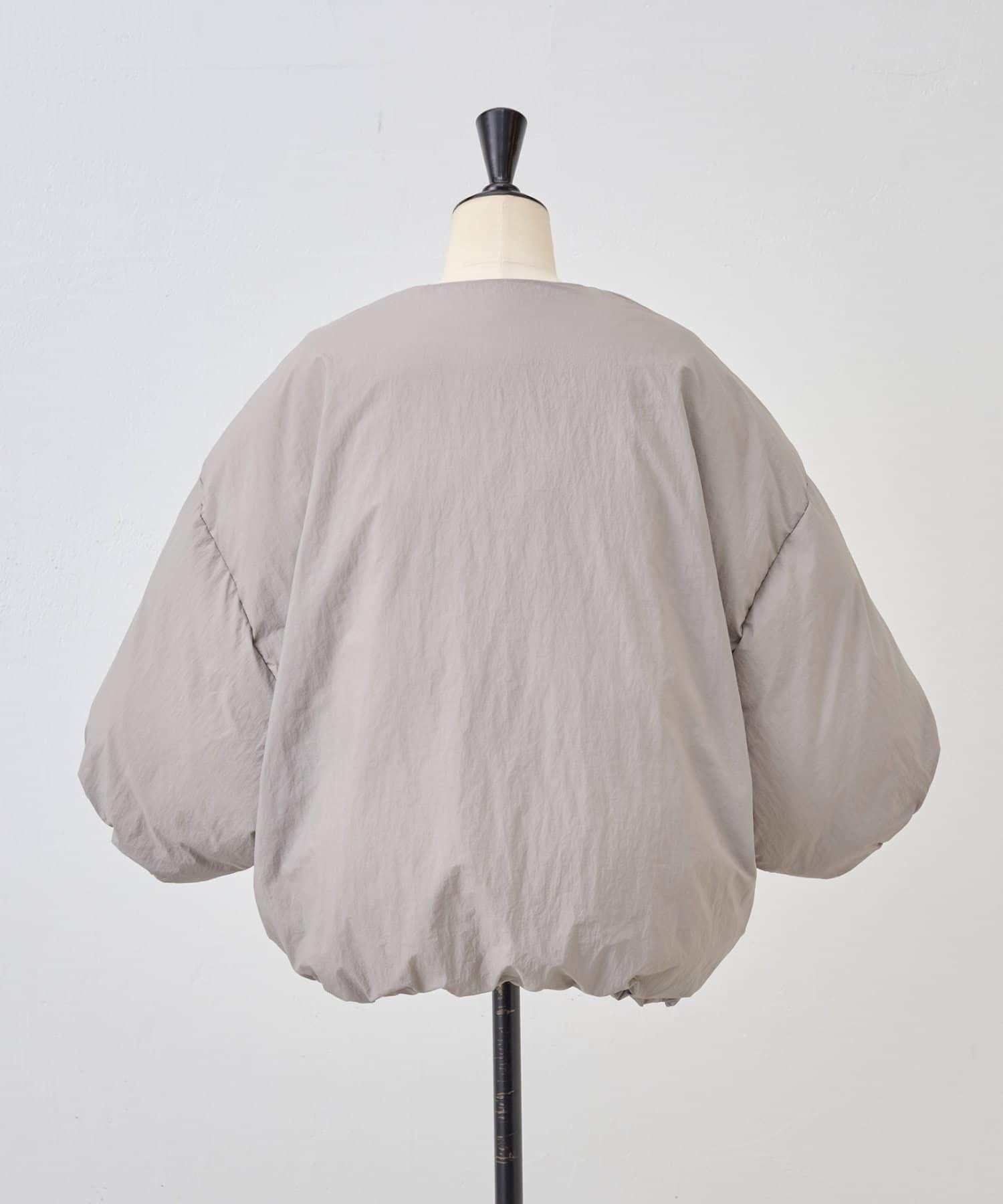 衣領採用無領設計,看起來乾淨利落,袖口內側收攏,營造出氣球的輪廓。