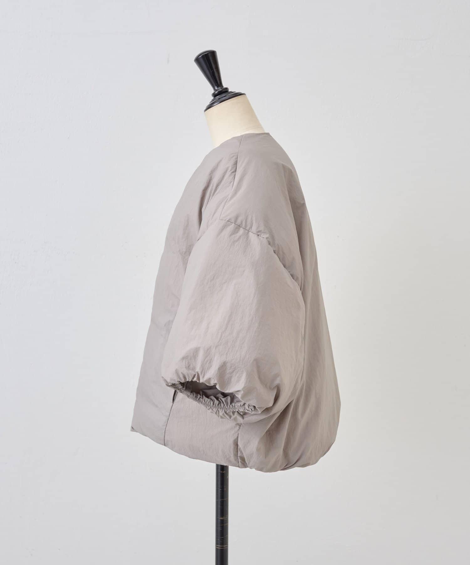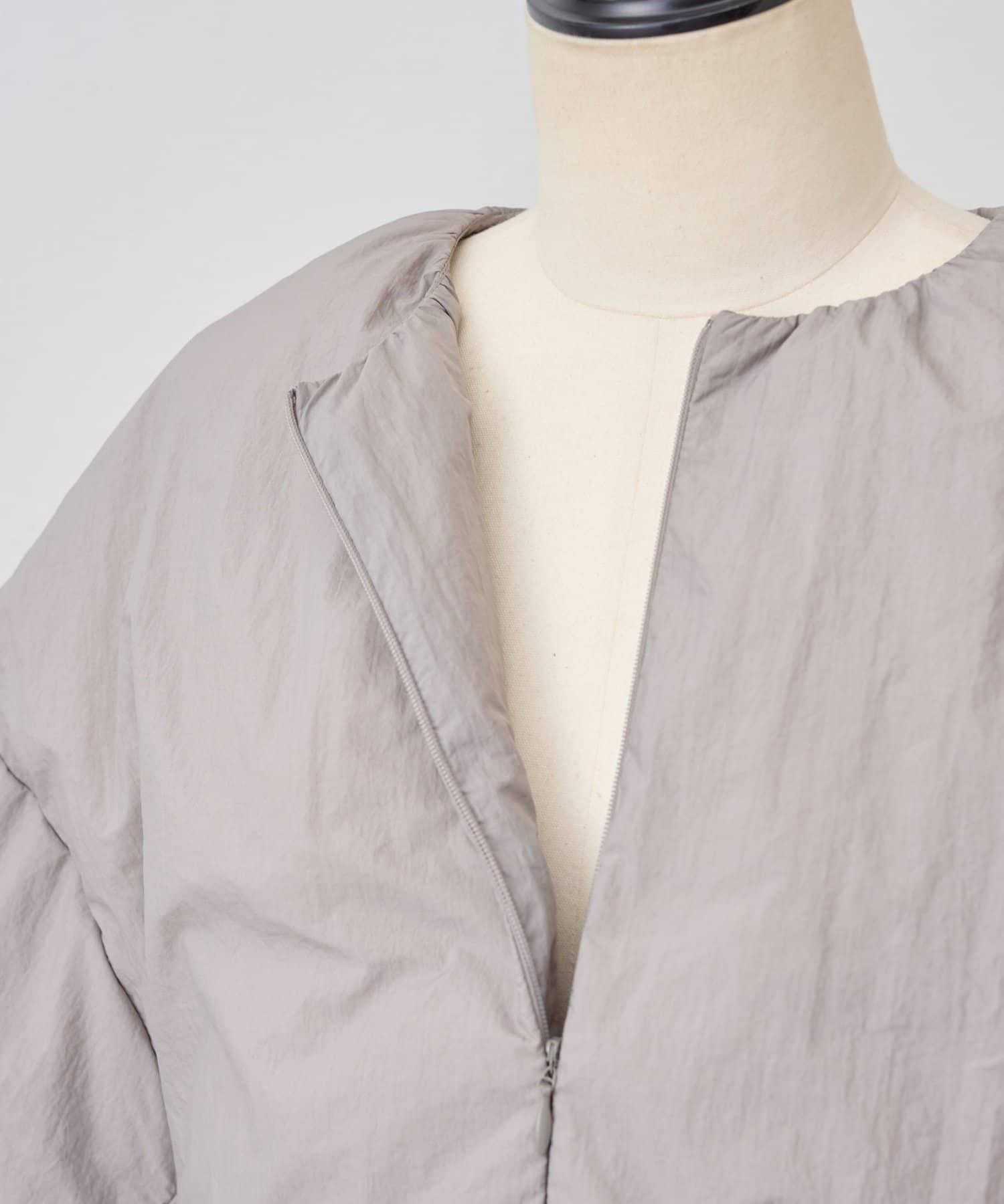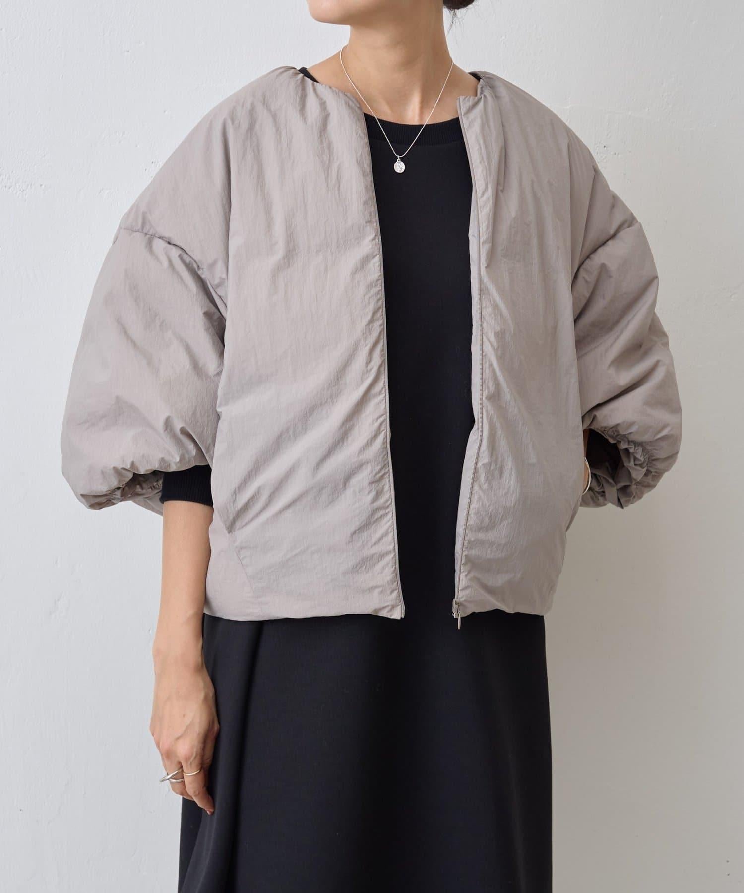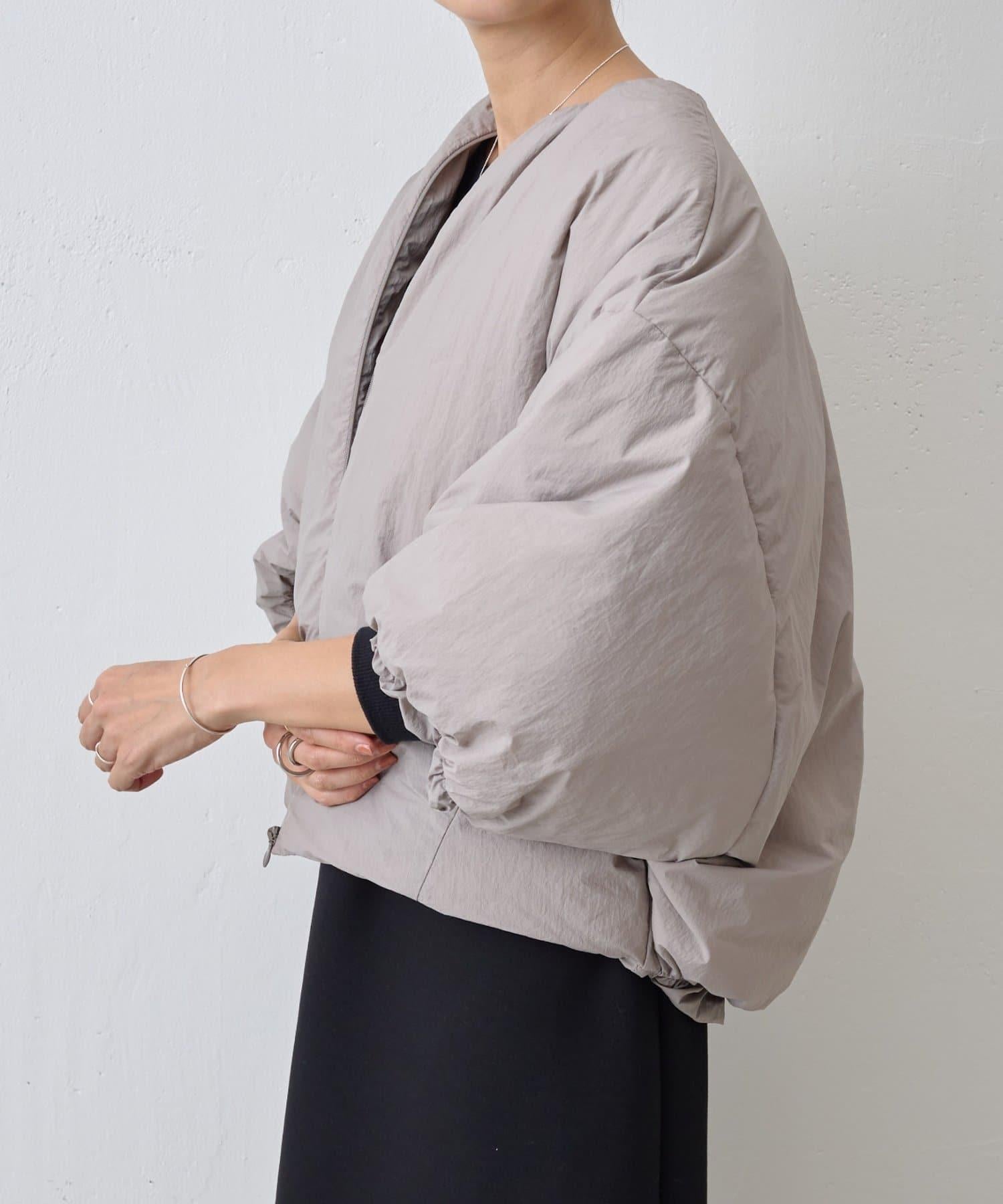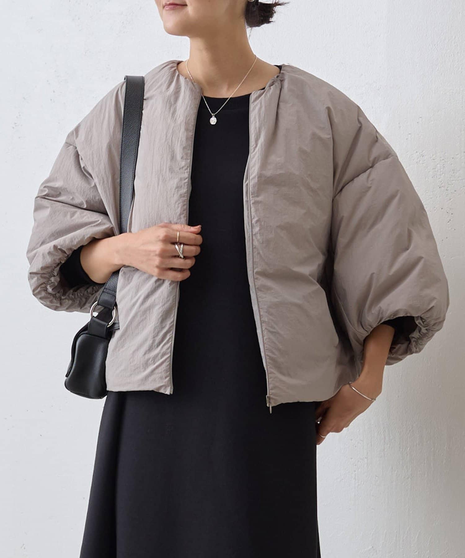 衣領採用無領設計,看起來乾淨利落,袖口內側收攏,營造出氣球的輪廓。