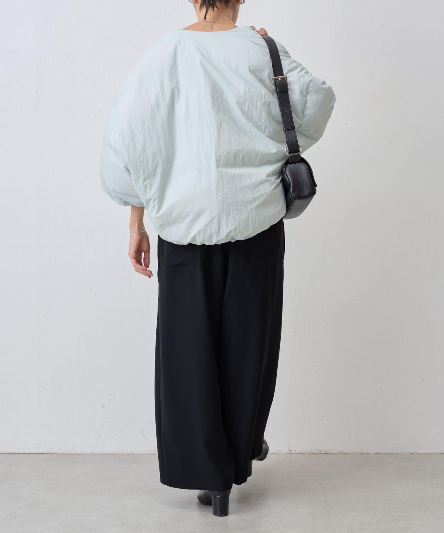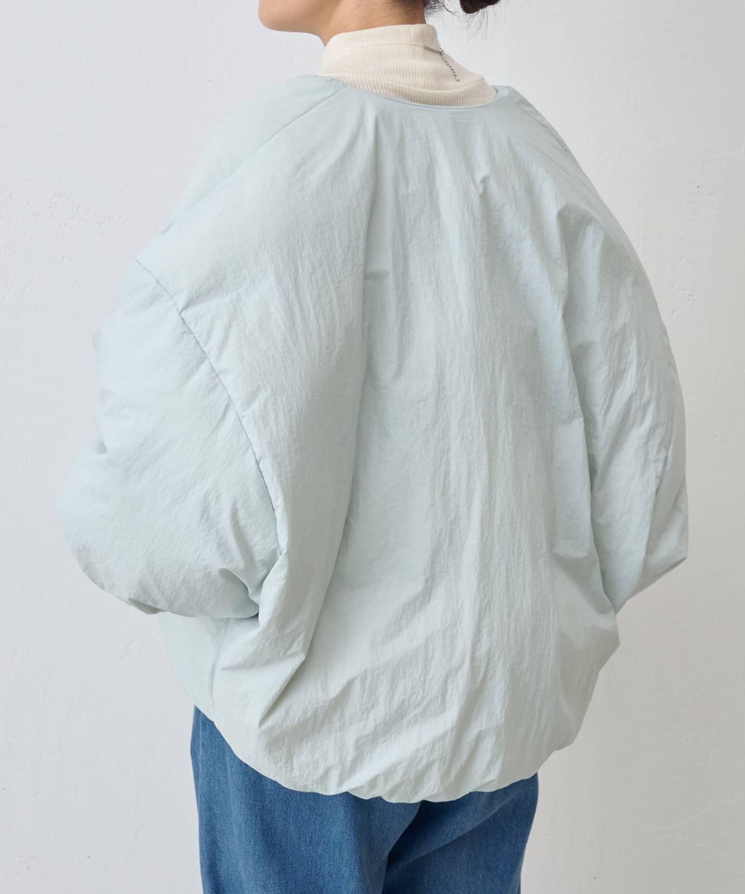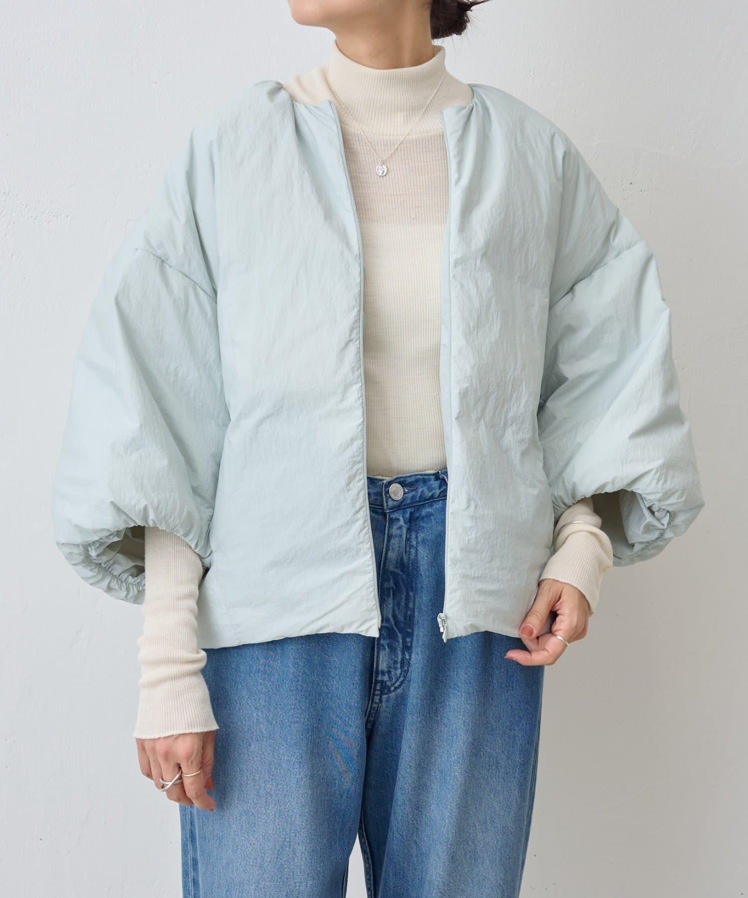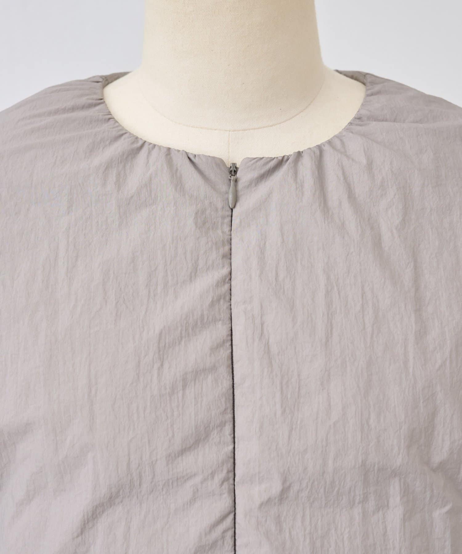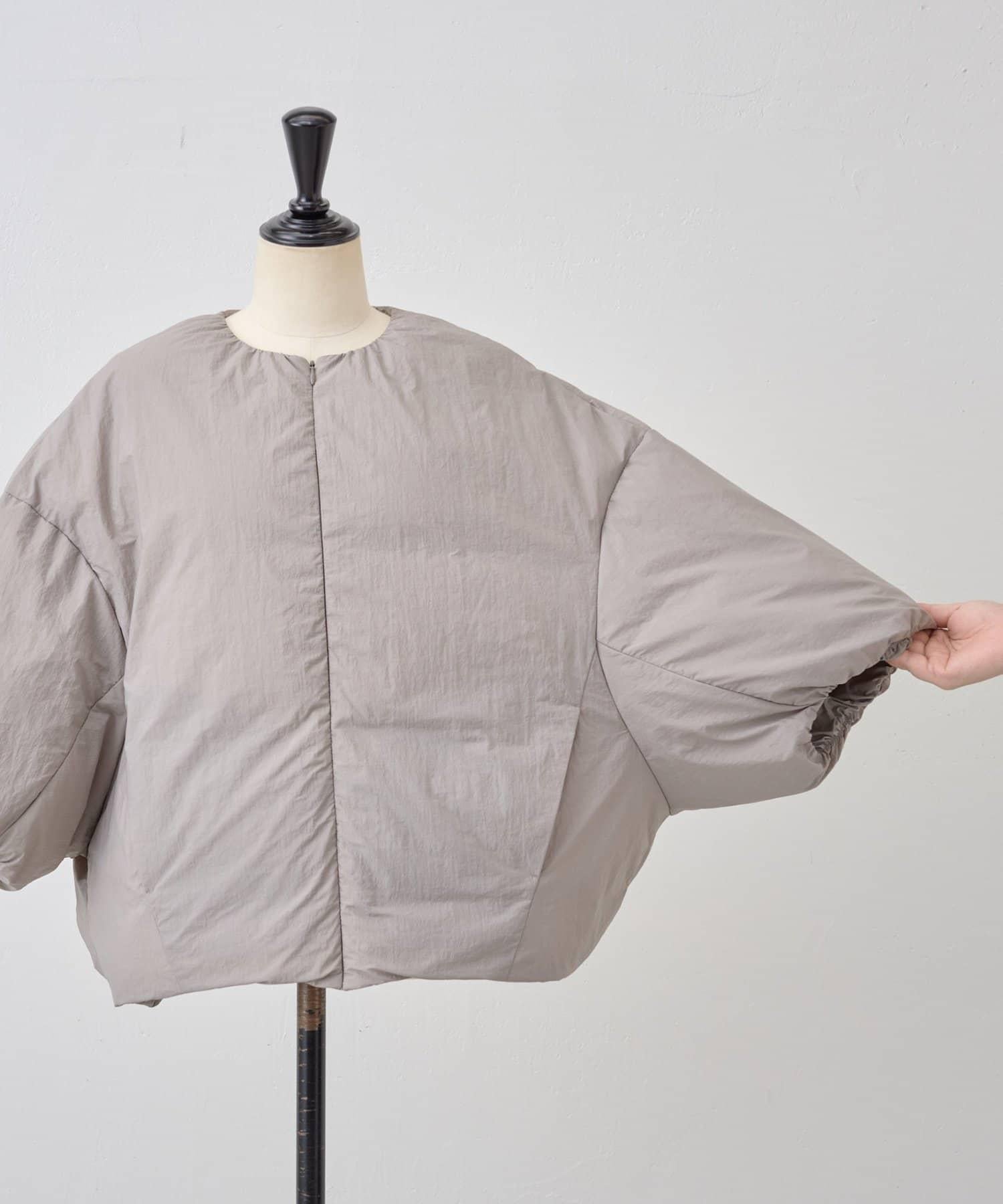 衣領採用無領設計,看起來乾淨利落,袖口內側收攏,營造出氣球的輪廓。