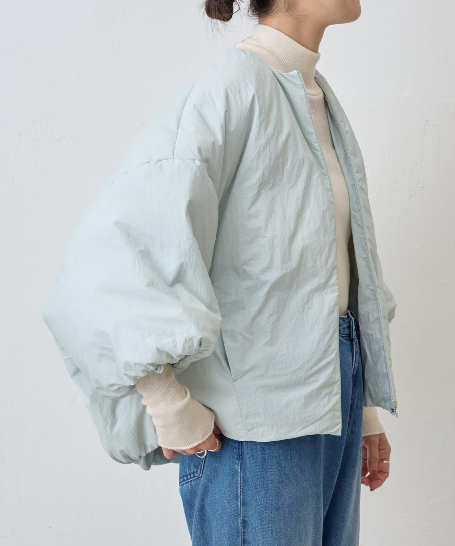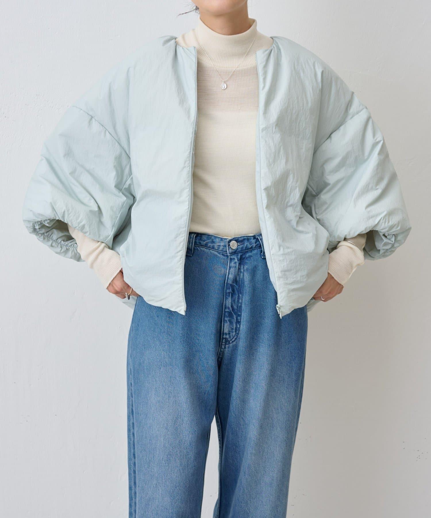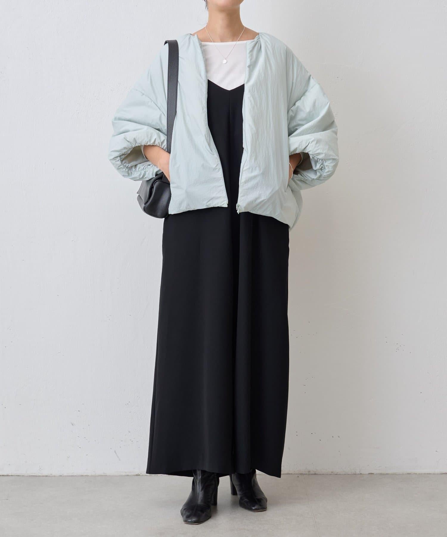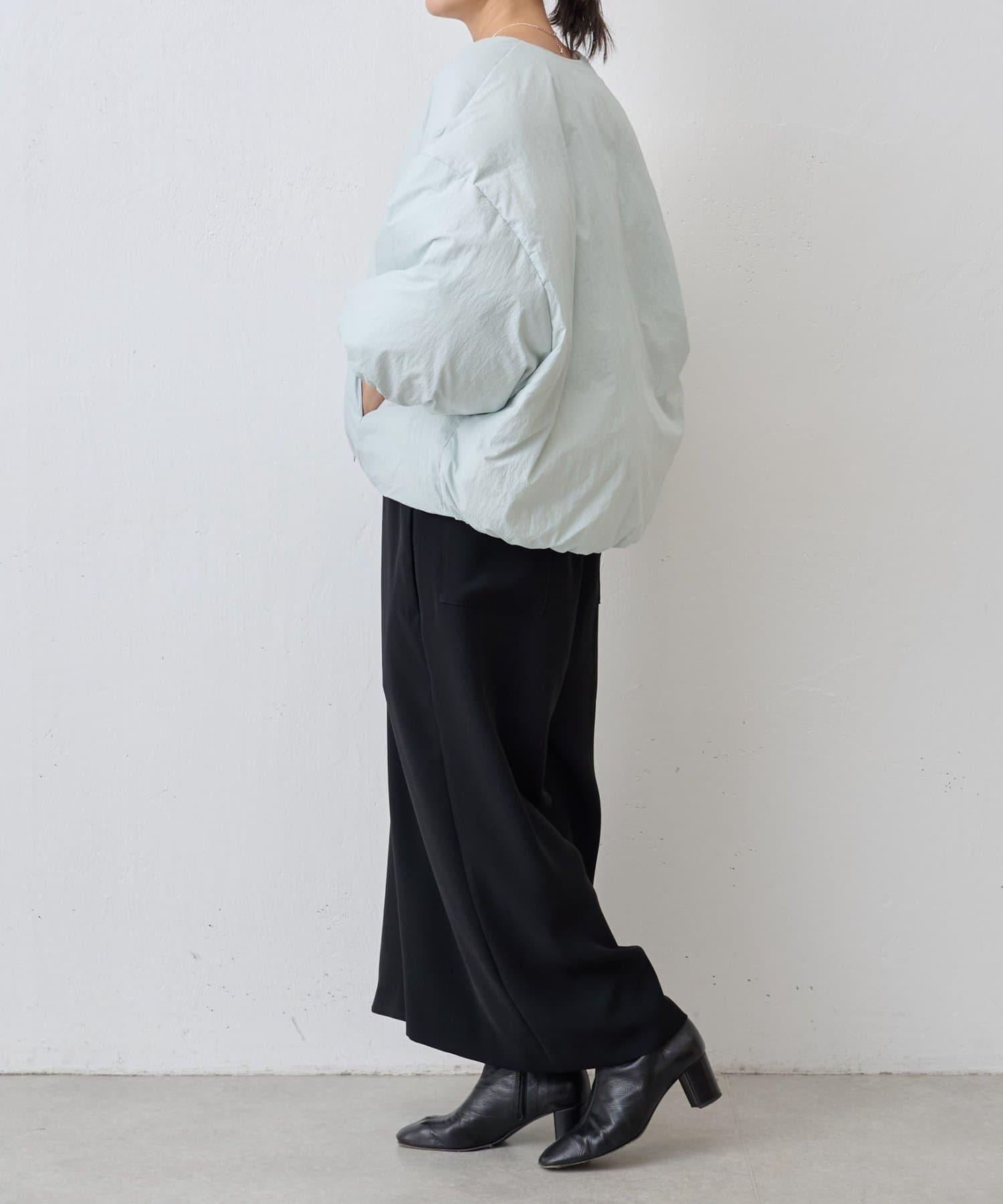 衣領採用無領設計,看起來乾淨利落,袖口內側收攏,營造出氣球的輪廓。