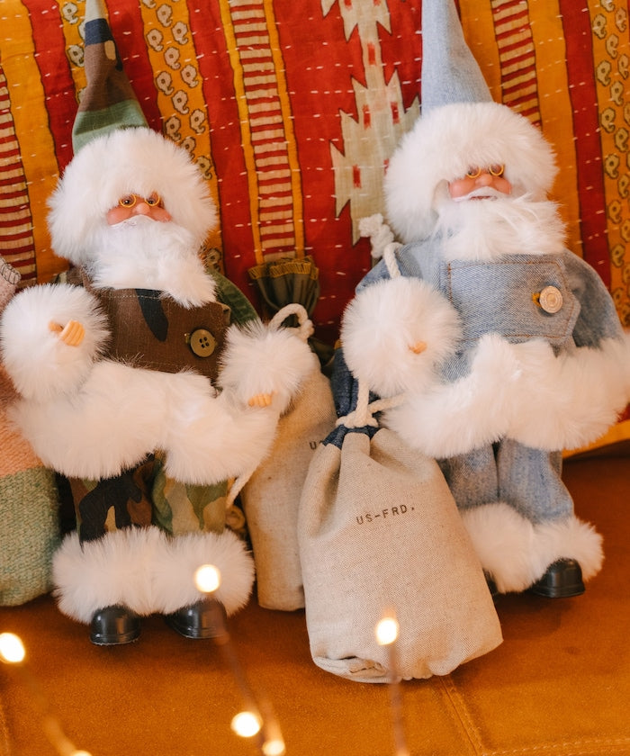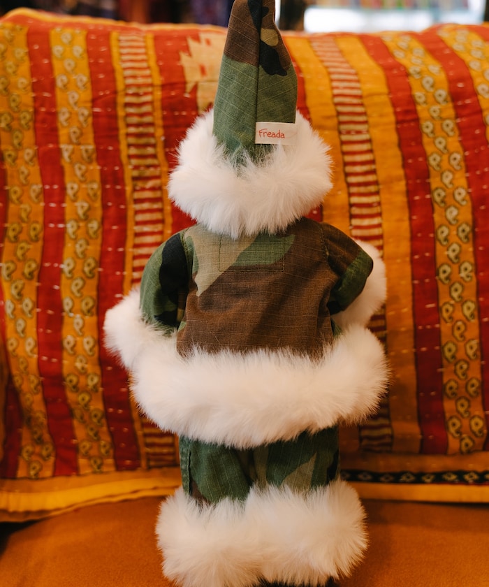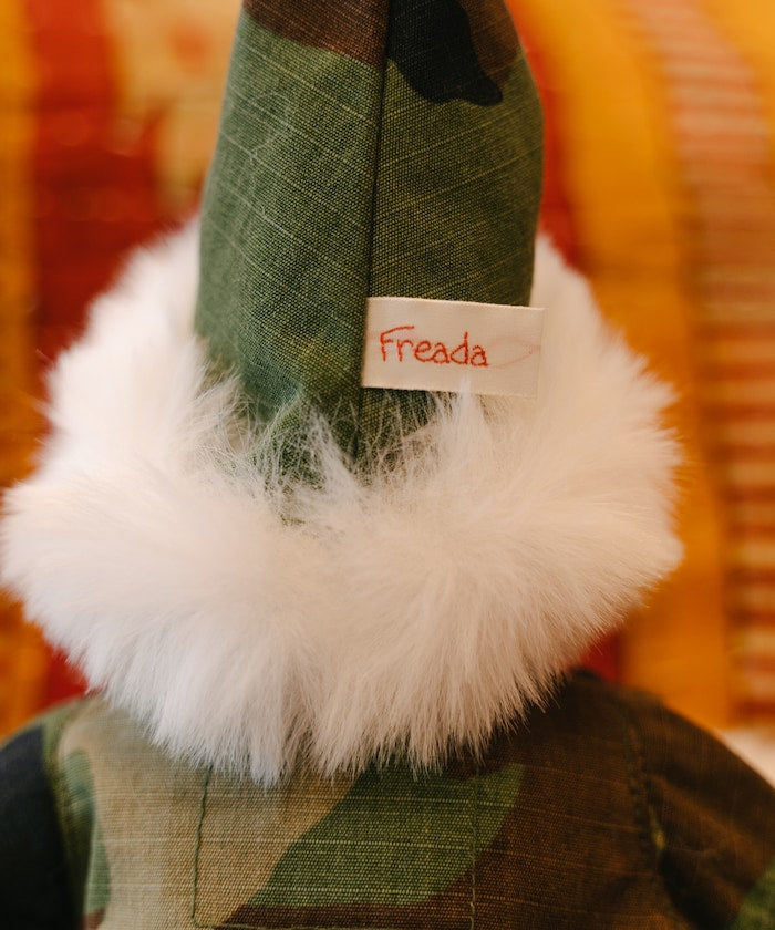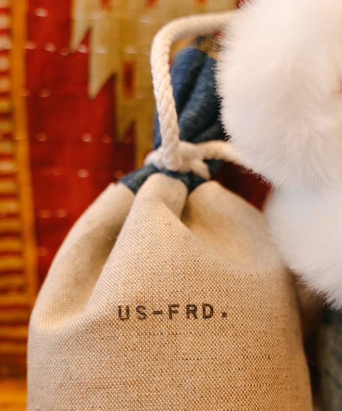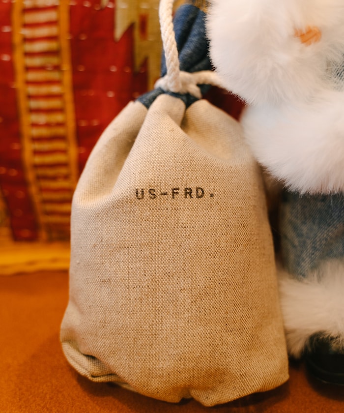 他背上的禮品袋是法國軍隊的亞麻床罩,上面刻有 Freada 縮寫 "FRD",就像軍用洗衣袋一樣。