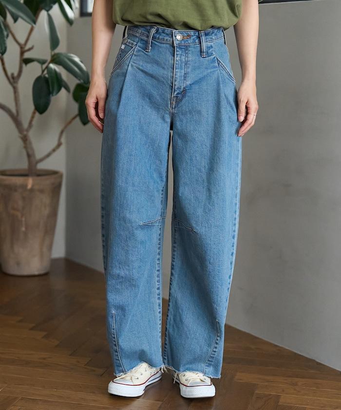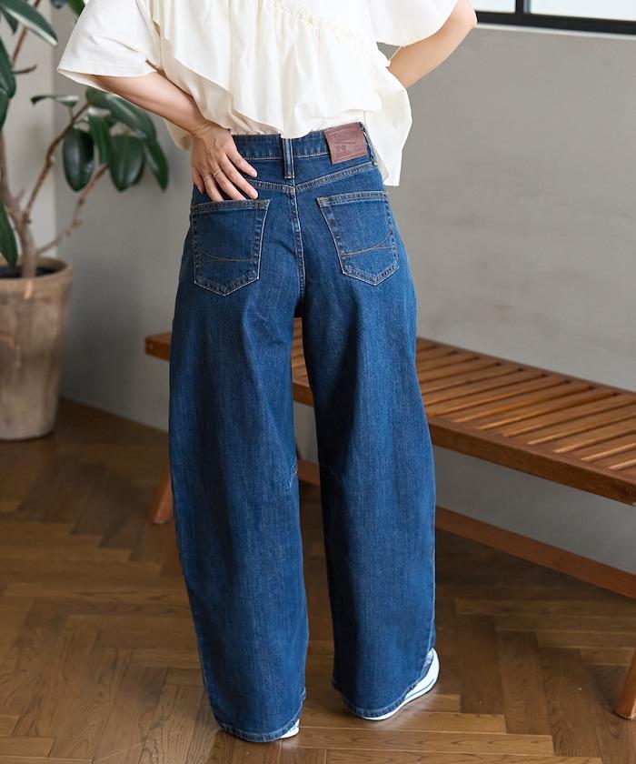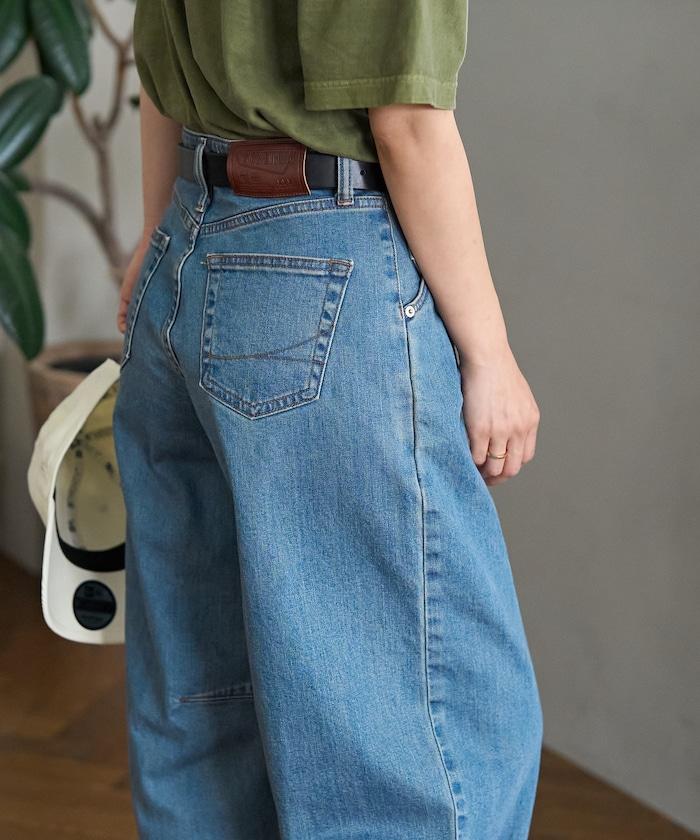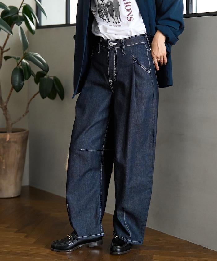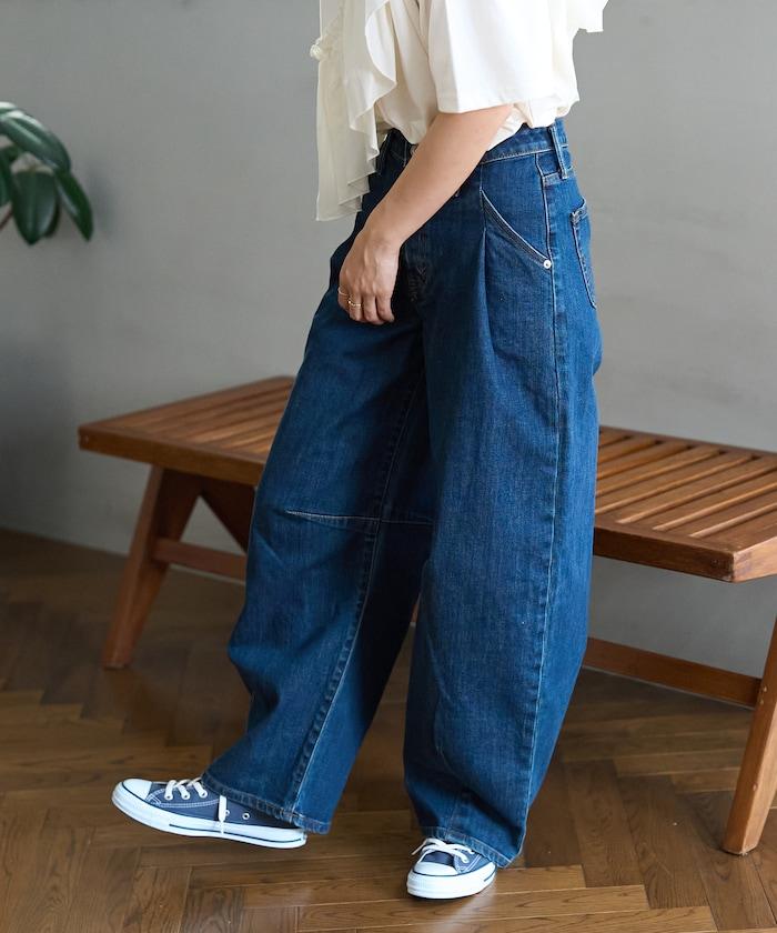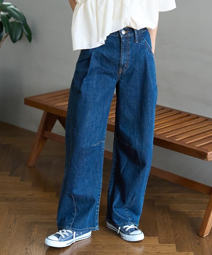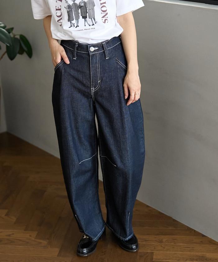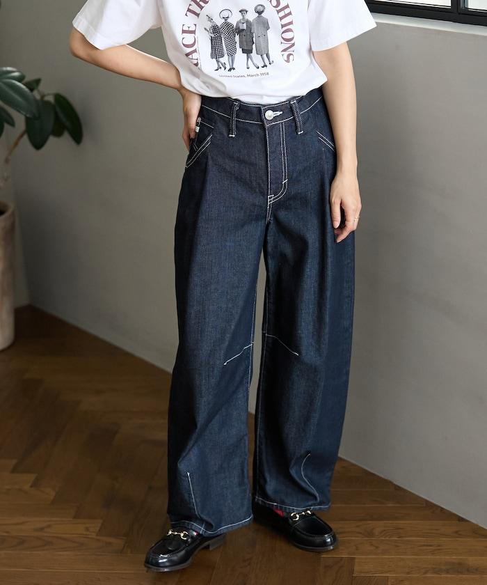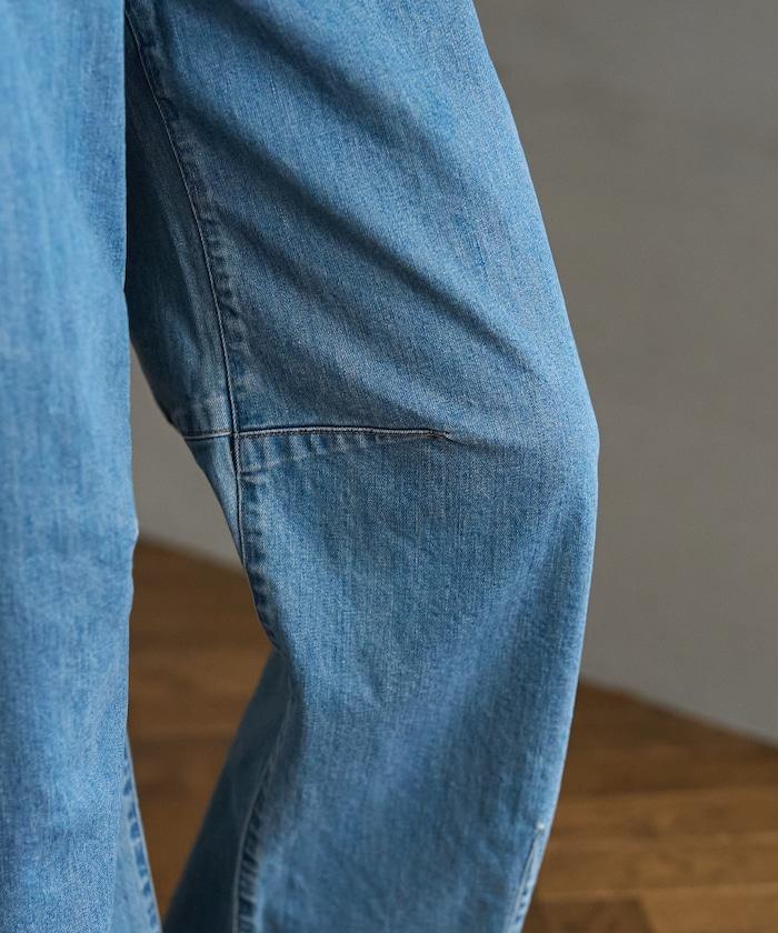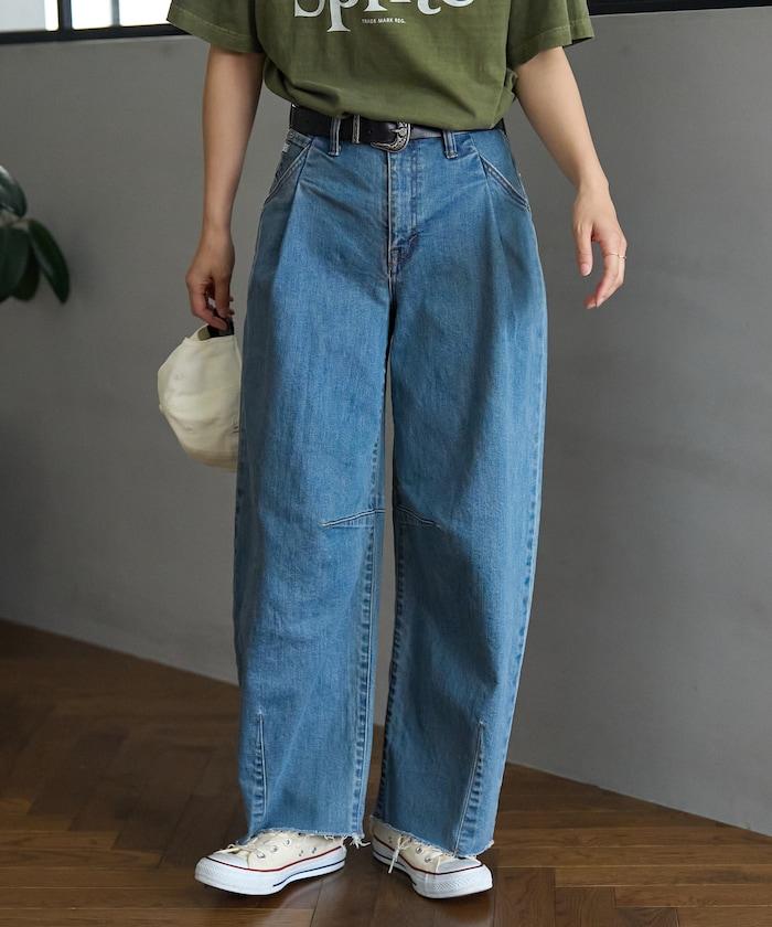 廓形優美的寬鬆牛仔褲,配以曲線線條和褶襉。