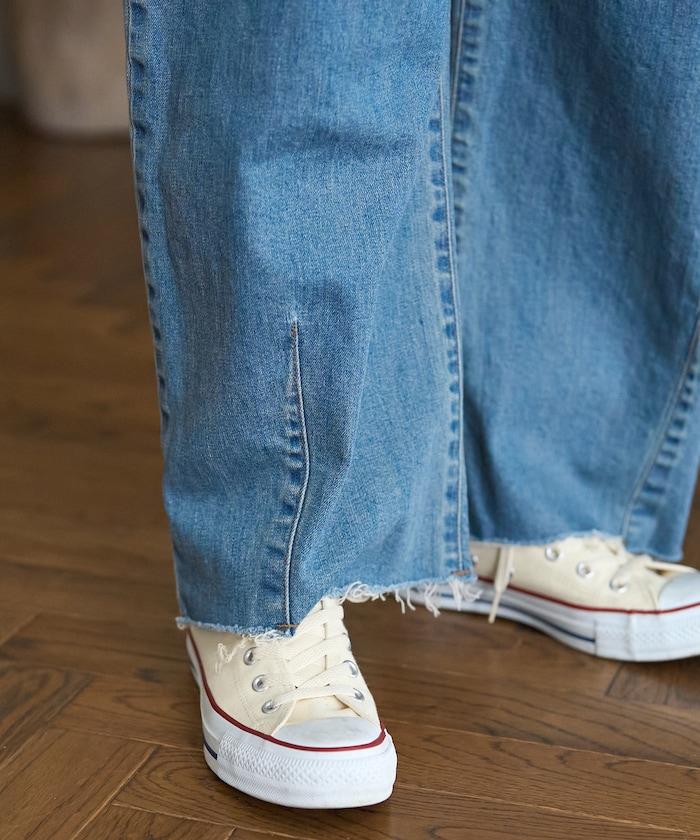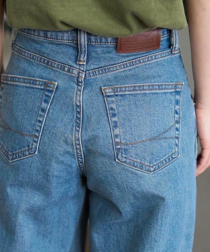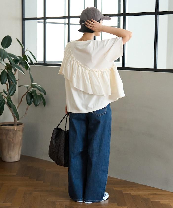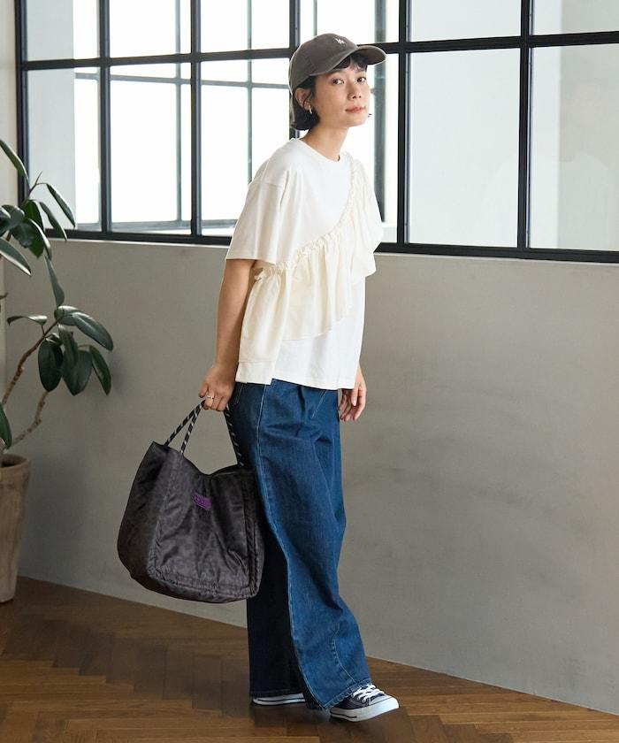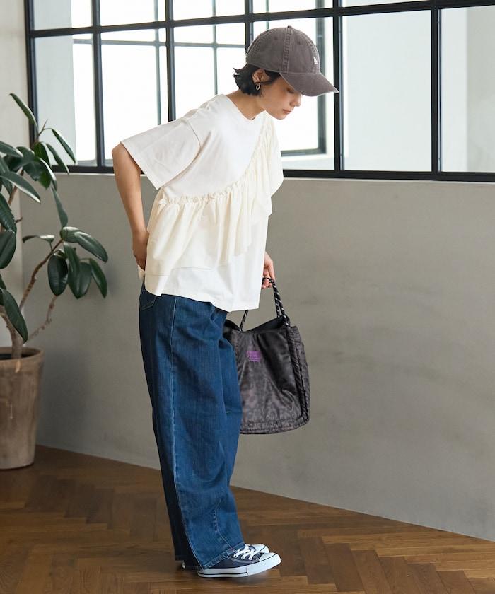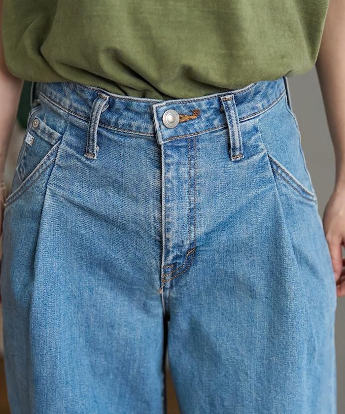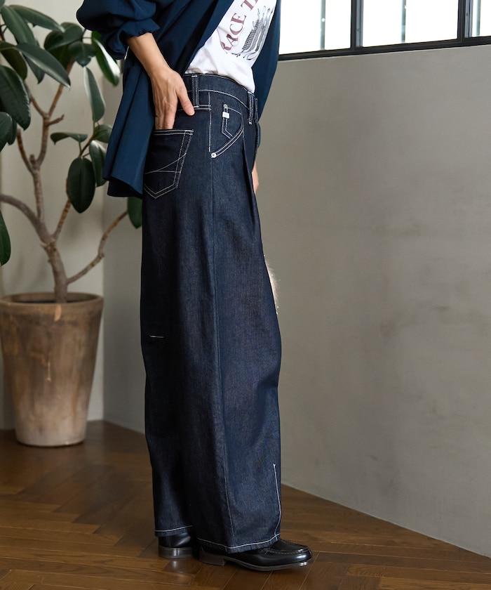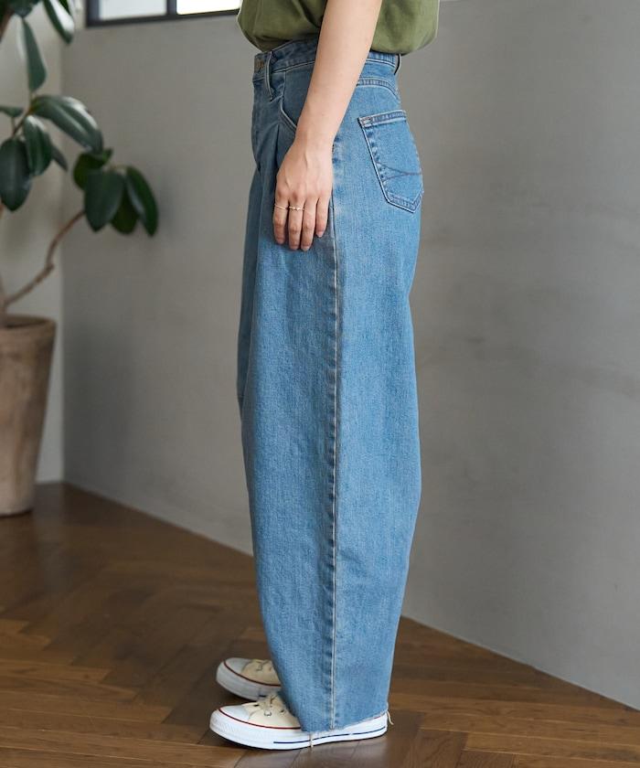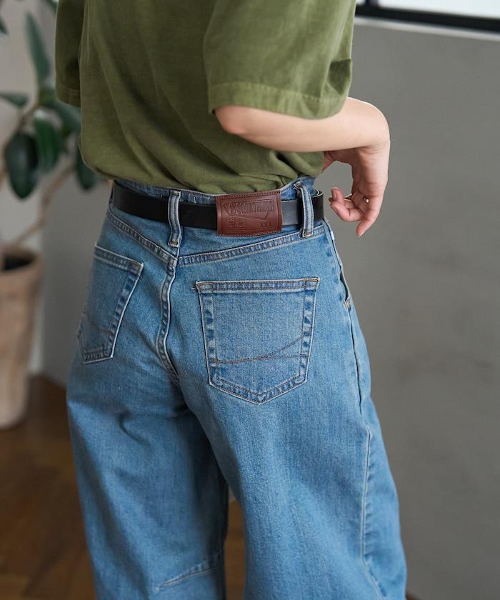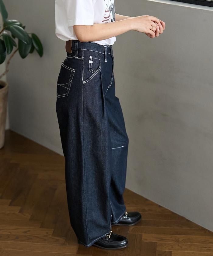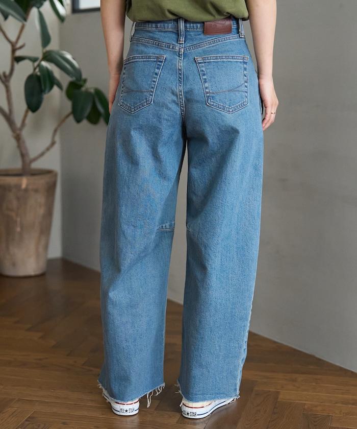 廓形優美的寬鬆牛仔褲,配以曲線線條和褶襉。