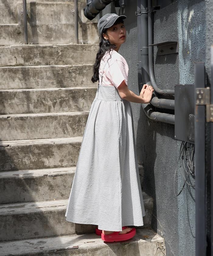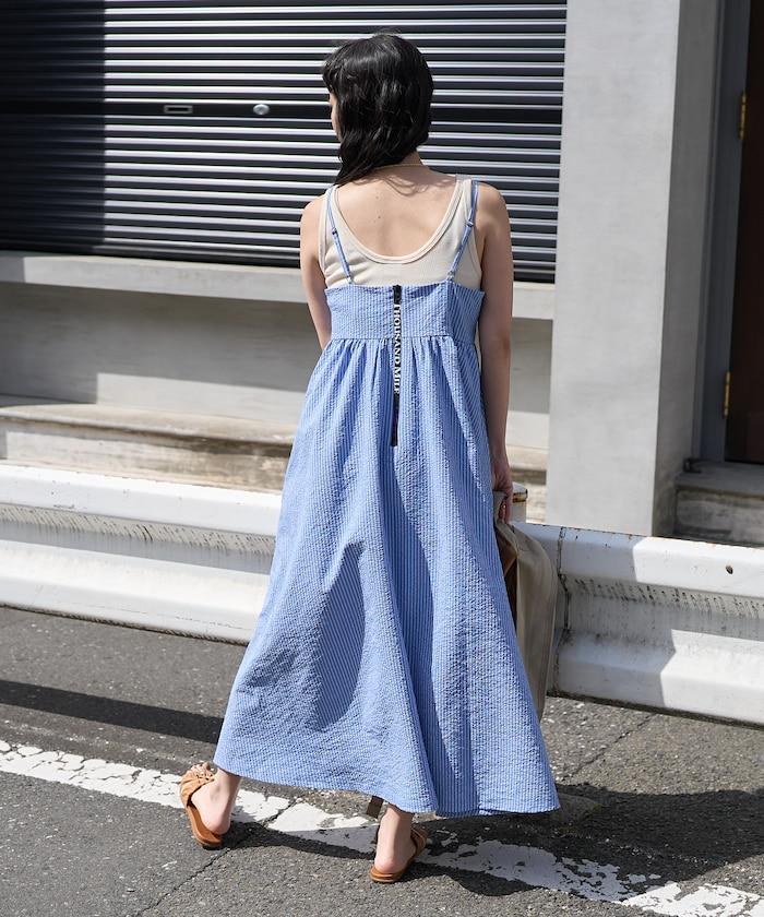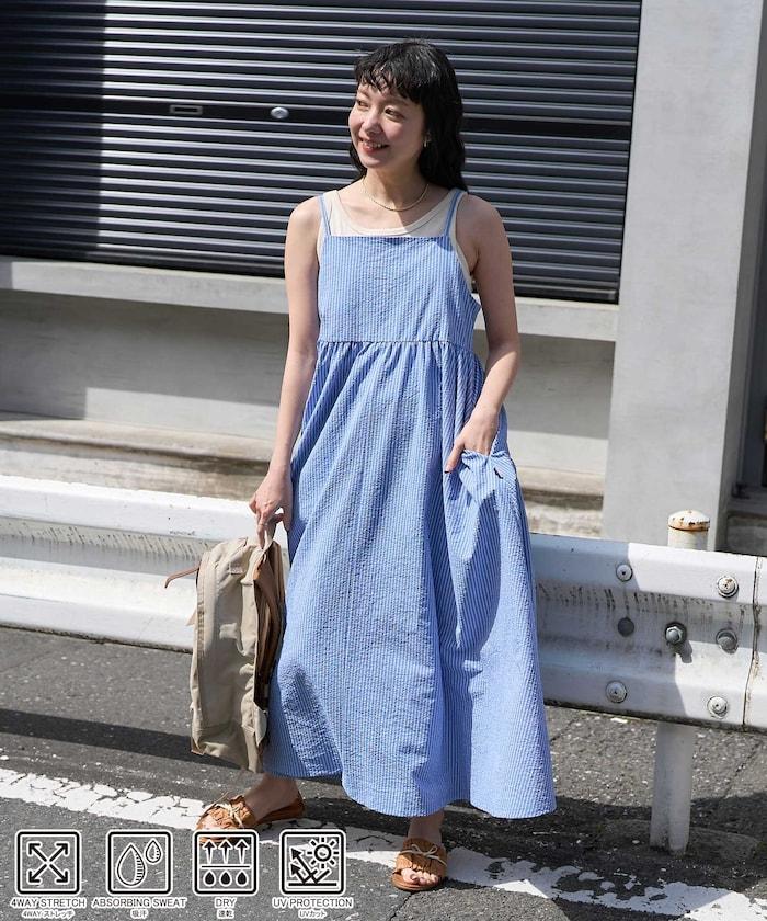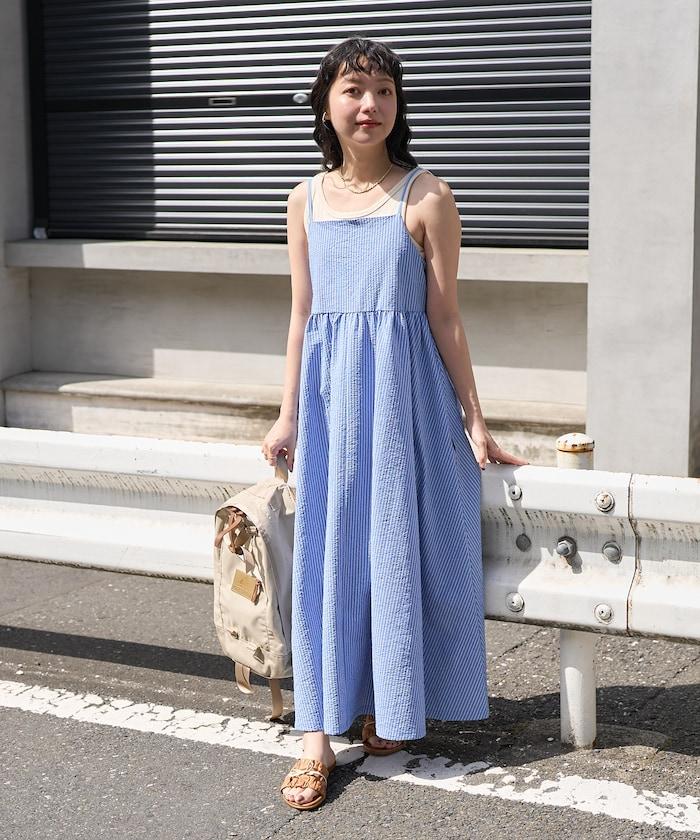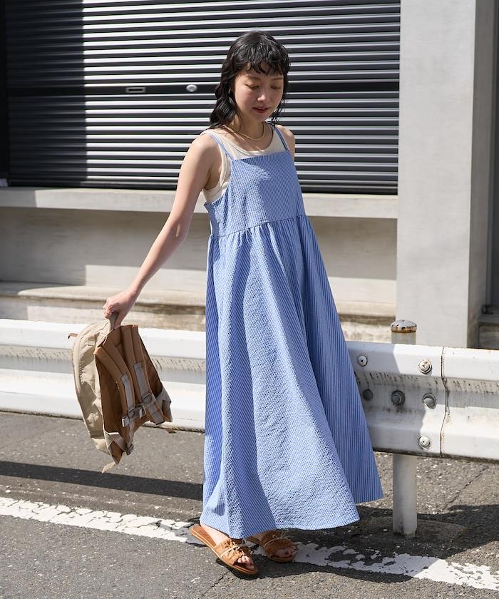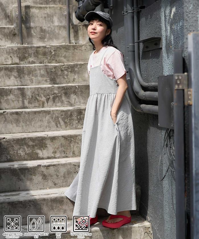 採用清涼的海魂衫面料的吊帶連衣裙。
