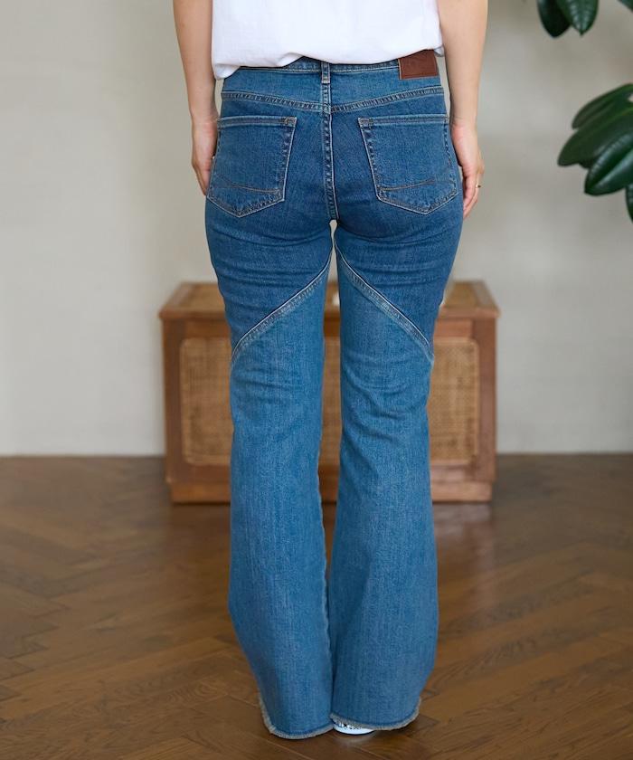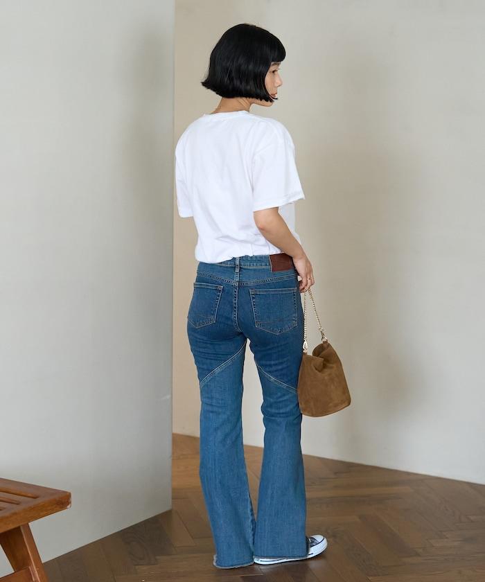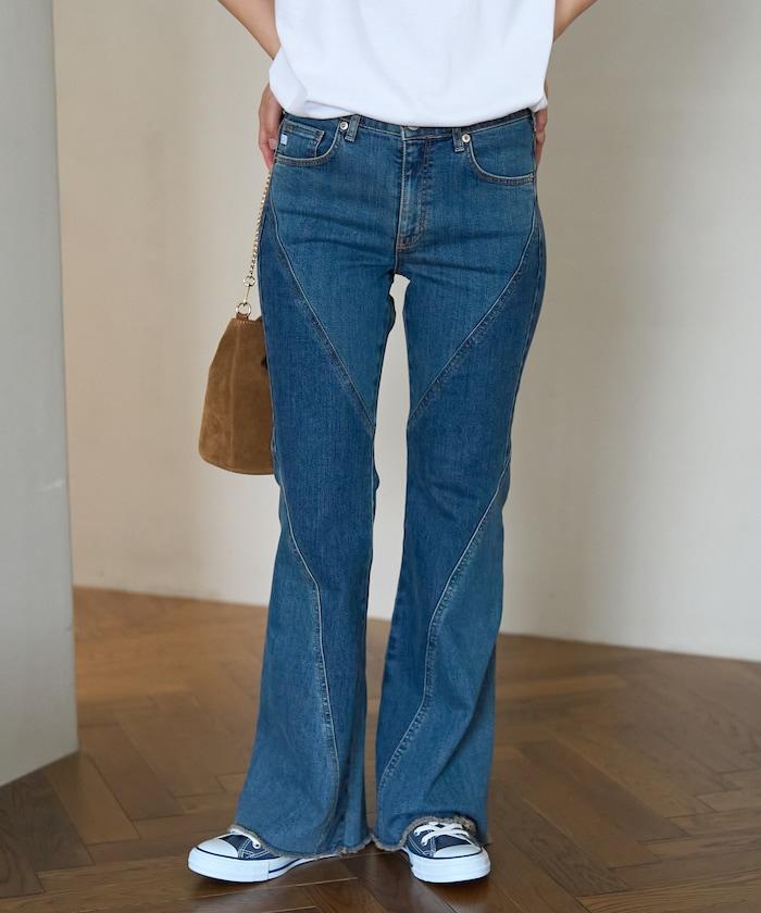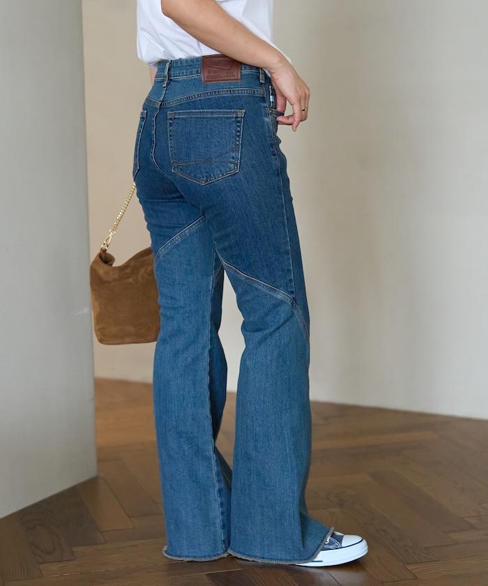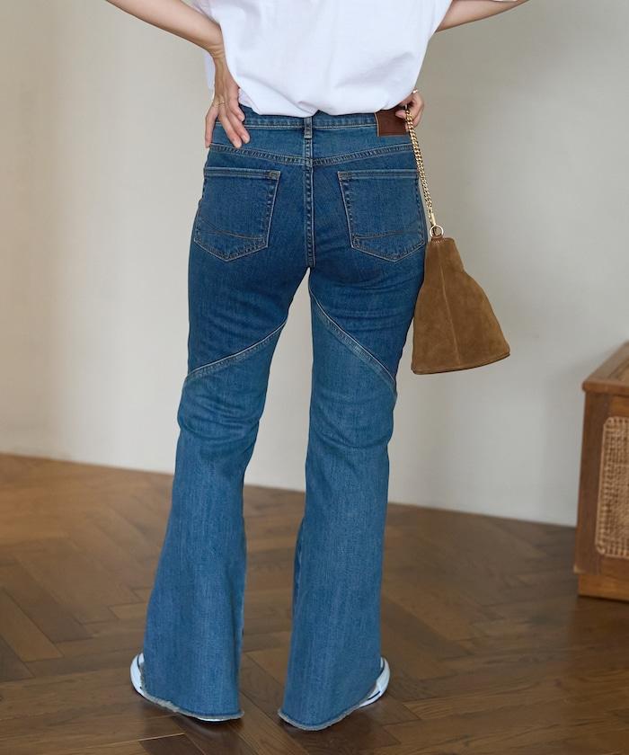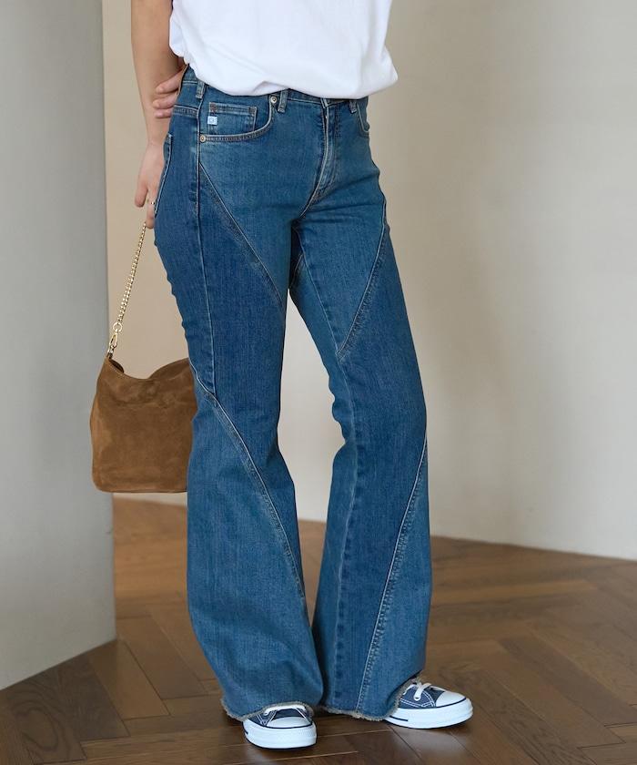 雙色喇叭牛仔褲,具有拉長腿部線條的效果和時尚外觀。