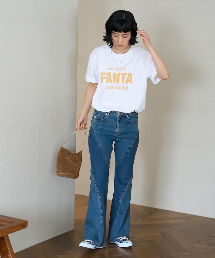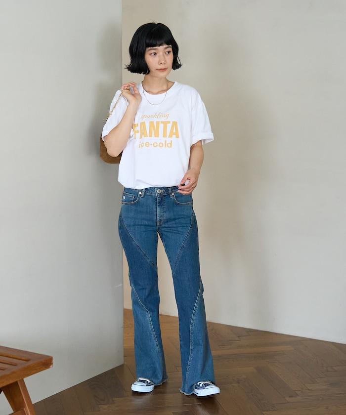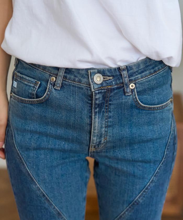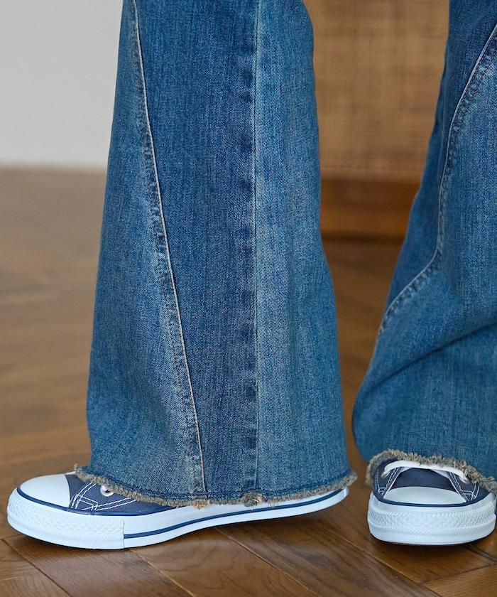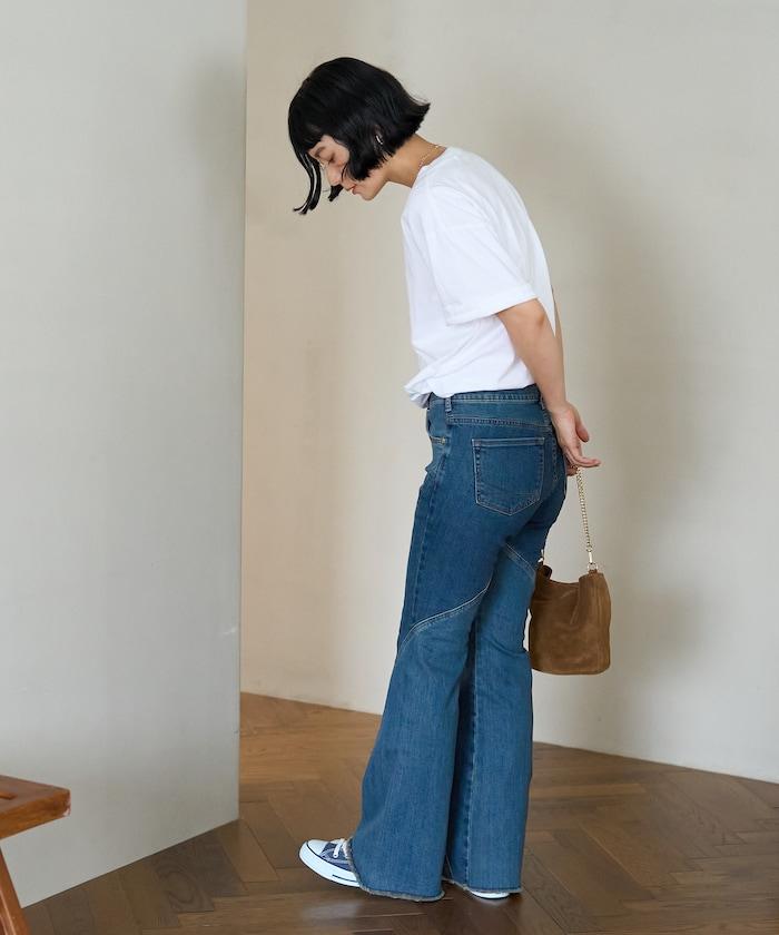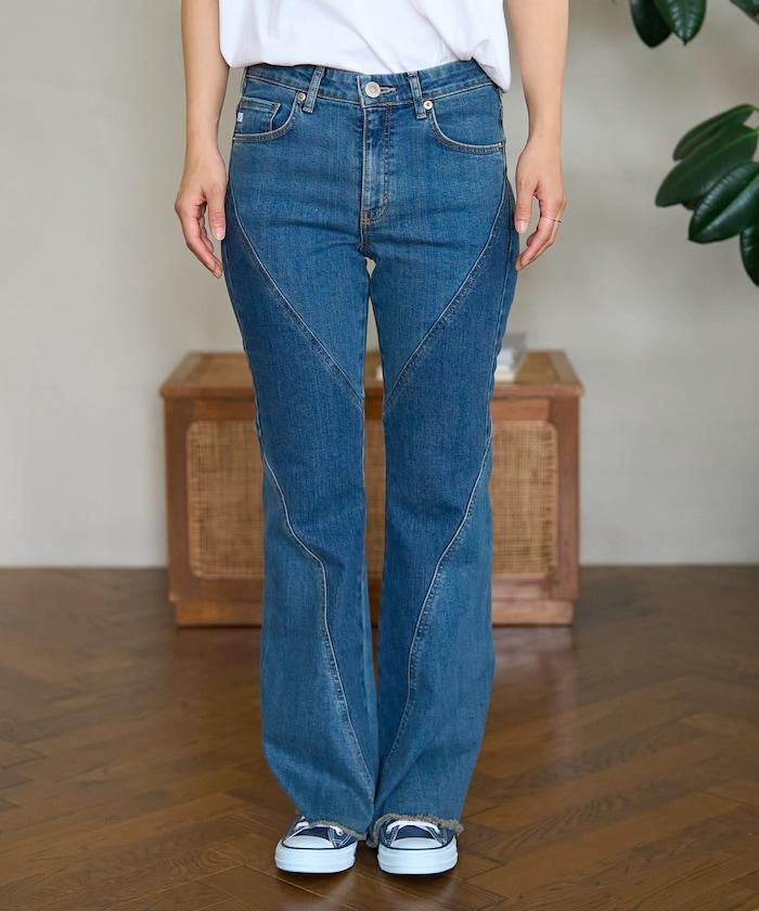 雙色喇叭牛仔褲,具有拉長腿部線條的效果和時尚外觀。