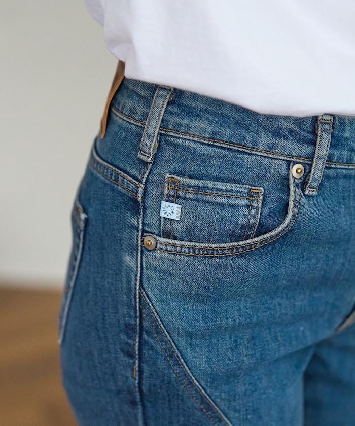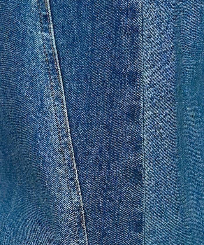 通過將兩種不同的牛仔面料縫合在一起,形成了翻版設計。