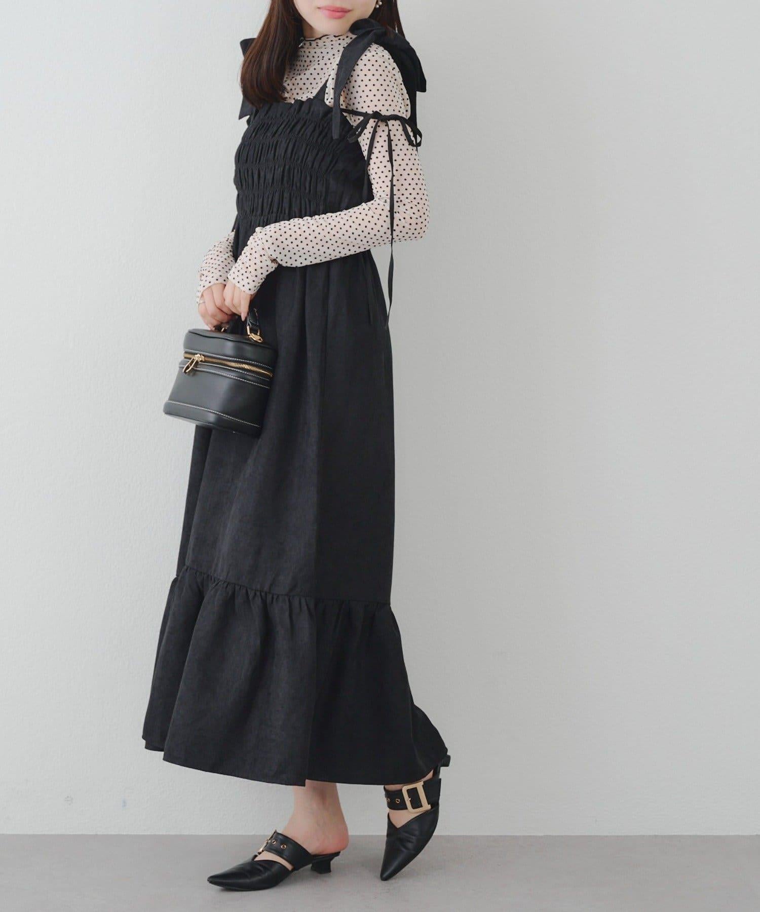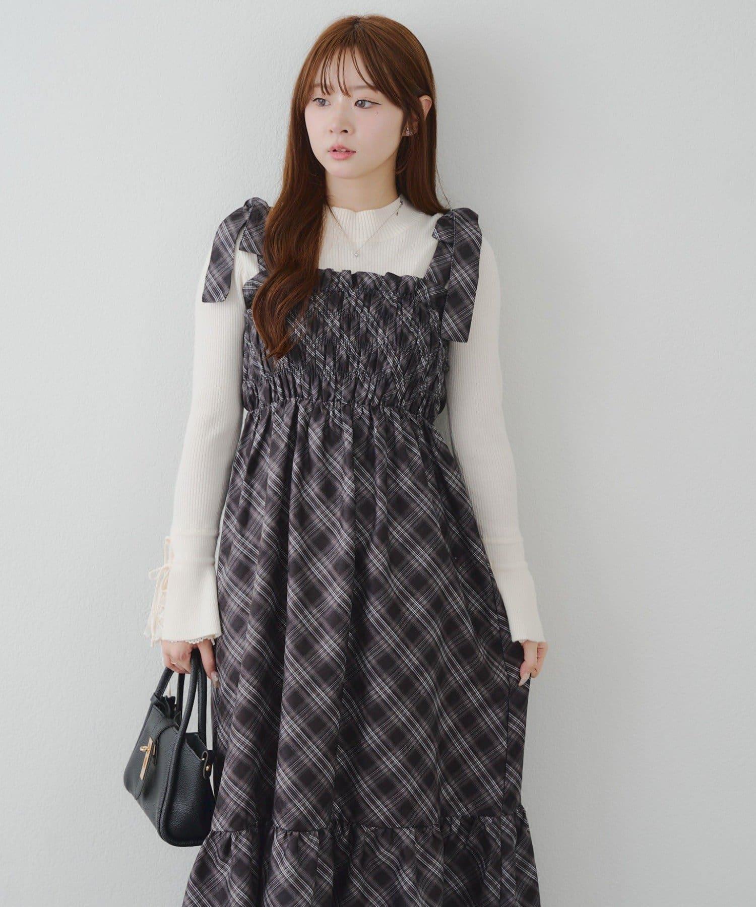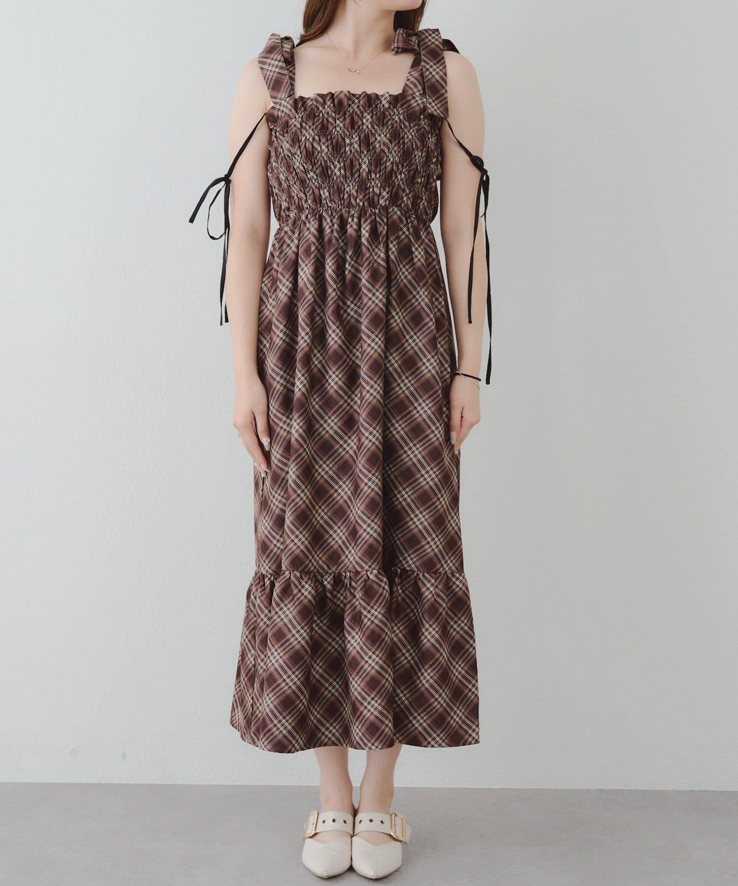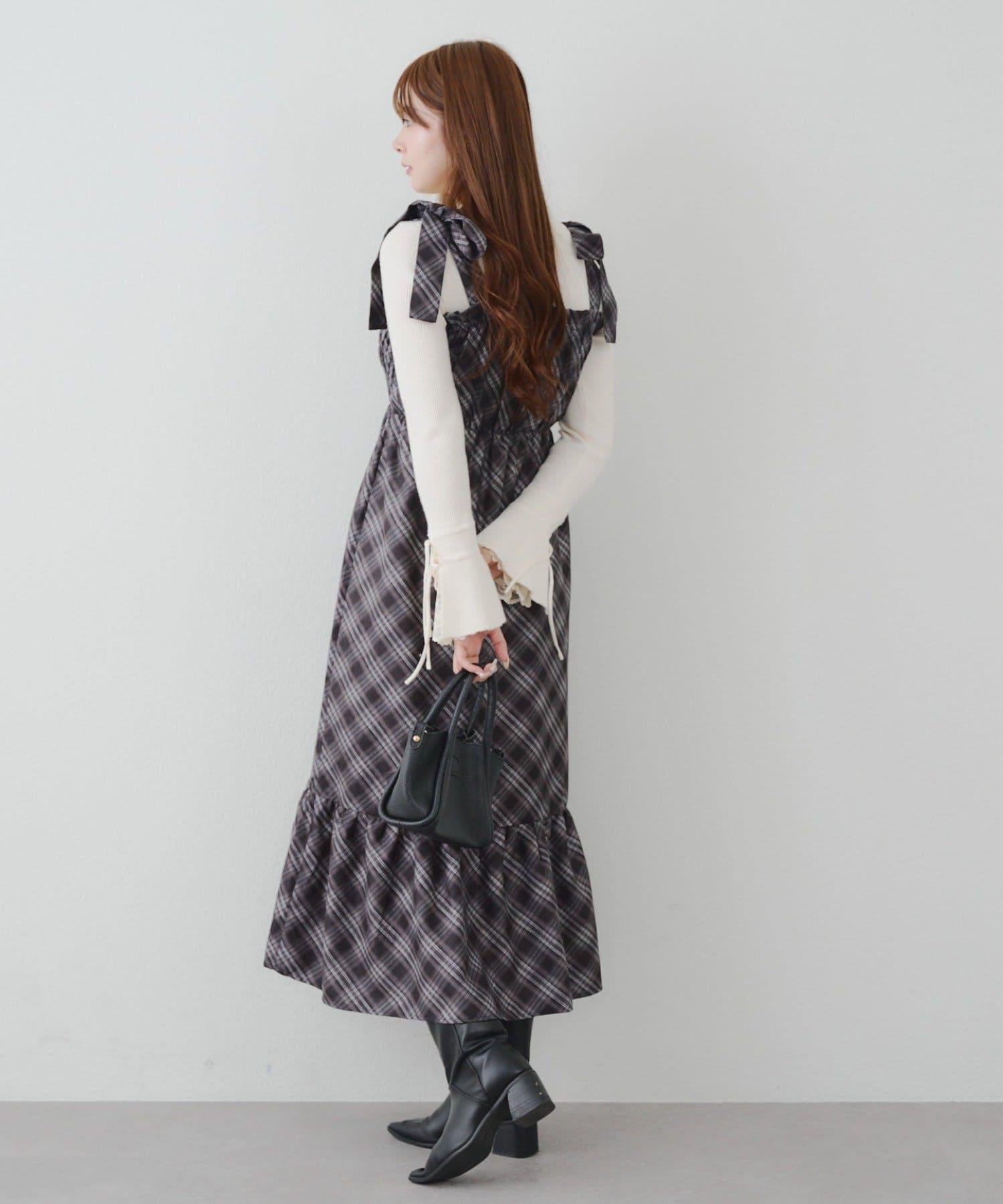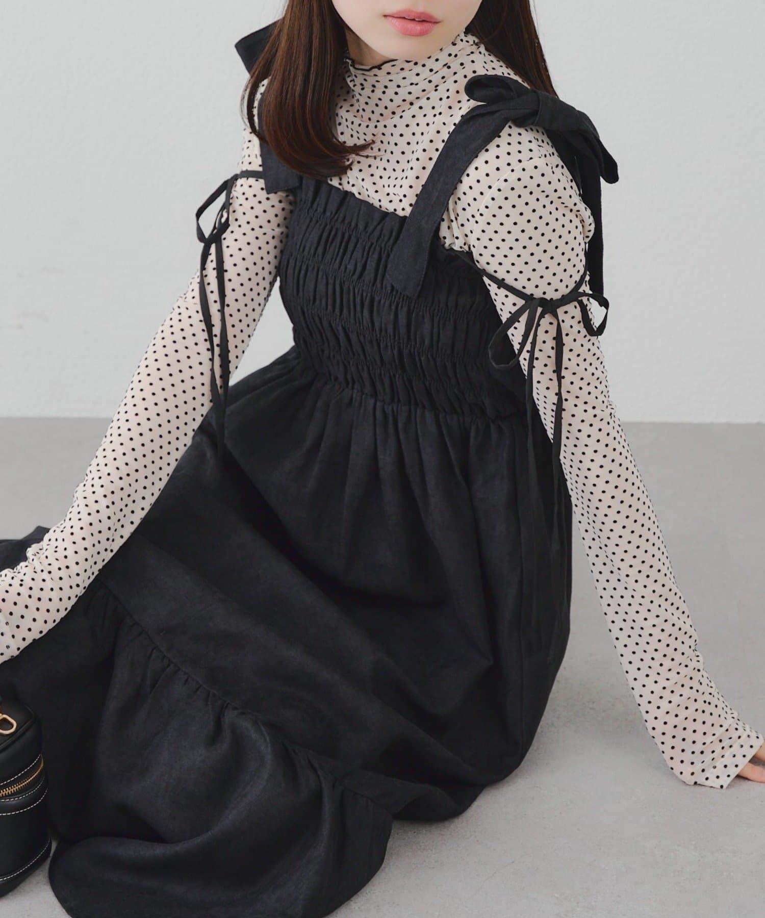 預約商品肩帶蝴蝶結褶皺連衣裙