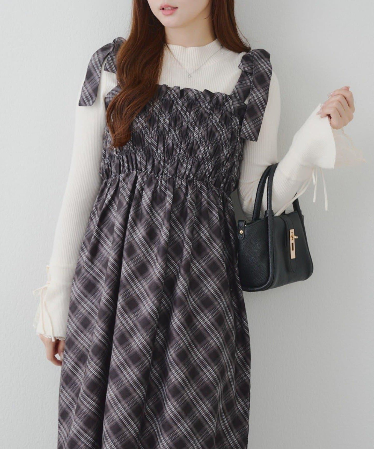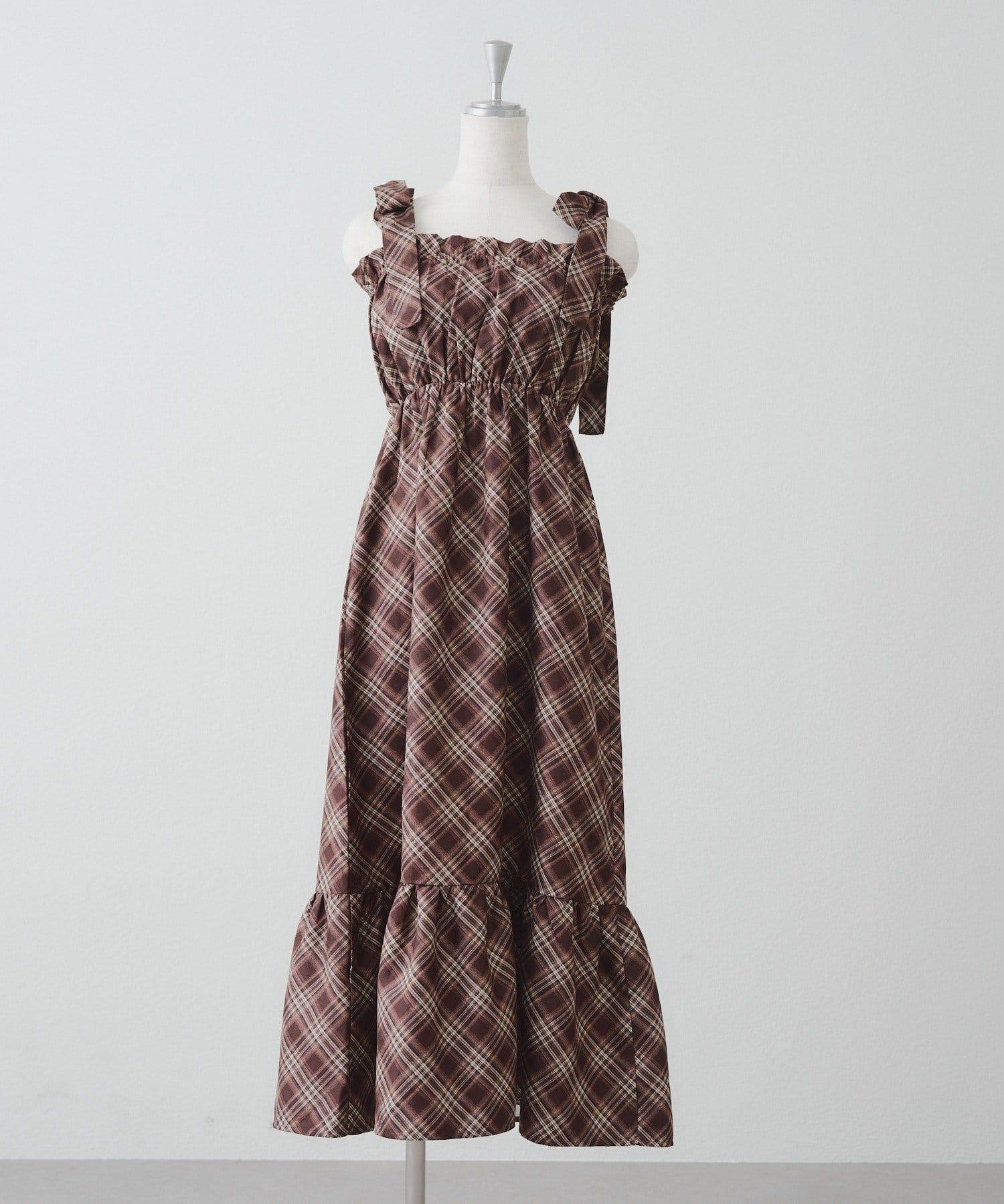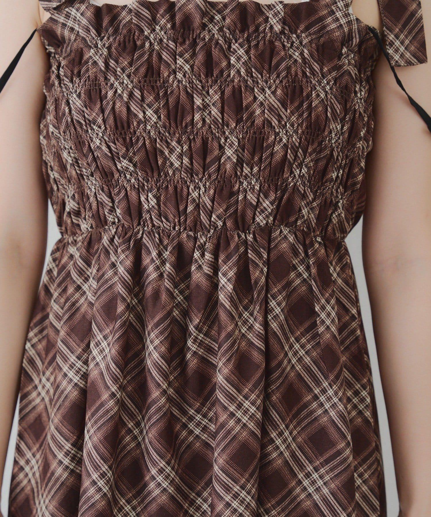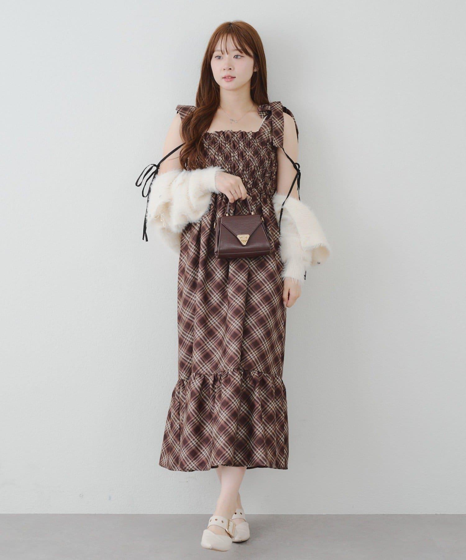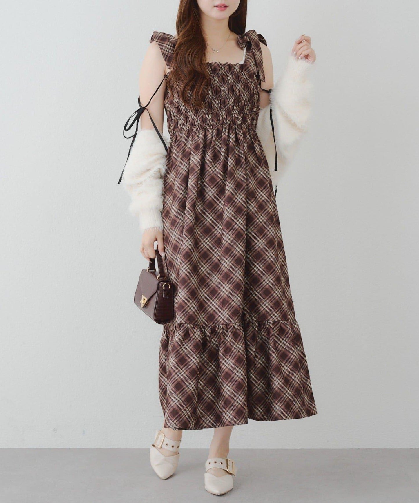 預約商品肩帶蝴蝶結褶皺連衣裙