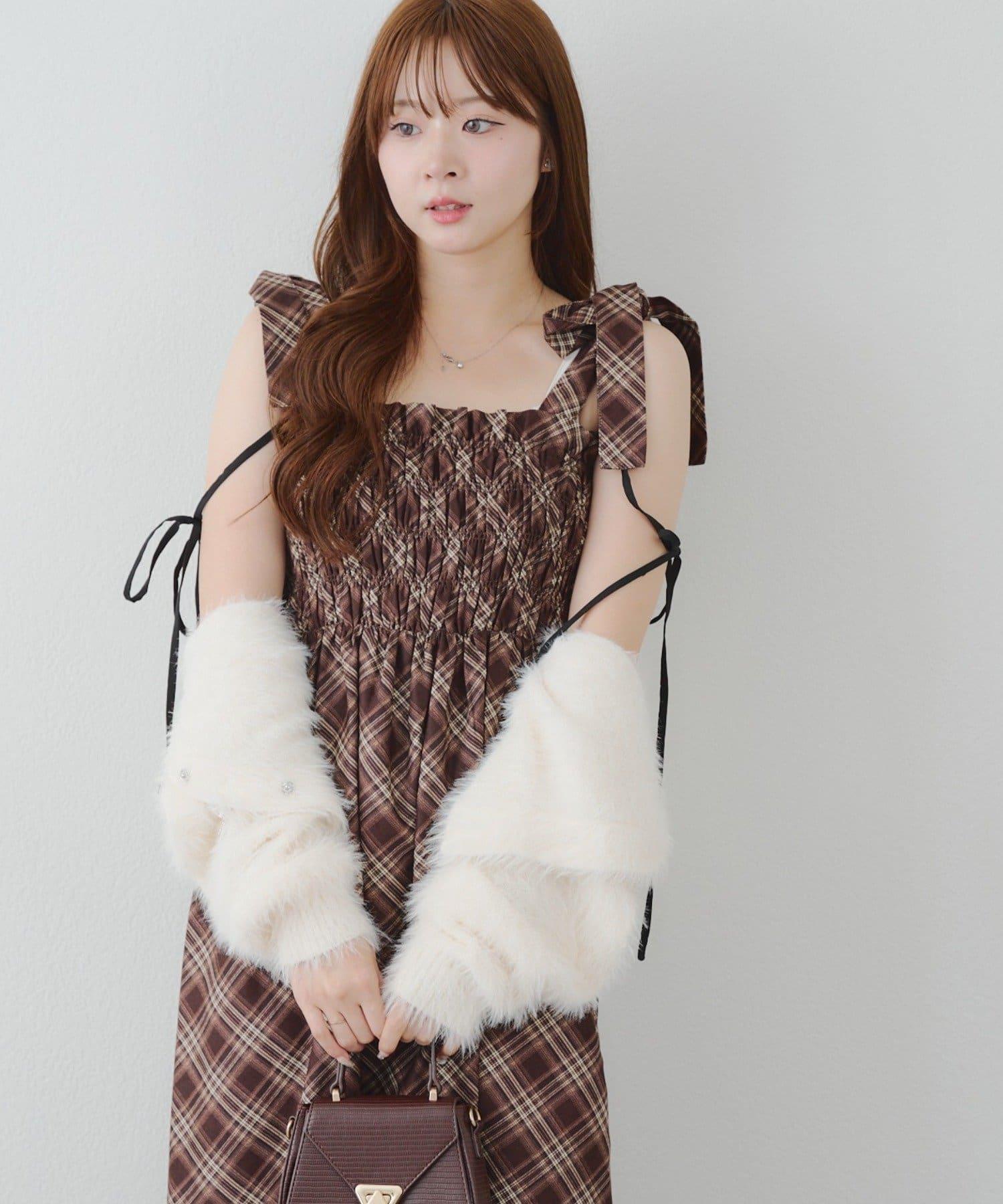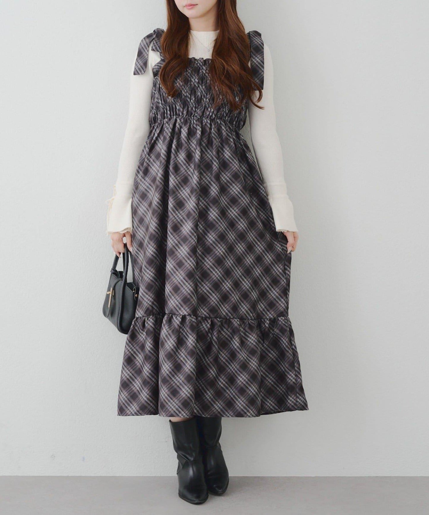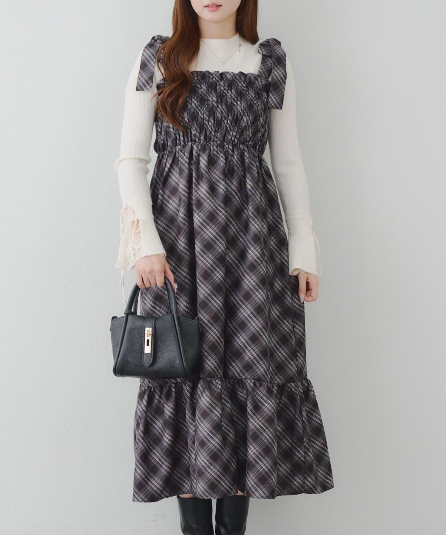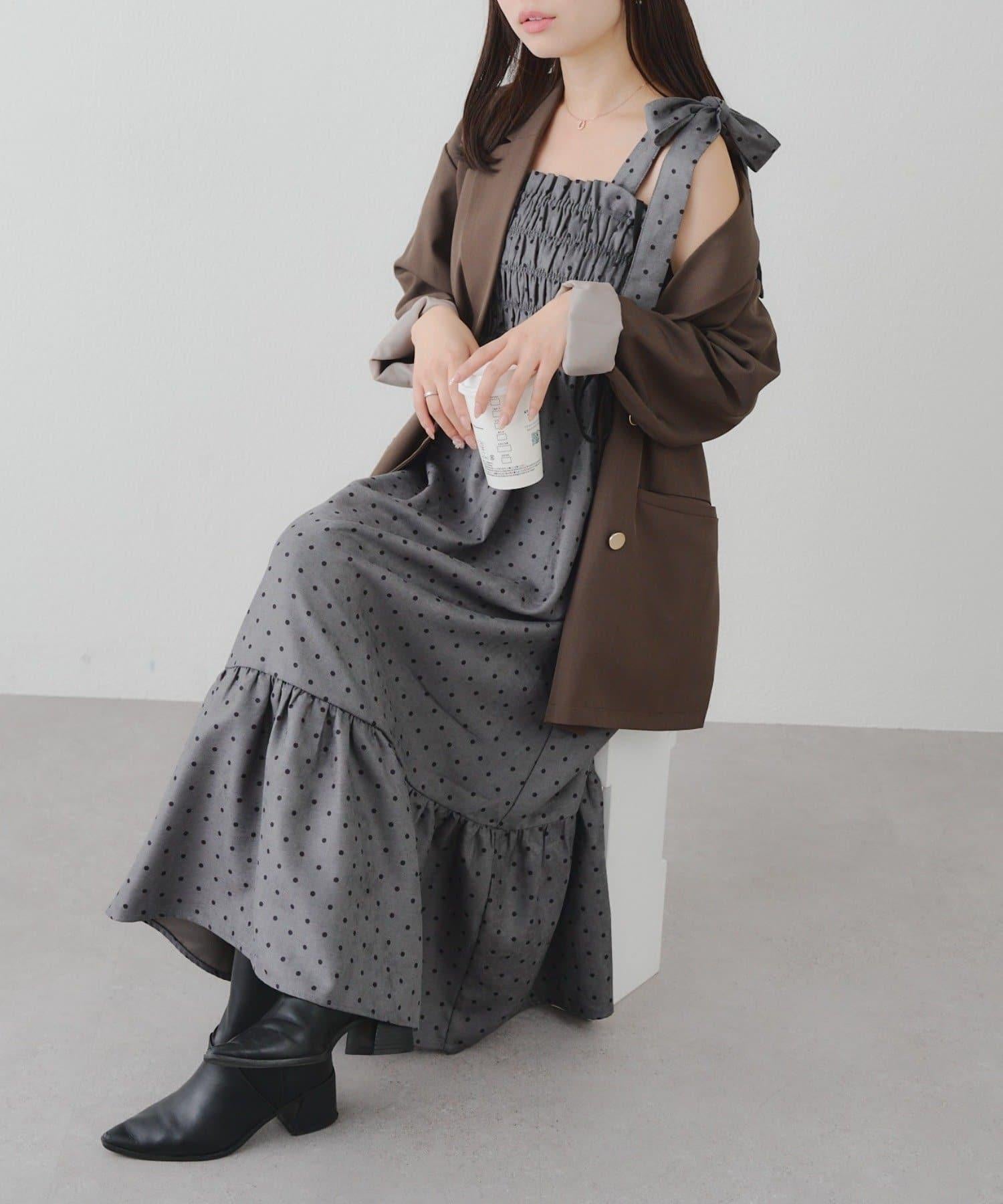 預約商品肩帶蝴蝶結褶皺連衣裙