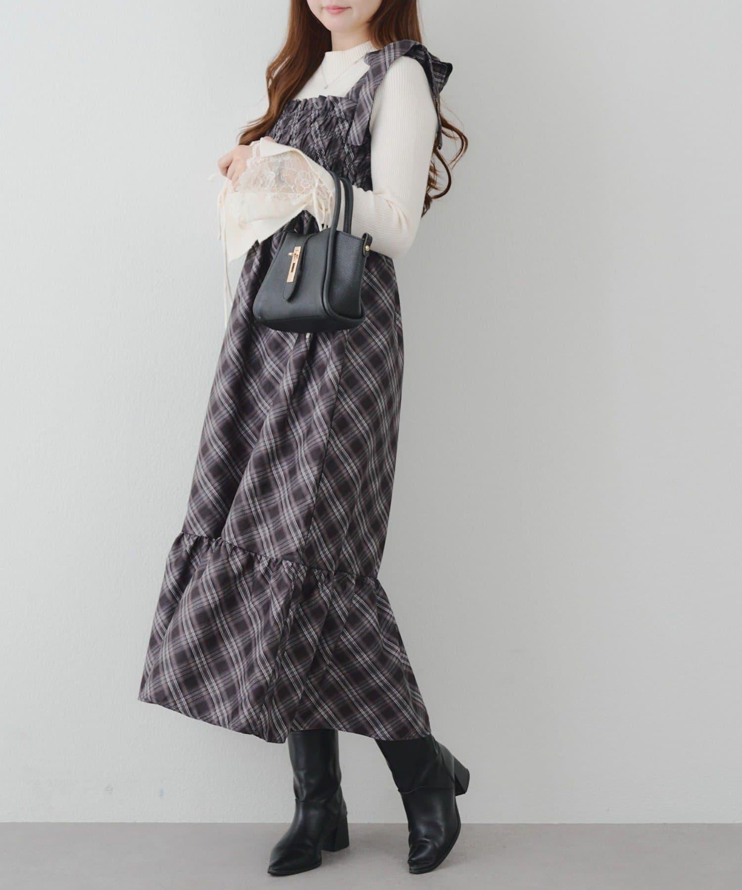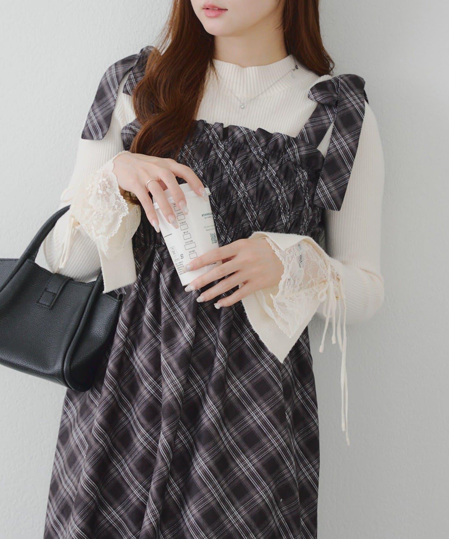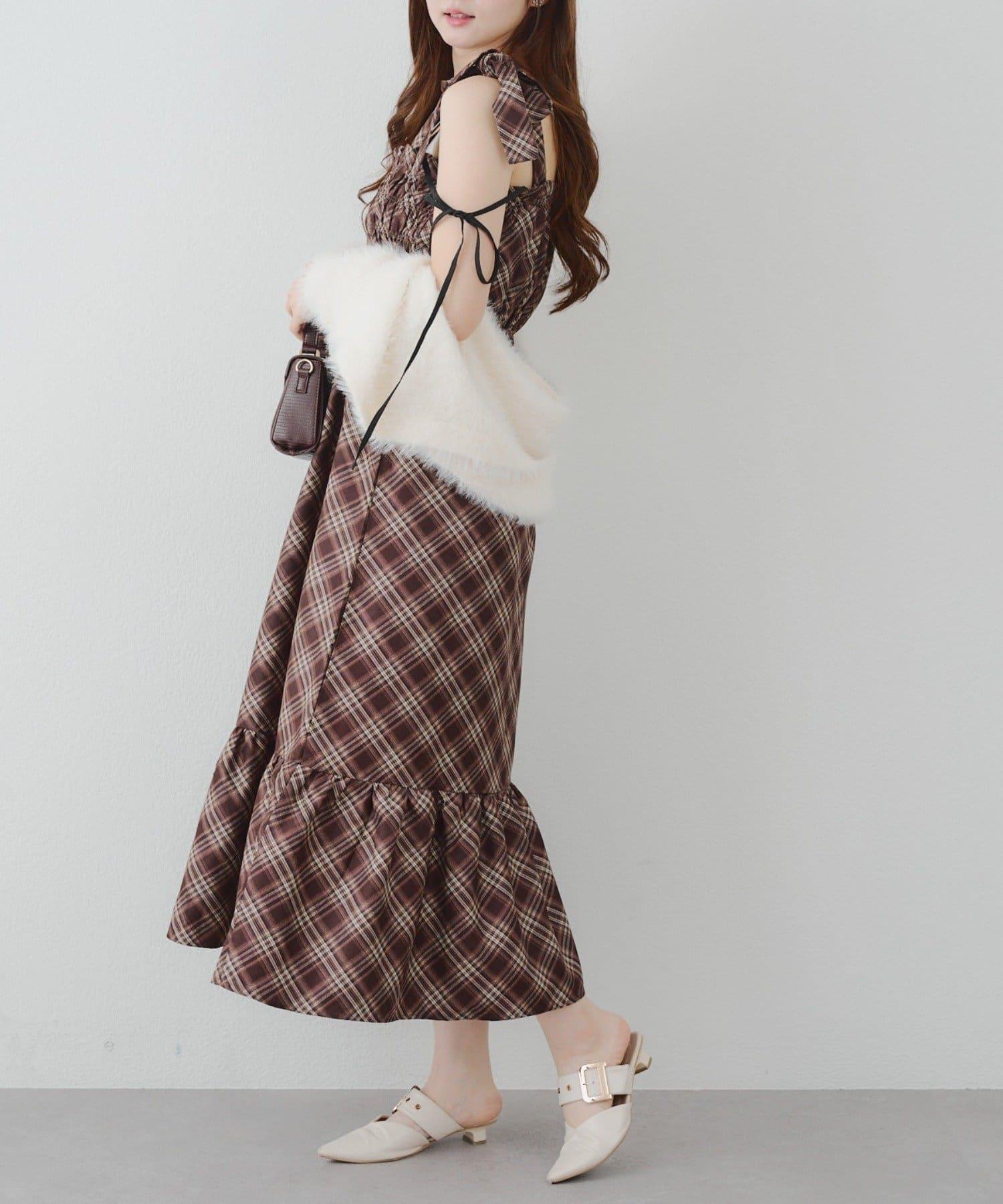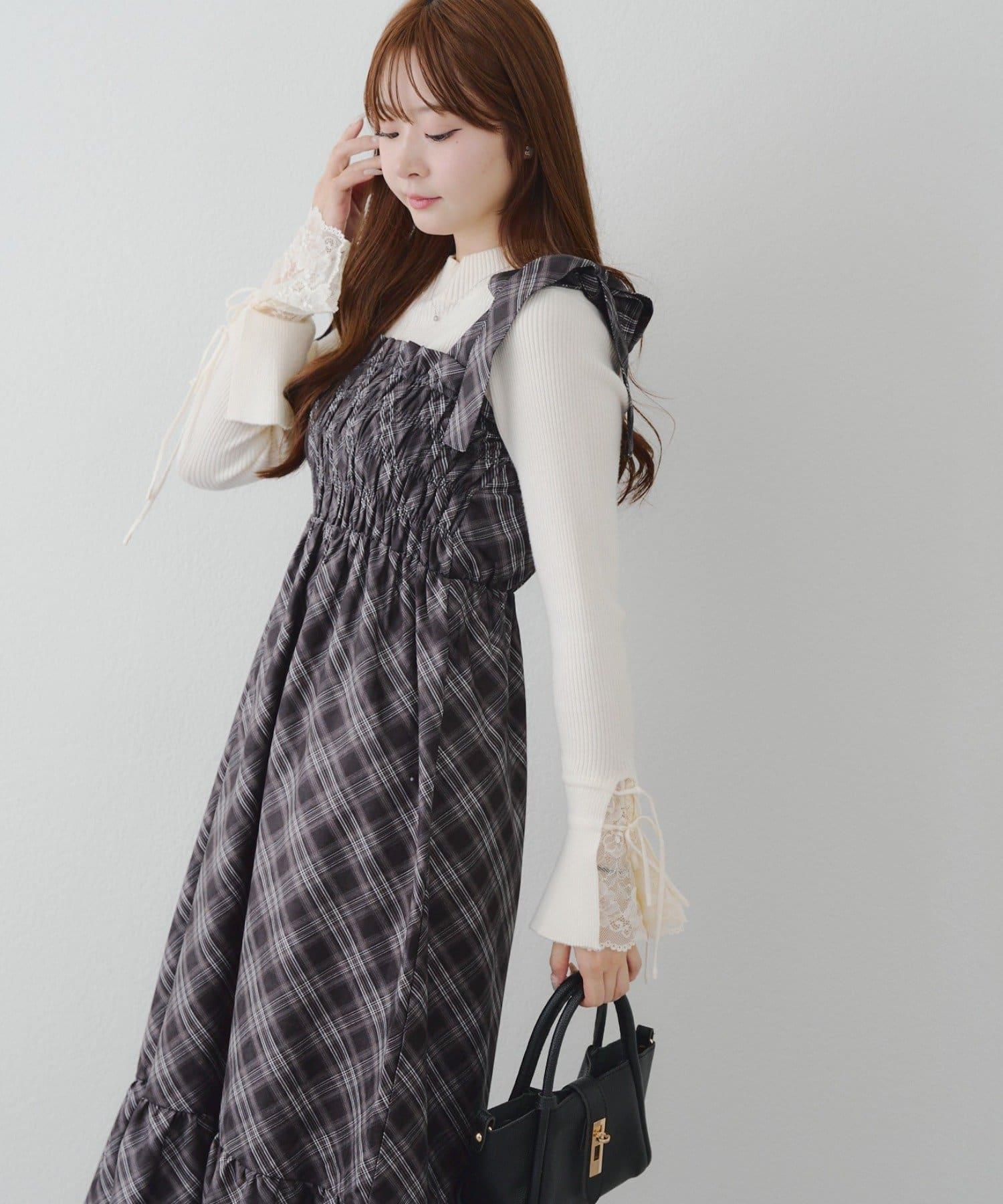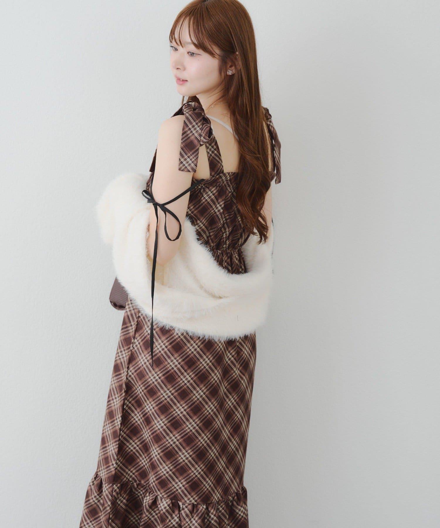 預約商品肩帶蝴蝶結褶皺連衣裙