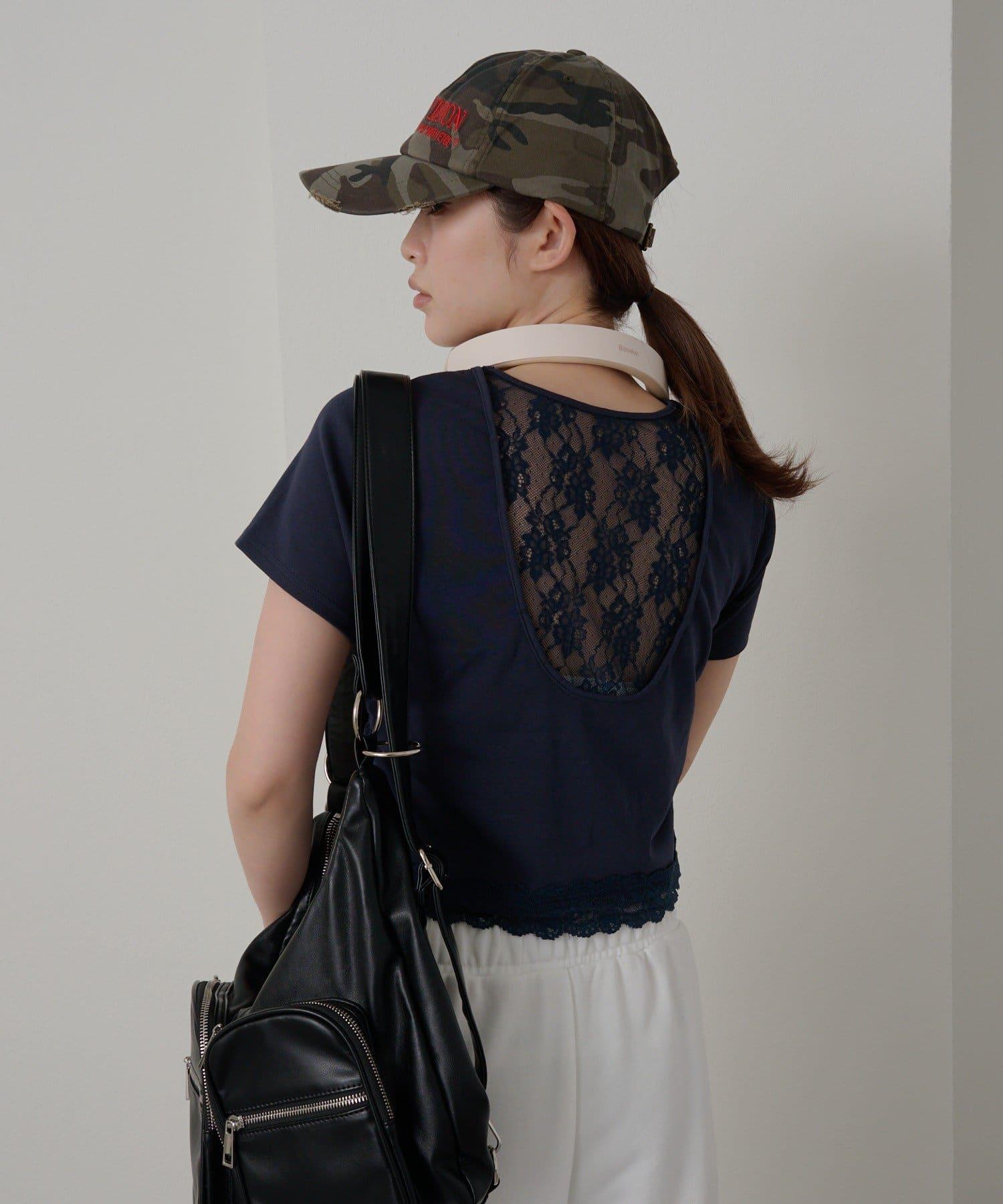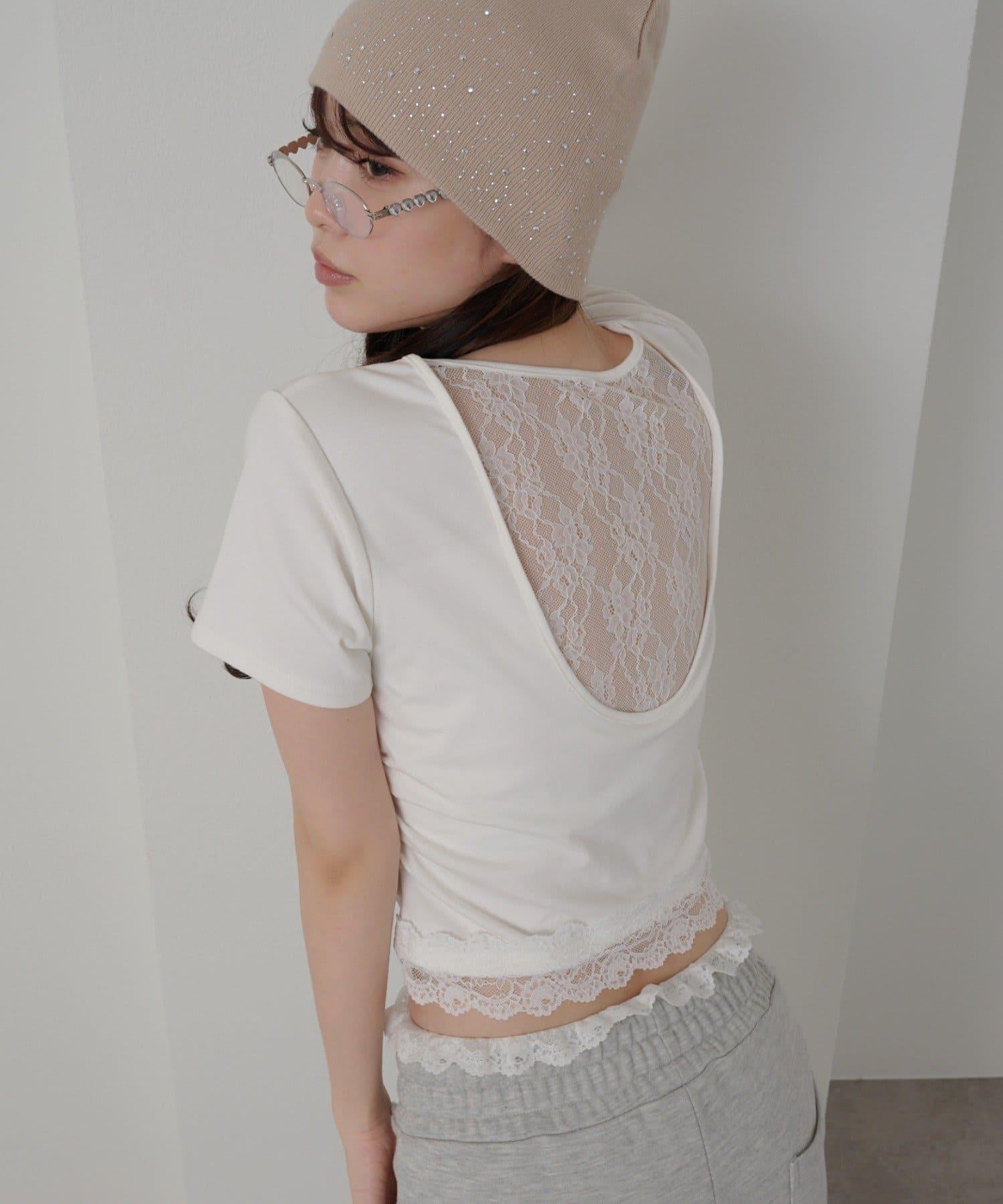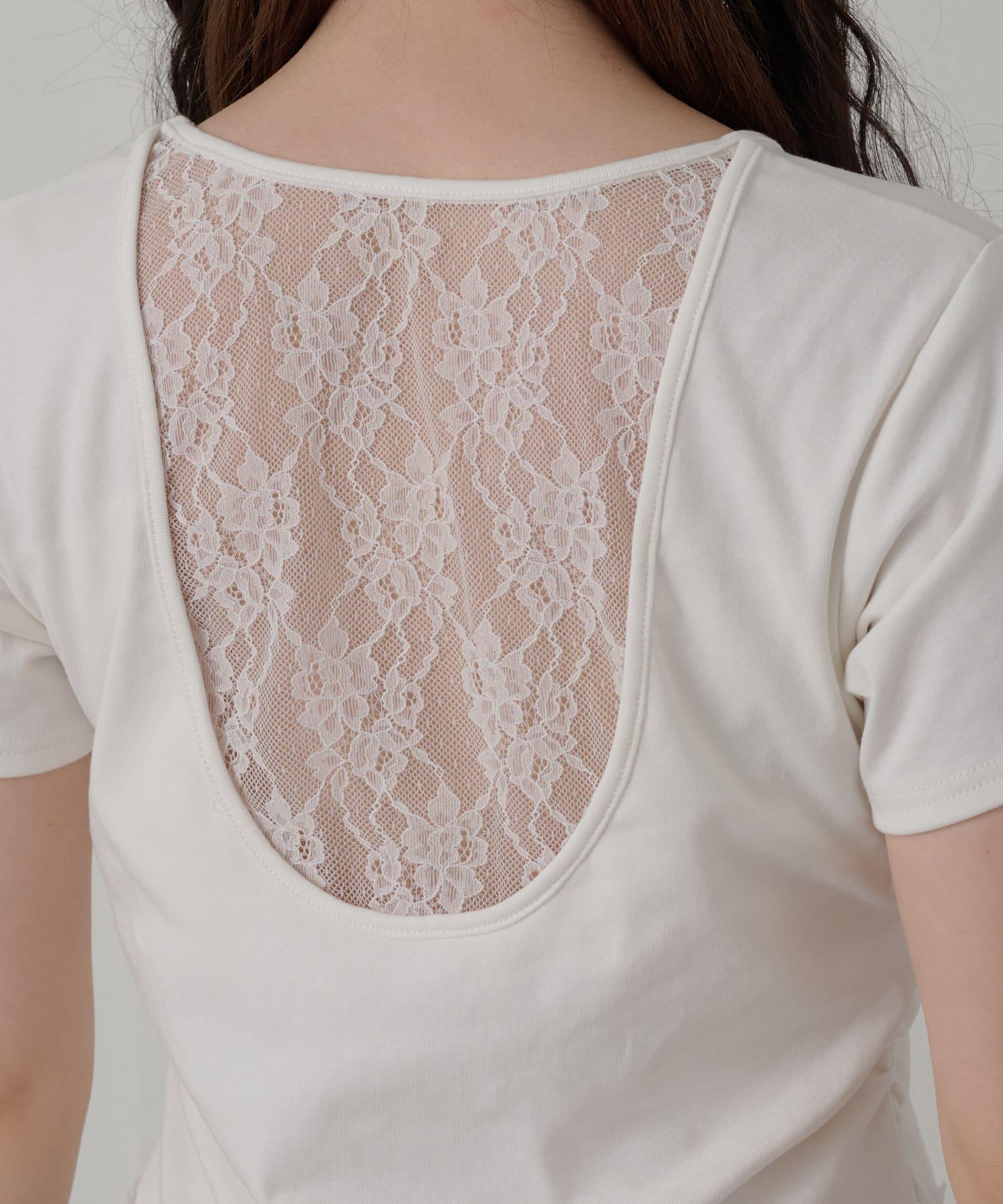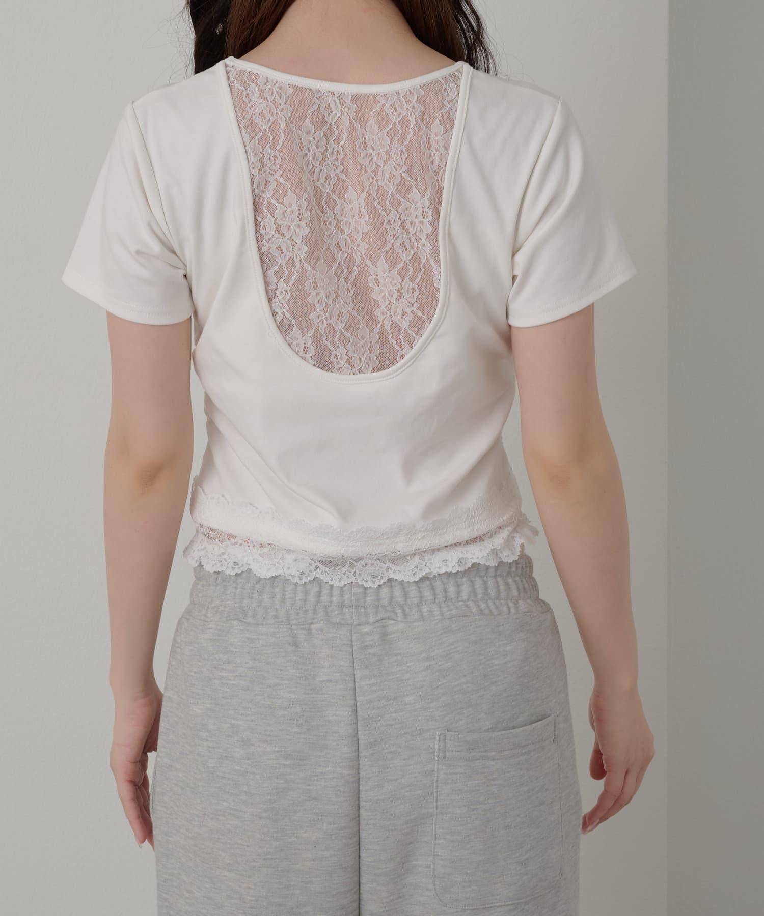 這是一款後背帶有蕾絲花邊的 T 恤,給人一種女性化的寬鬆感覺。