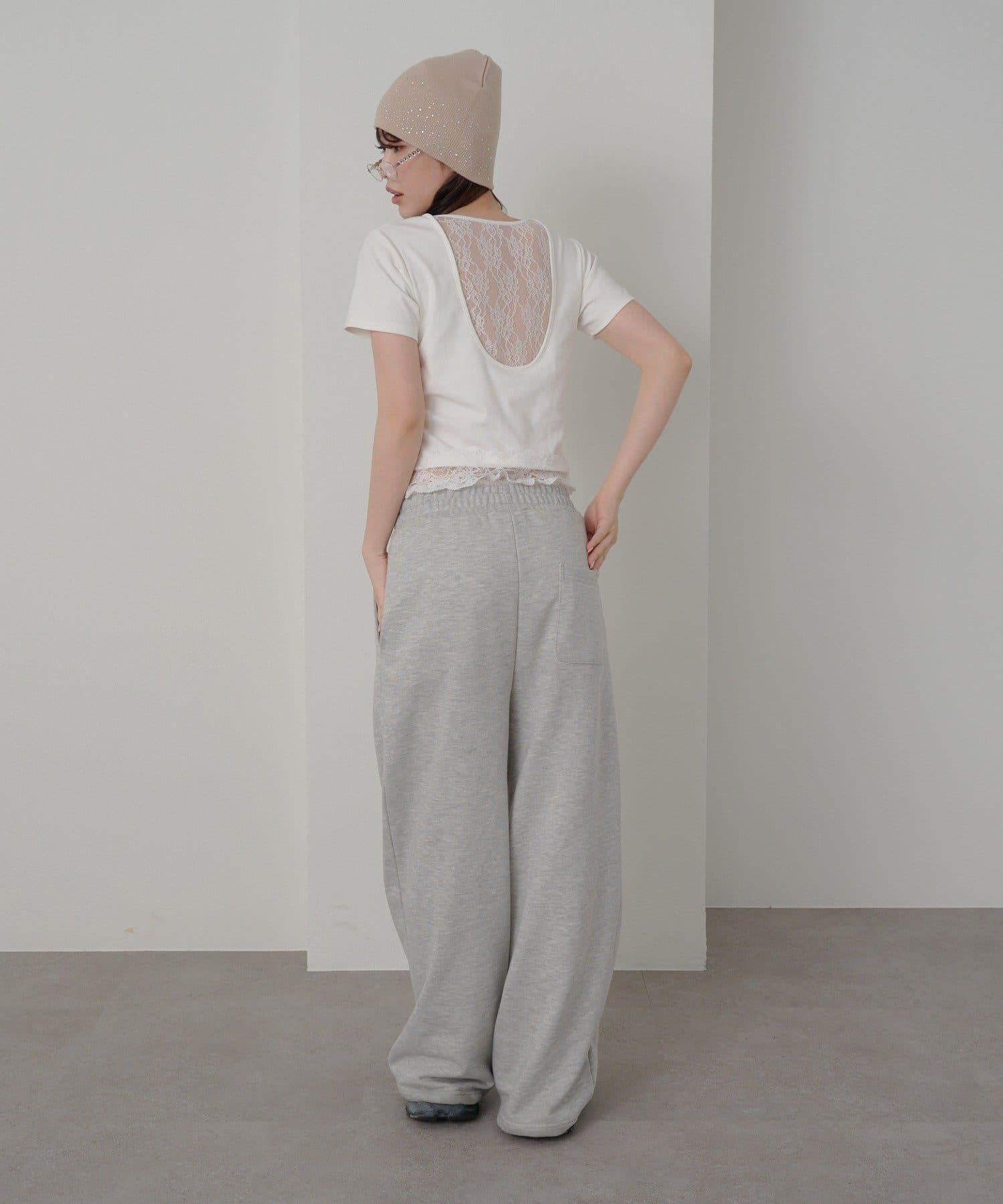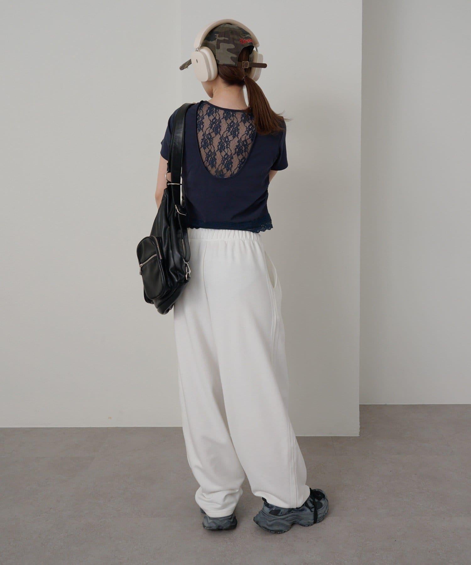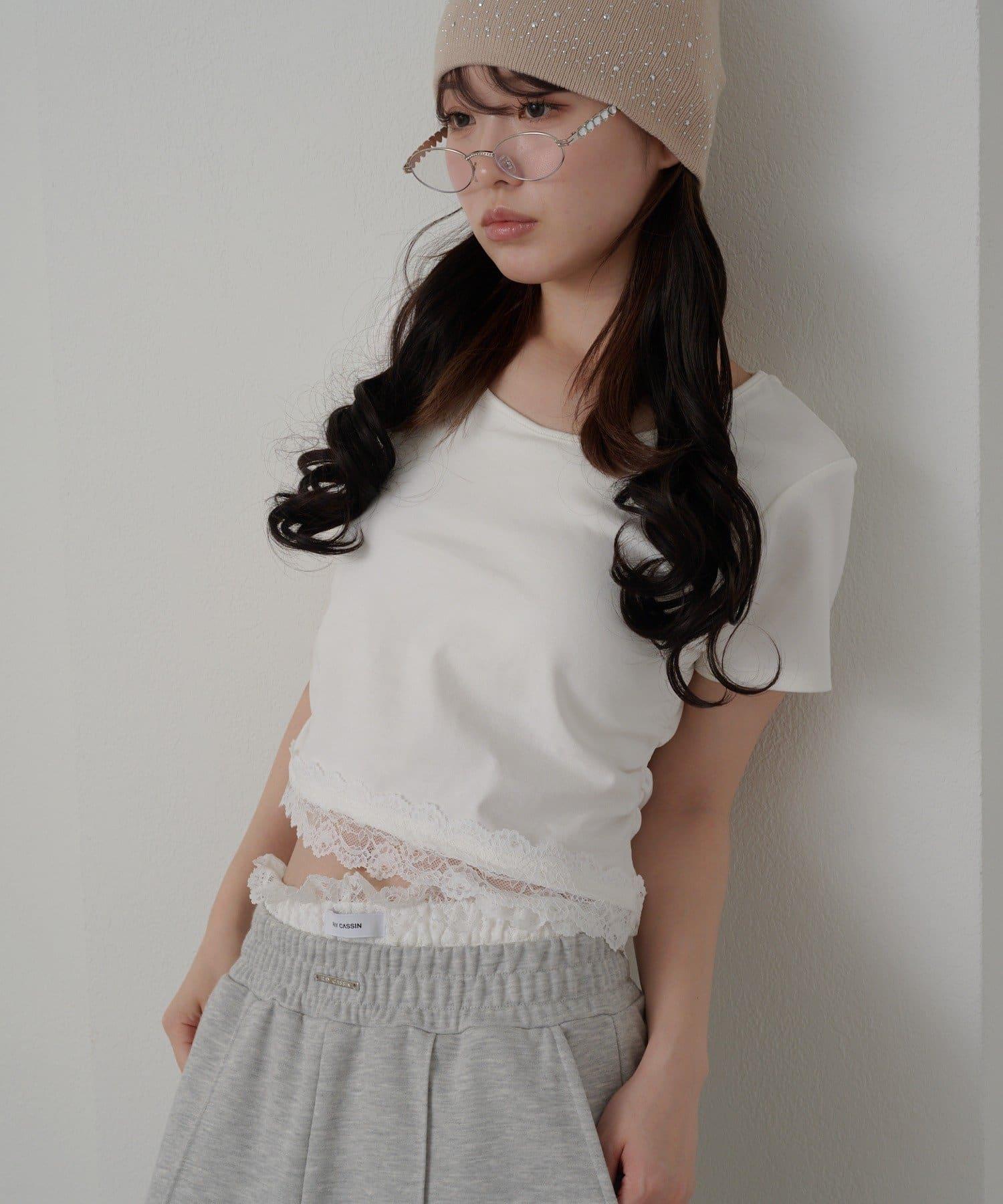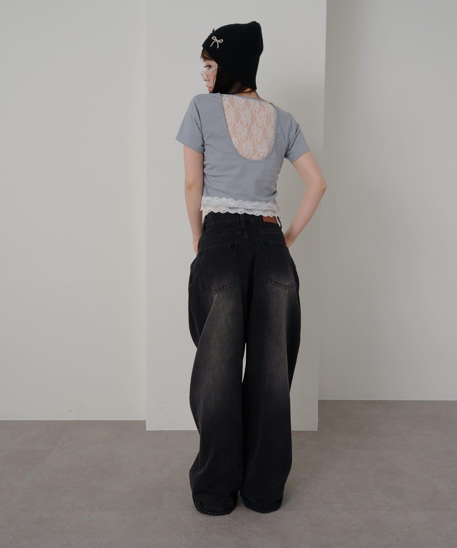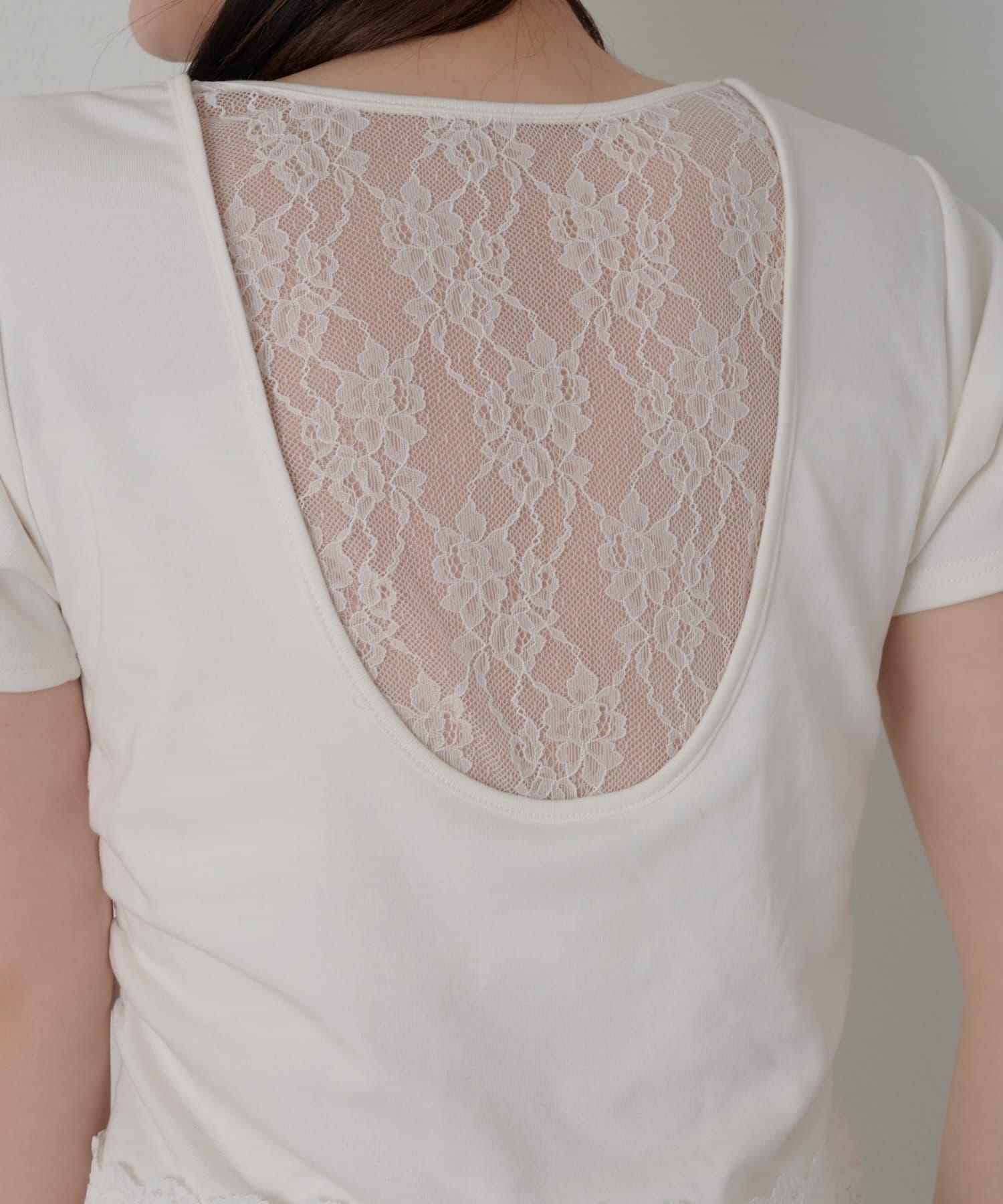 這是一款後背帶有蕾絲花邊的 T 恤,給人一種女性化的寬鬆感覺。
