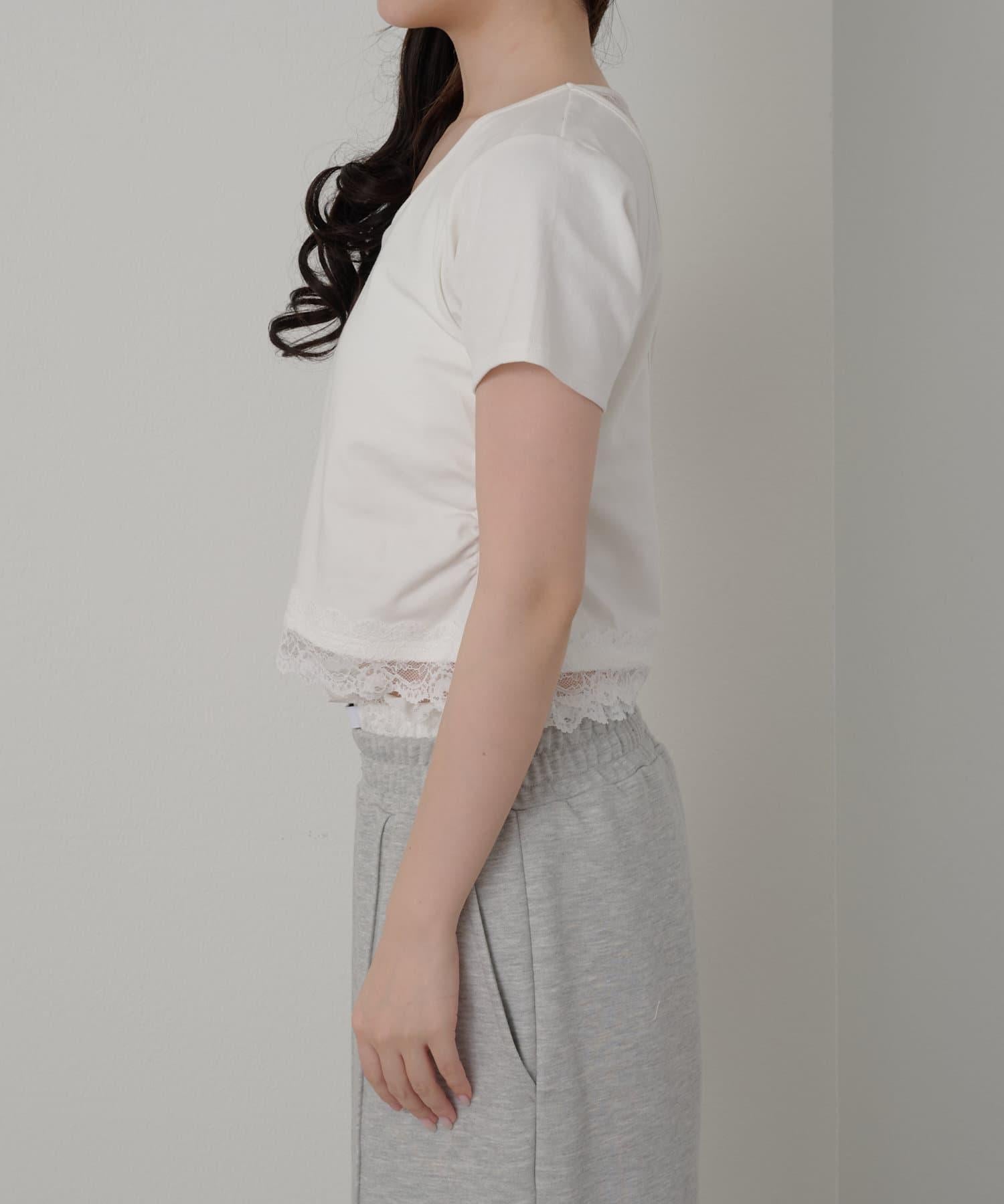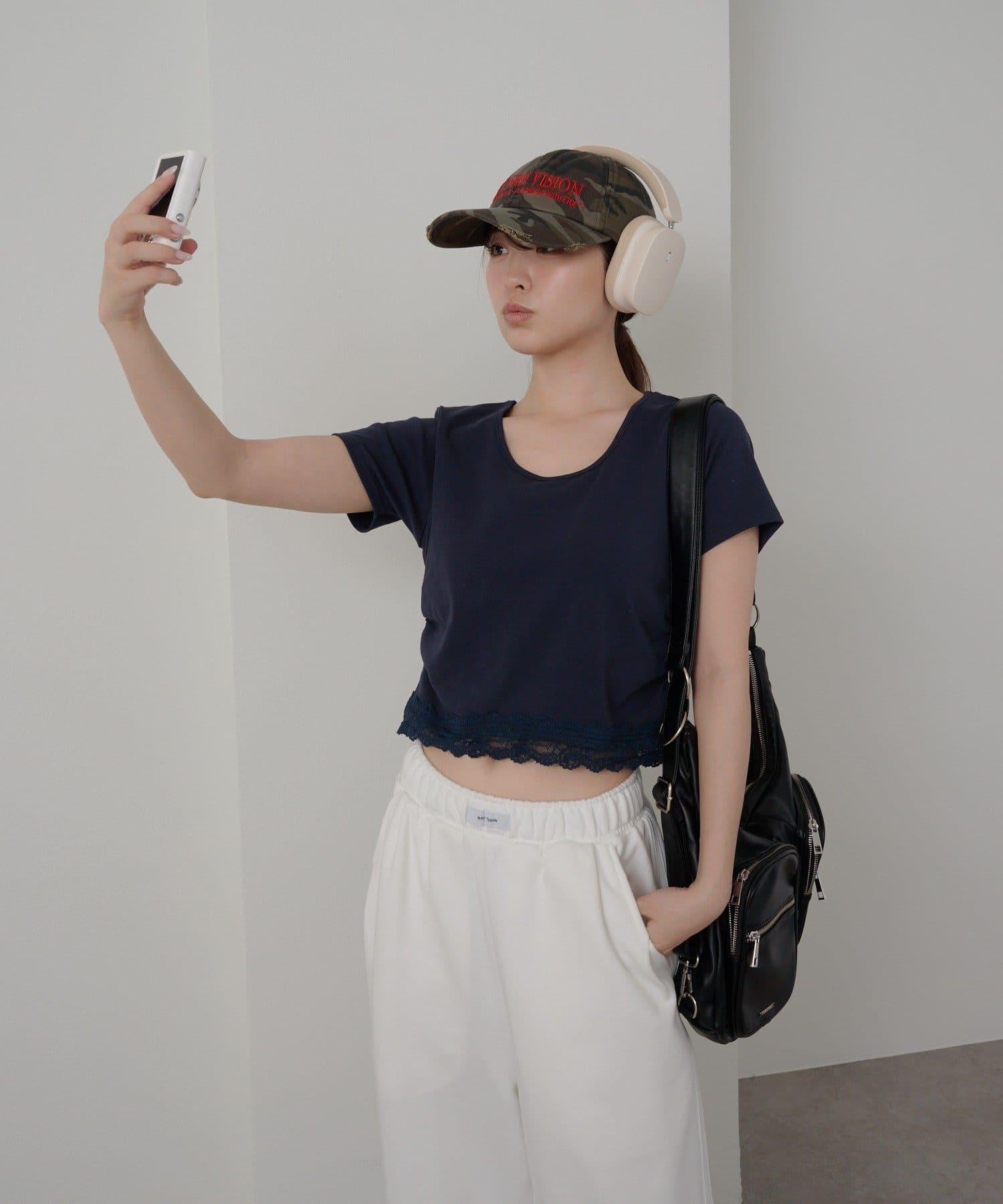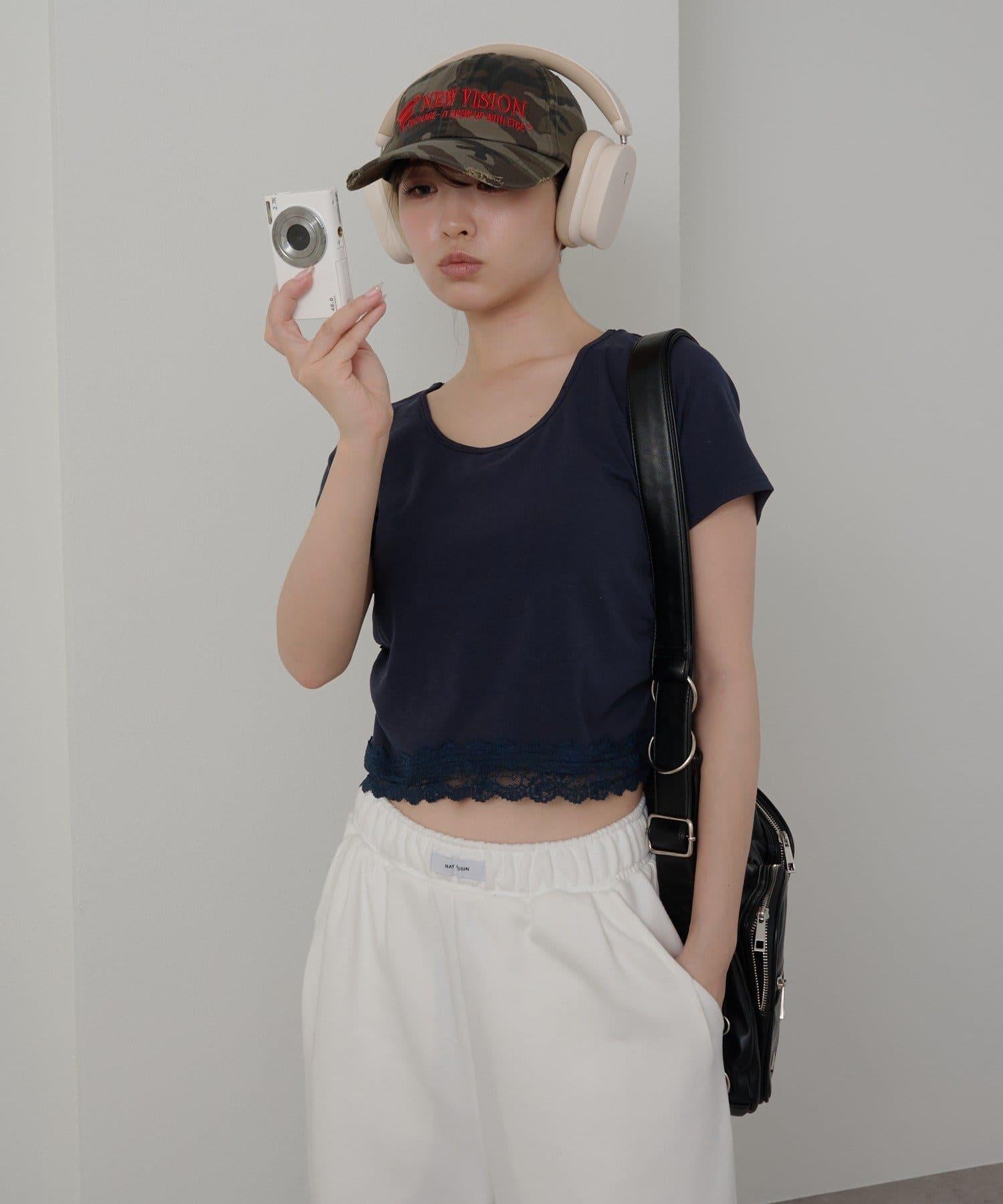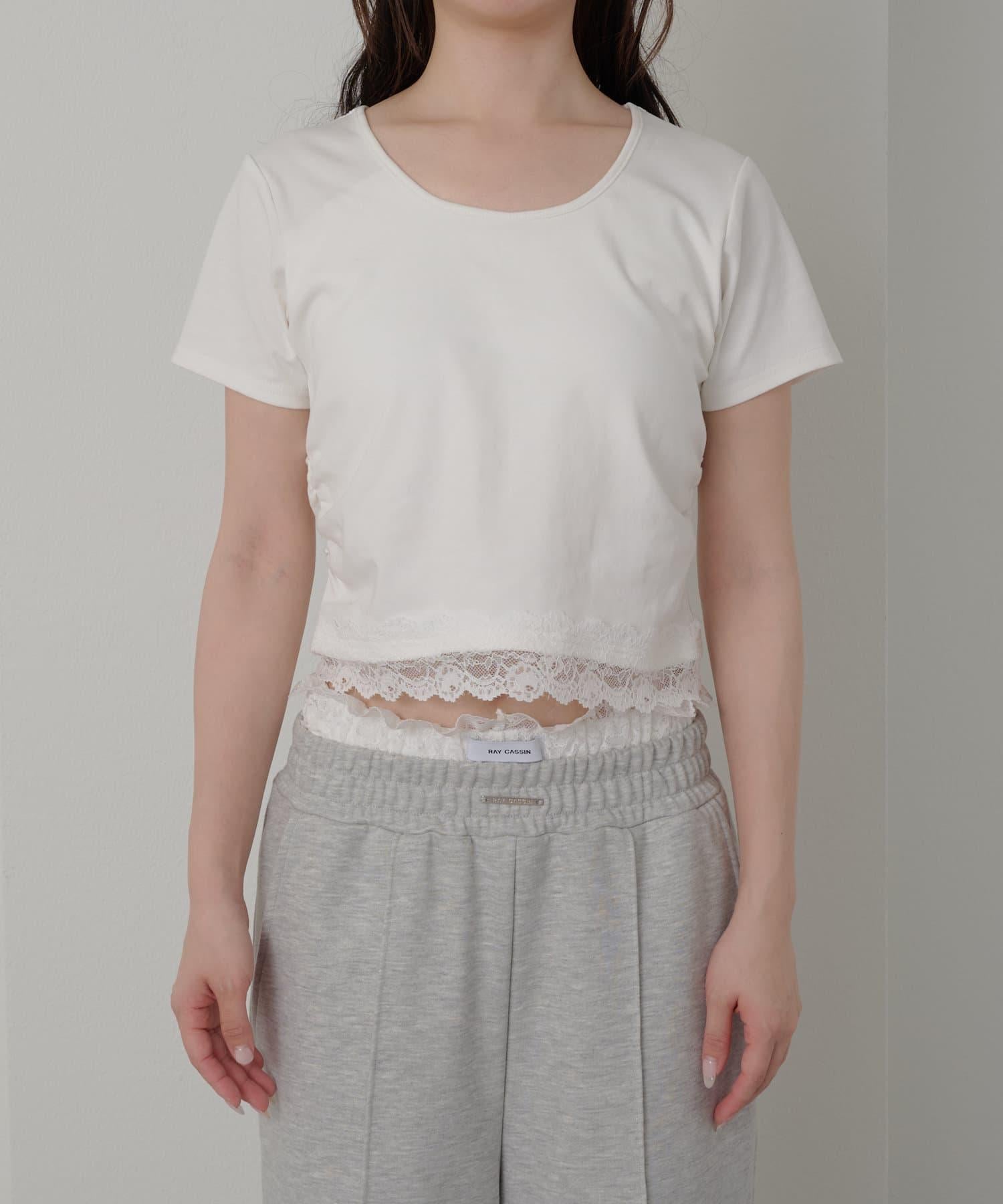 這是一款後背帶有蕾絲花邊的 T 恤,給人一種女性化的寬鬆感覺。