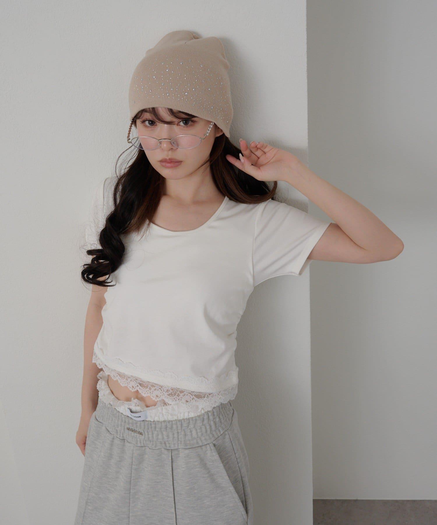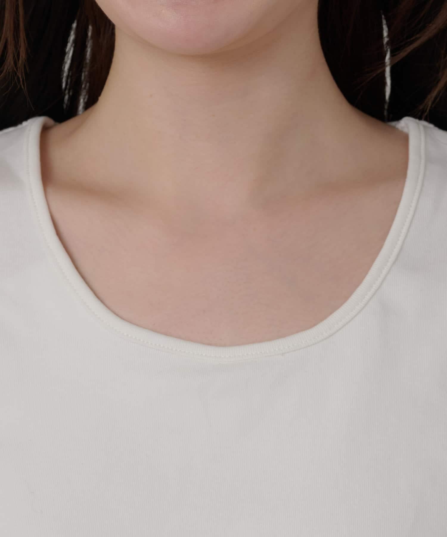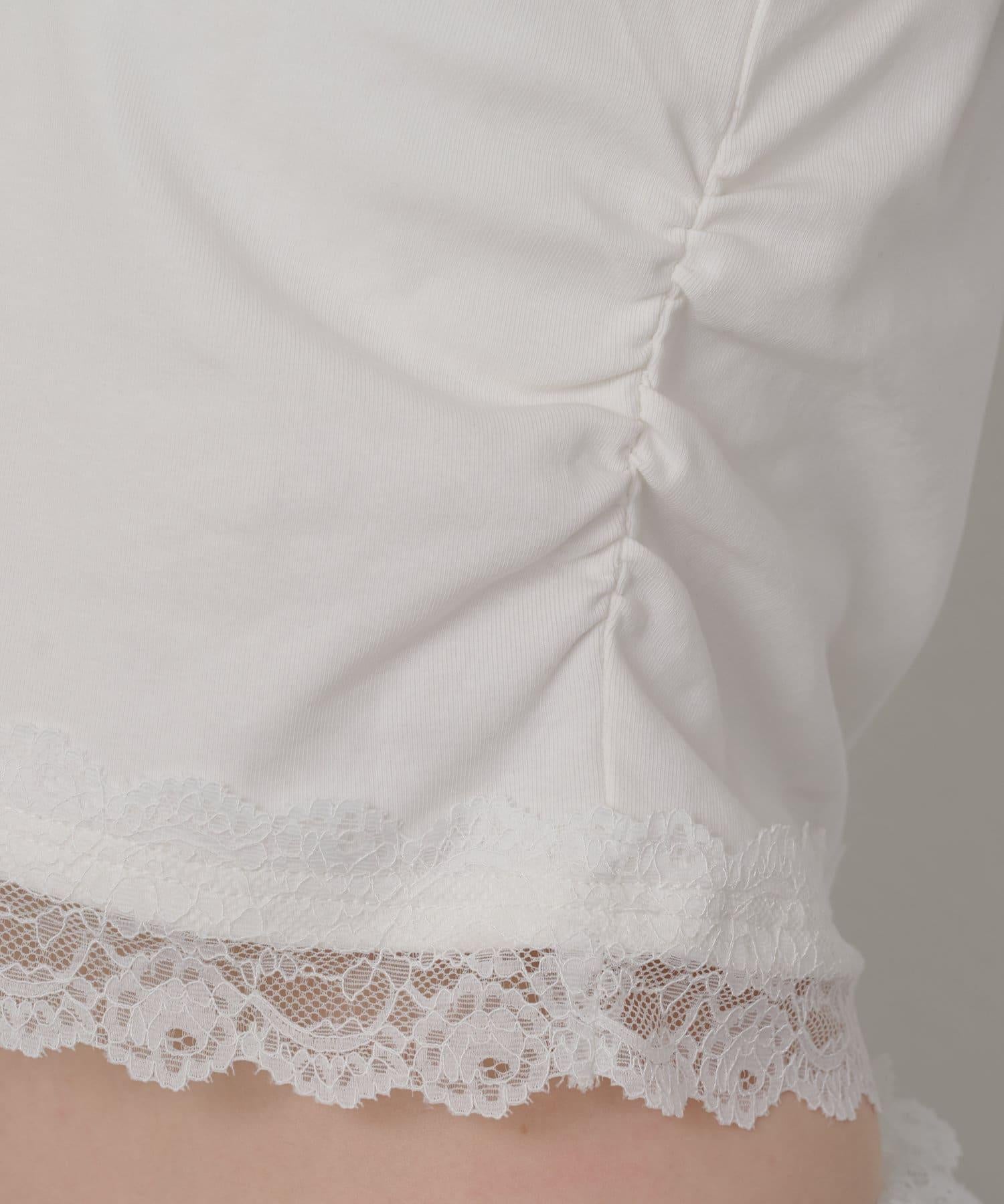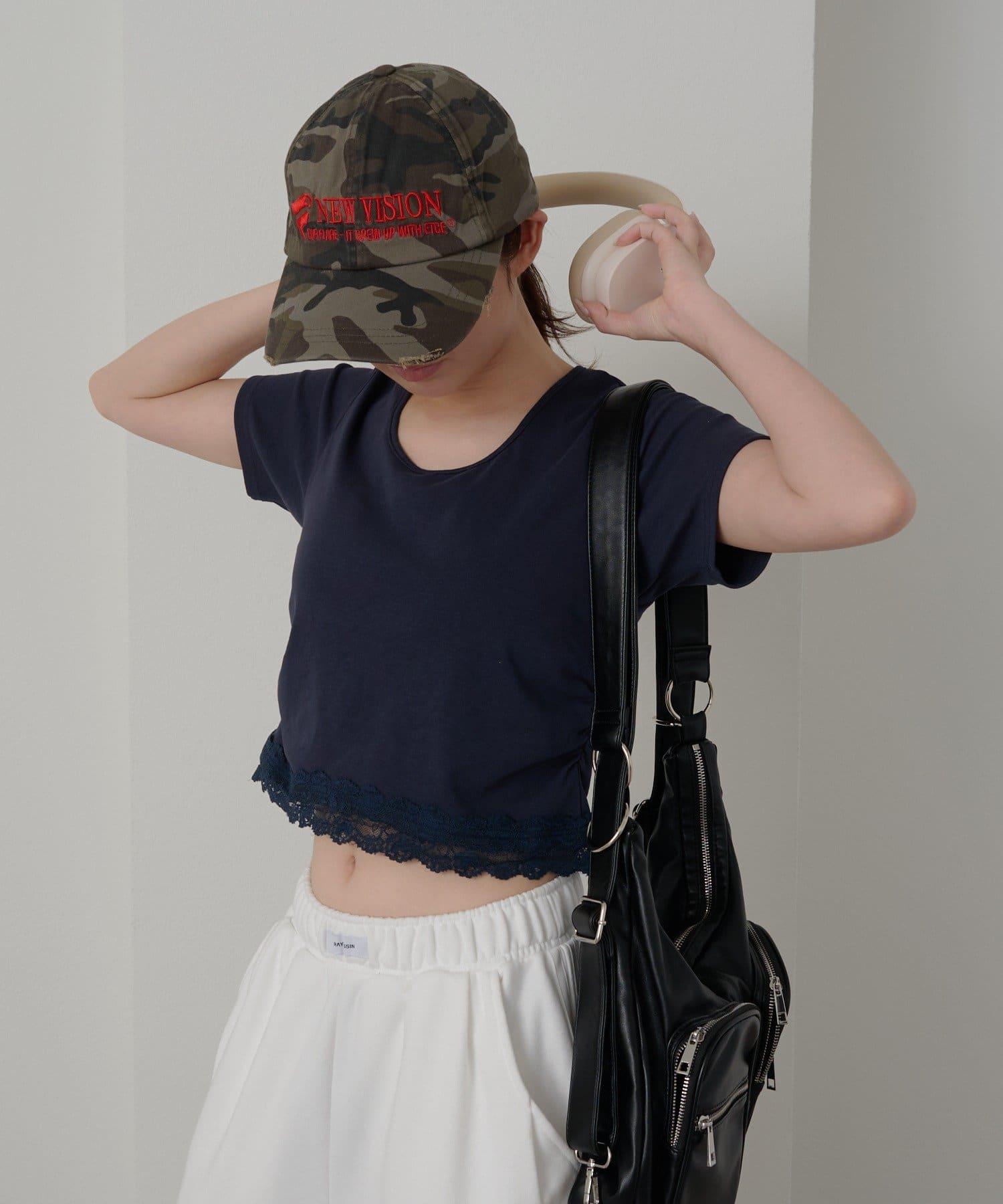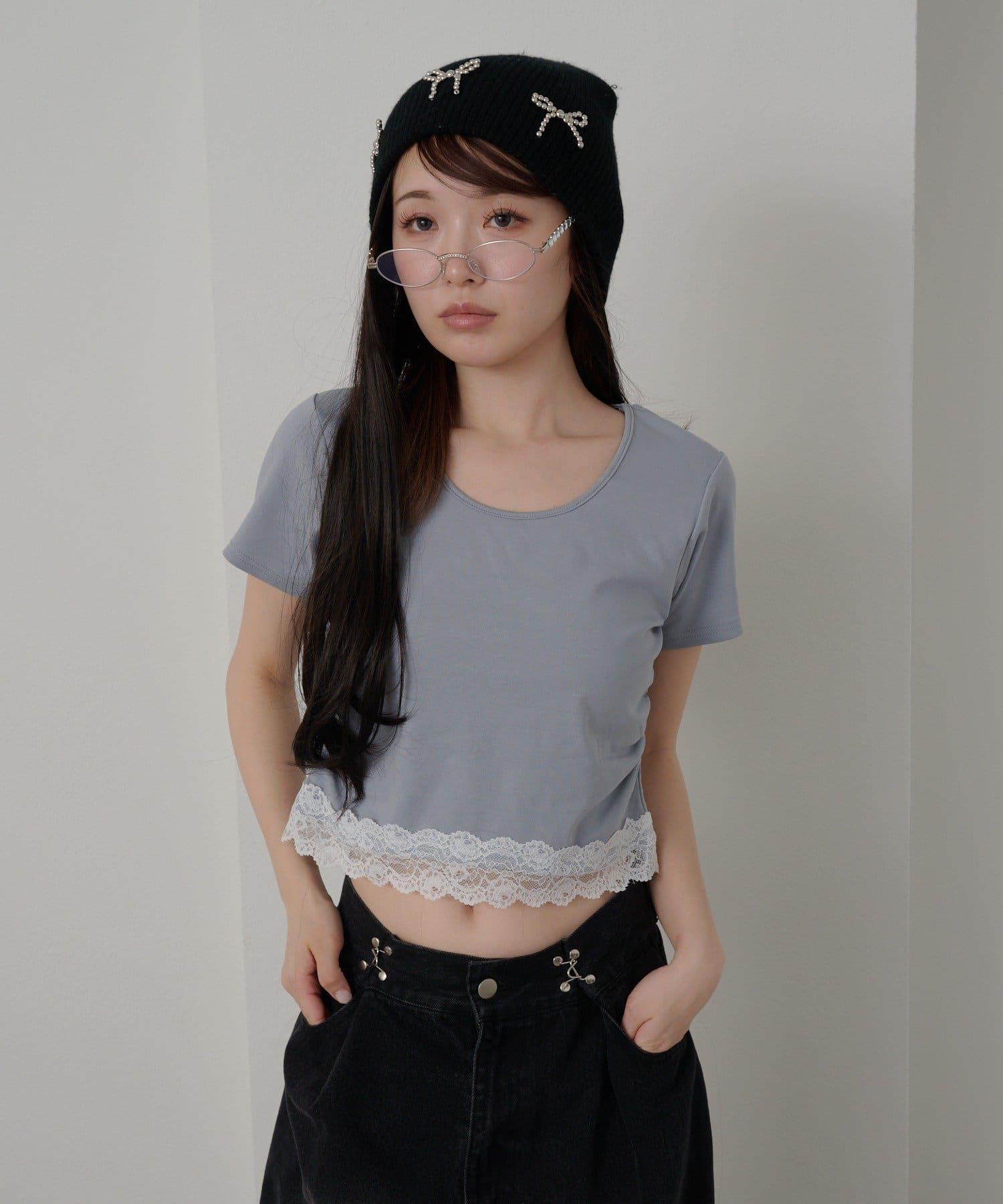 這是一款後背帶有蕾絲花邊的 T 恤,給人一種女性化的寬鬆感覺。