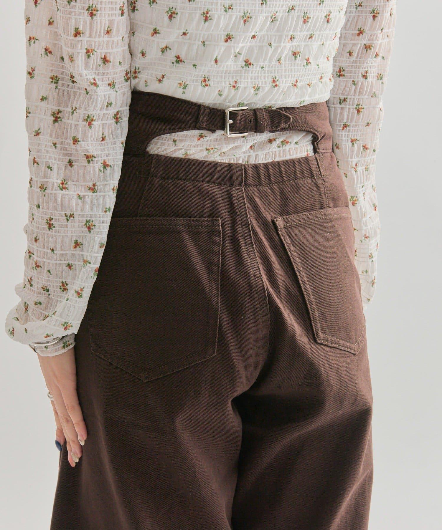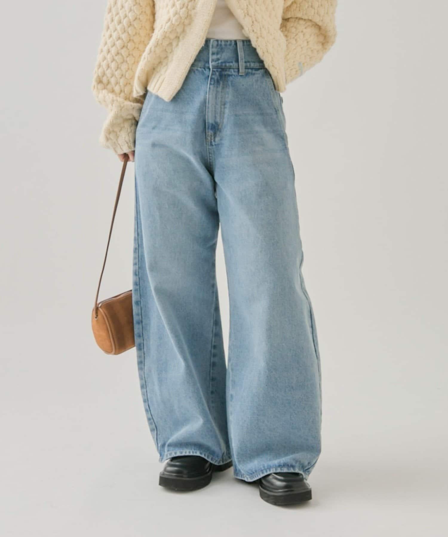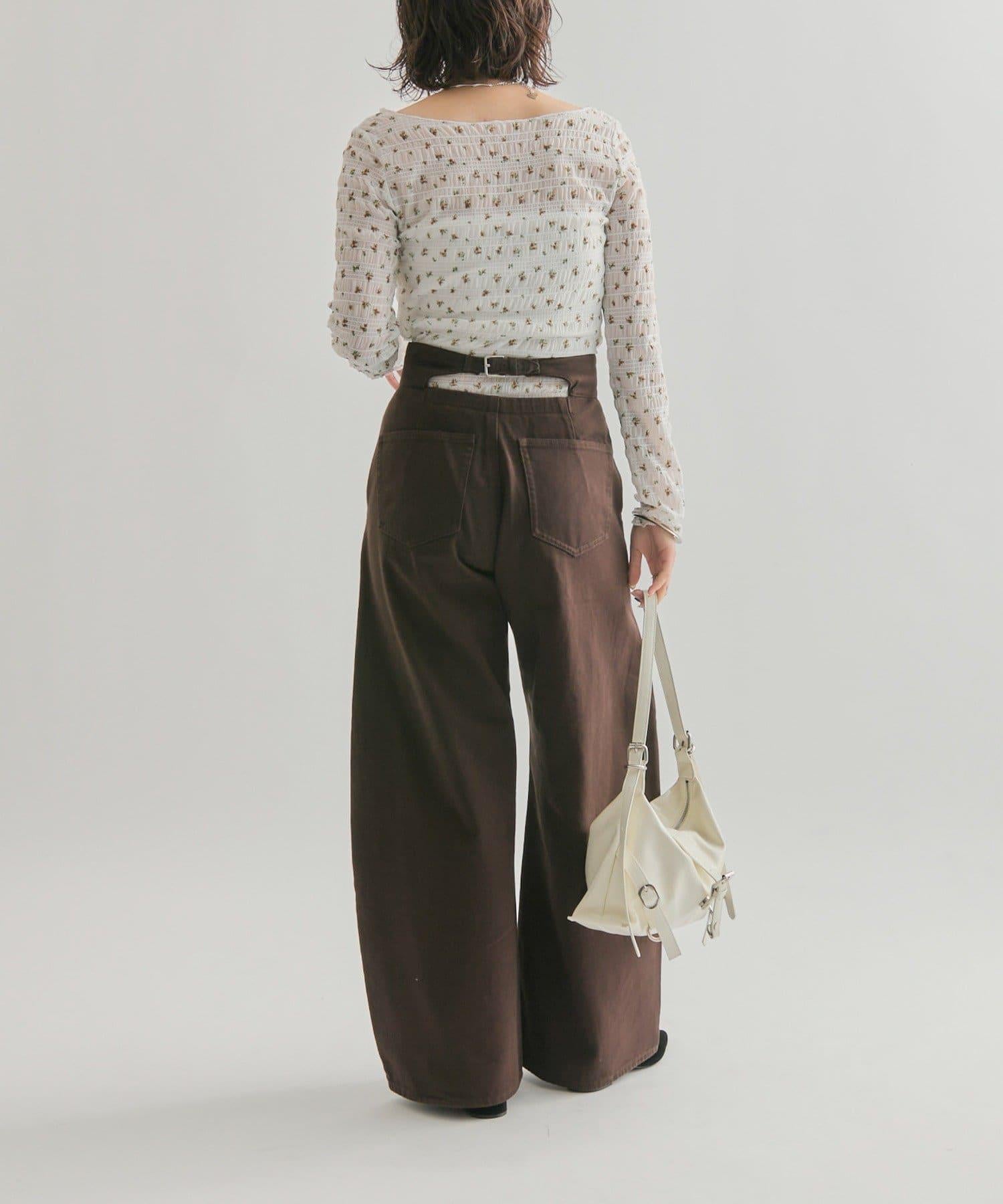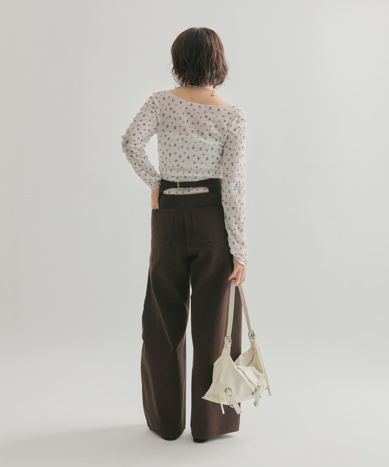 這款牛仔褲的背面有設計,因此可以搭配透視上衣,打造時尚的層次感。