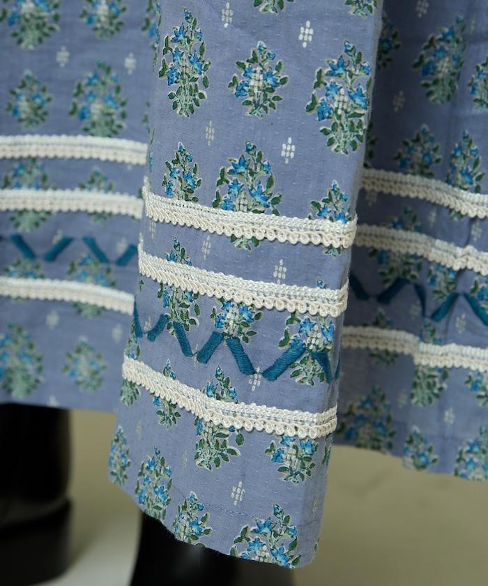 袖子和裙襬用蕾絲帶和刺繡進行了華麗裝飾。