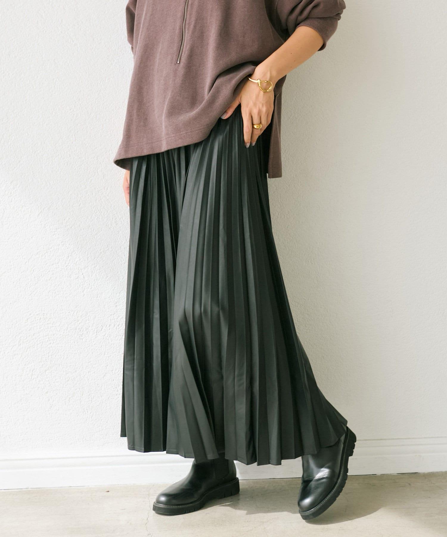【腰部有彈性,穿著舒適】仿皮褶襉裙