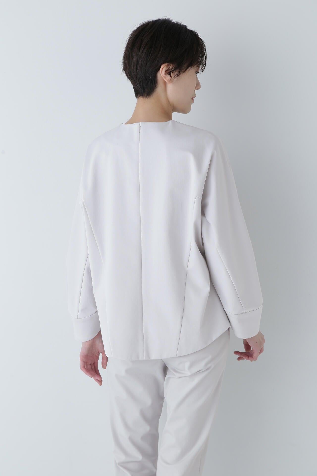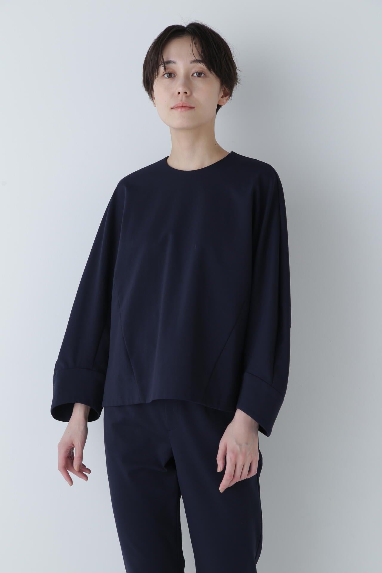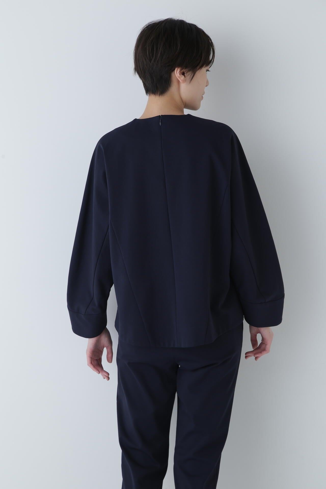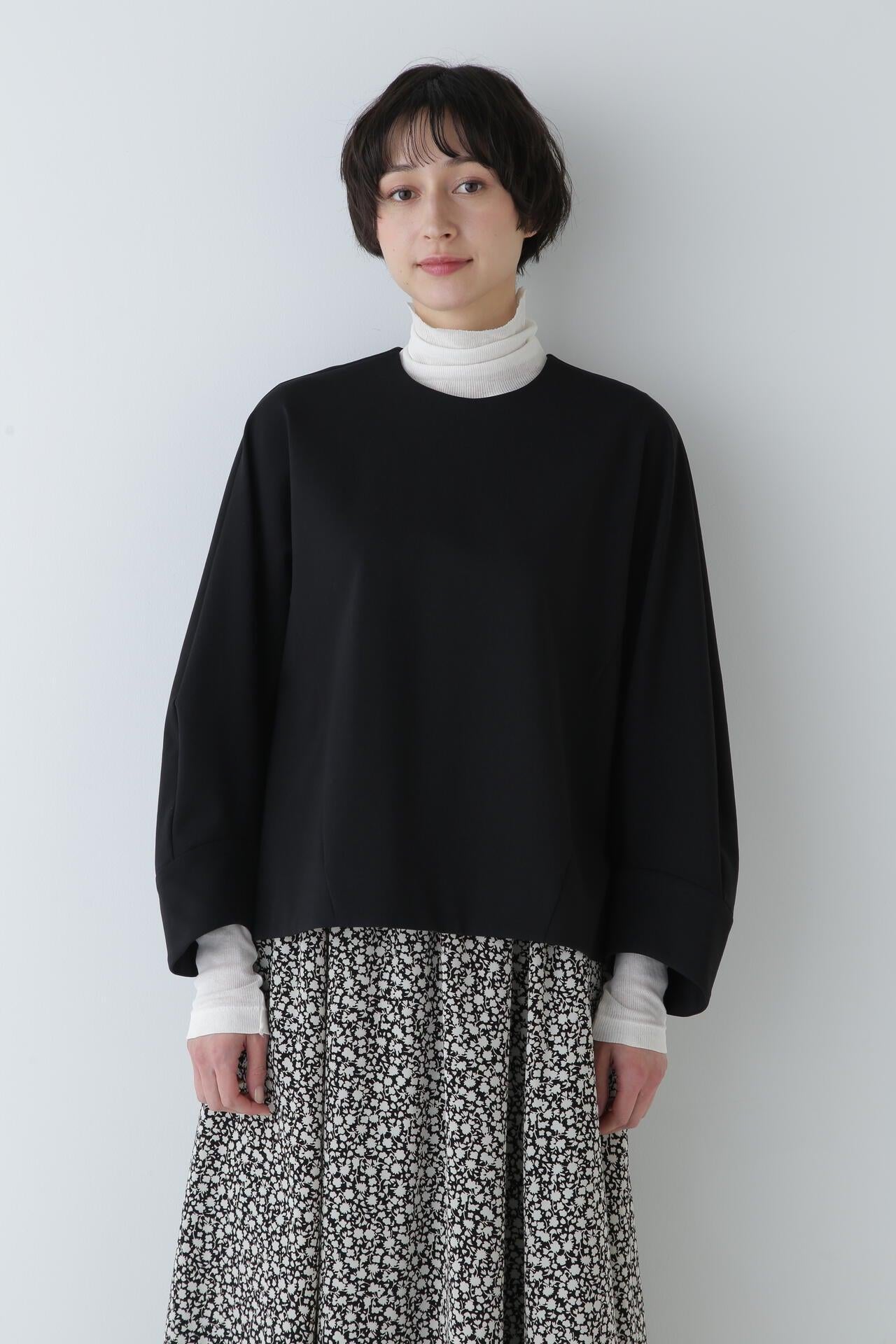以三維切換設計為輪廓的套頭上衣 [設計特點] 從衣領開始採用褶襉細節的箱形套頭上衣。 上衣採用彈力蓬鬆面料,使用絨毛少的緊密紗線。面料具有彈跳感。 由於前後不同,上衣很容易與各種下裝(從裙子到褲子)搭配。