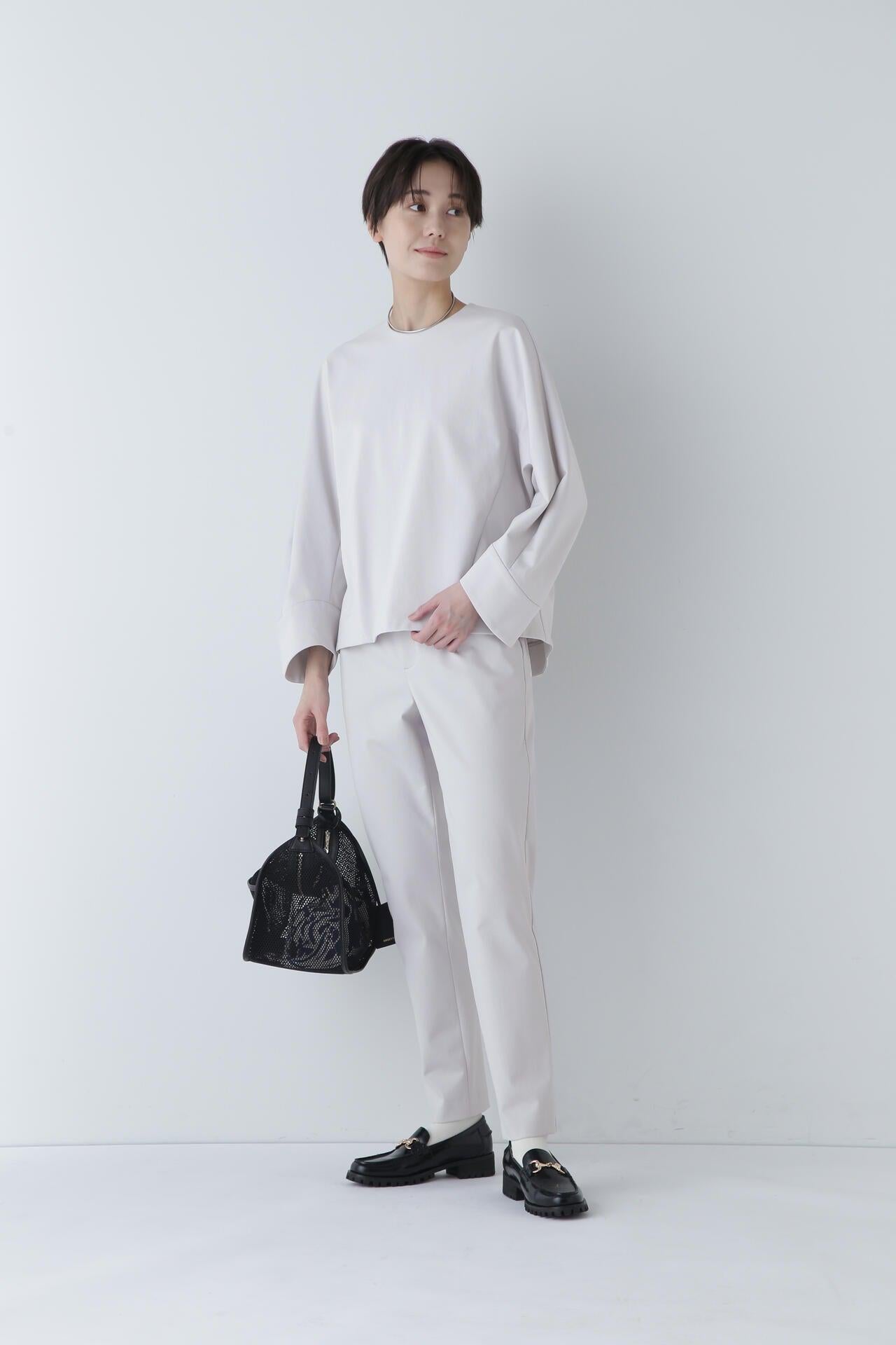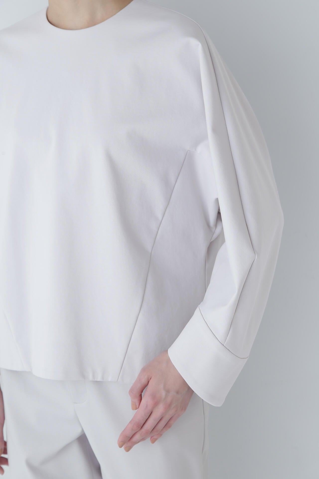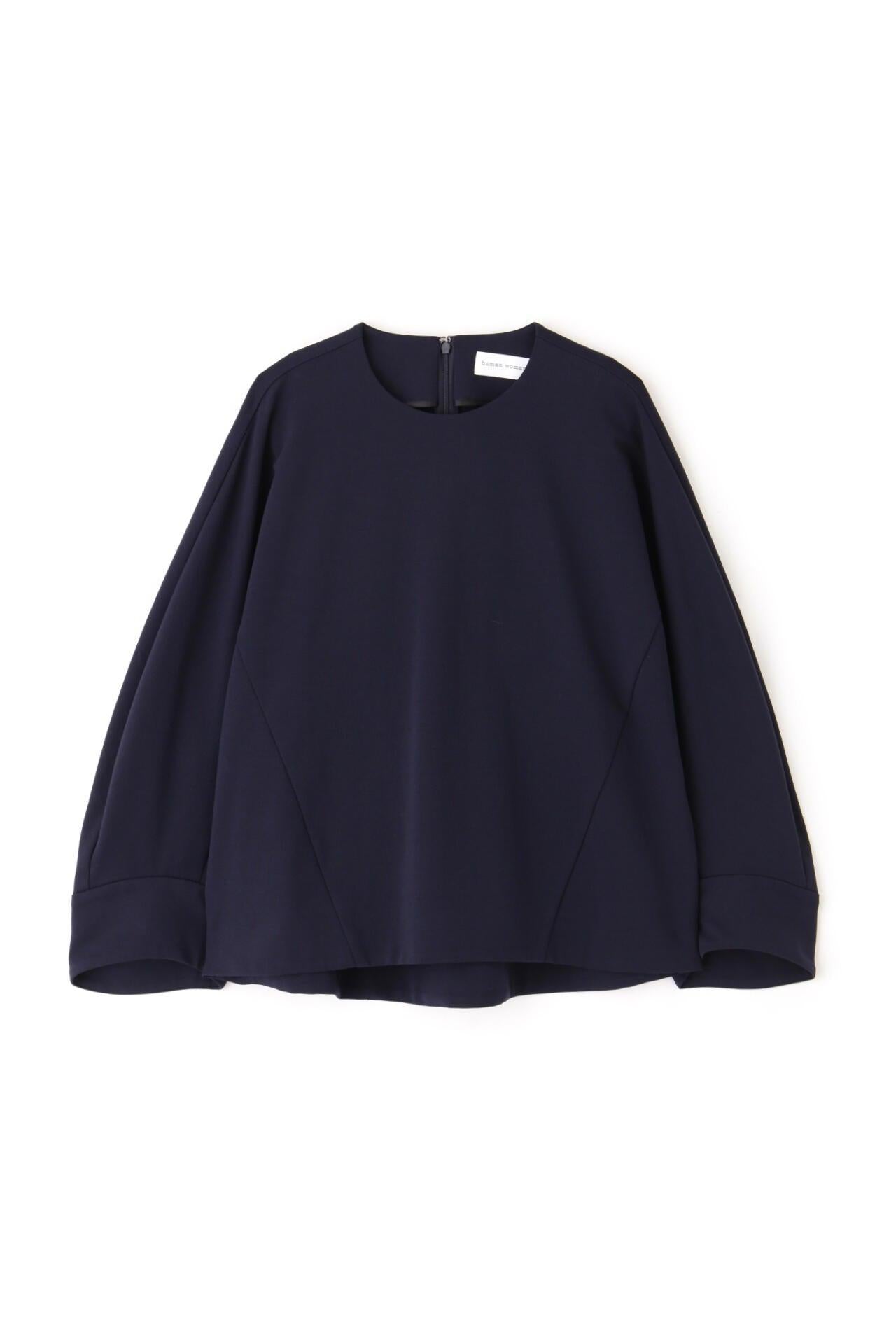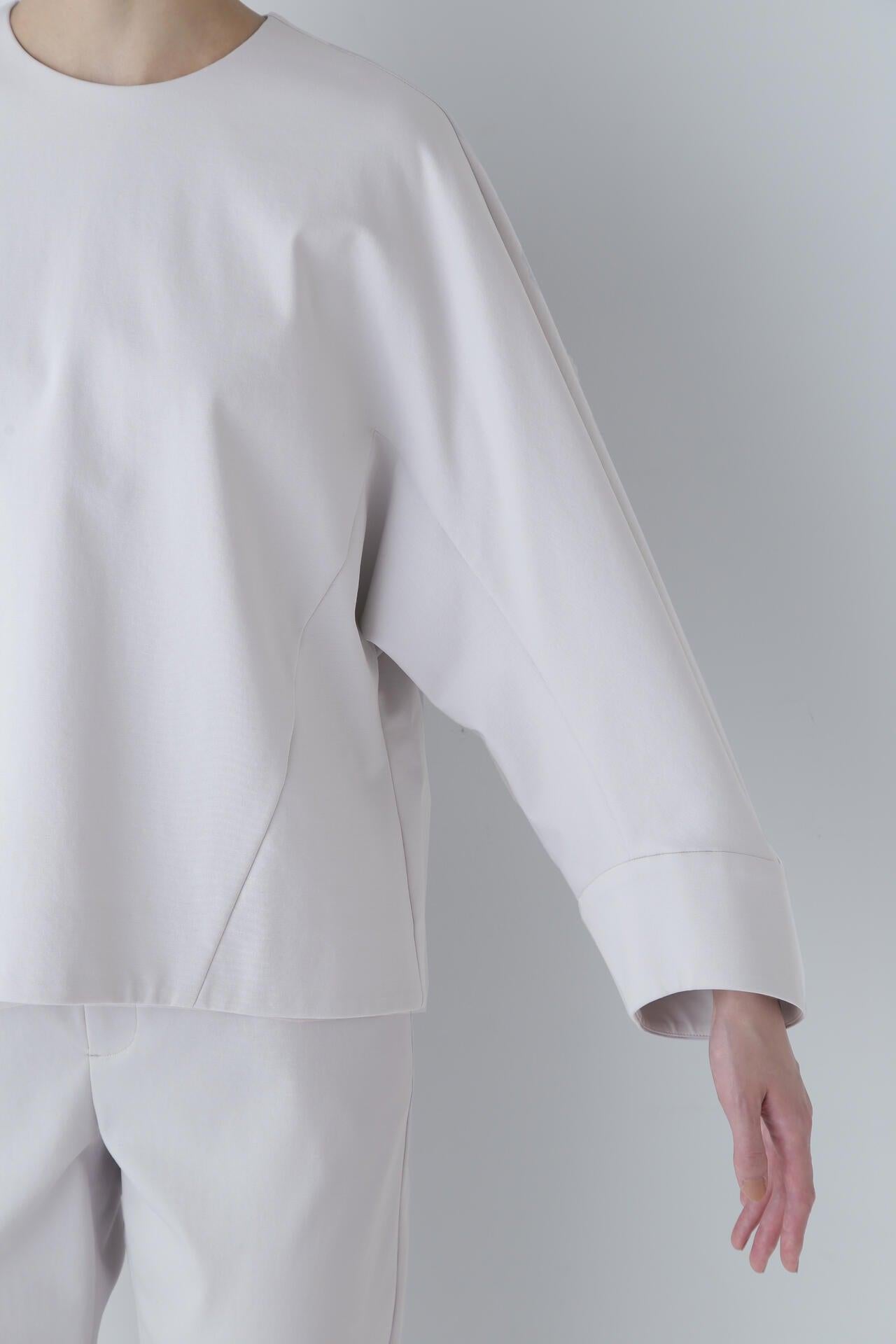 以三維切換設計為輪廓的套頭上衣 [設計特點] 從衣領開始採用褶襉細節的箱形套頭上衣。 上衣採用彈力蓬鬆面料,使用絨毛少的緊密紗線。面料具有彈跳感。 由於前後不同,上衣很容易與各種下裝(從裙子到褲子)搭配。
