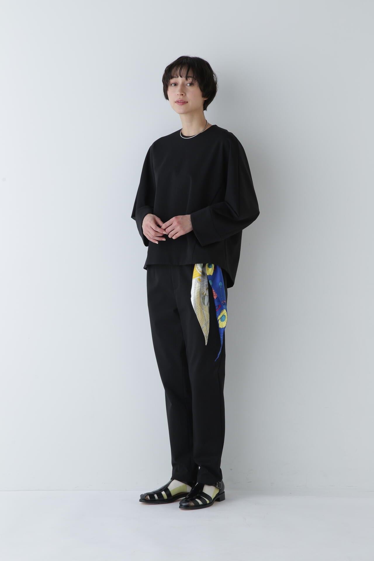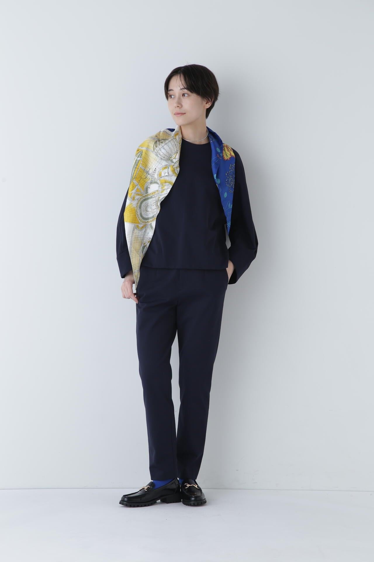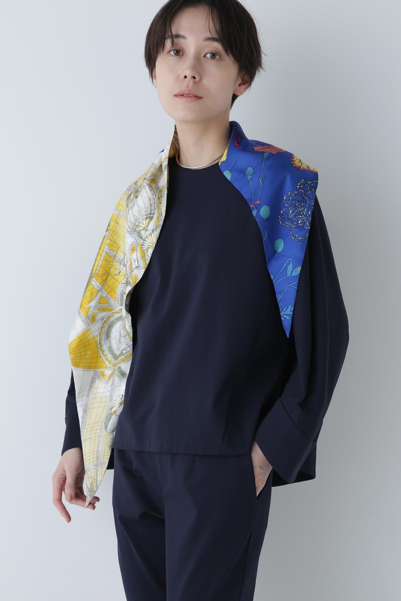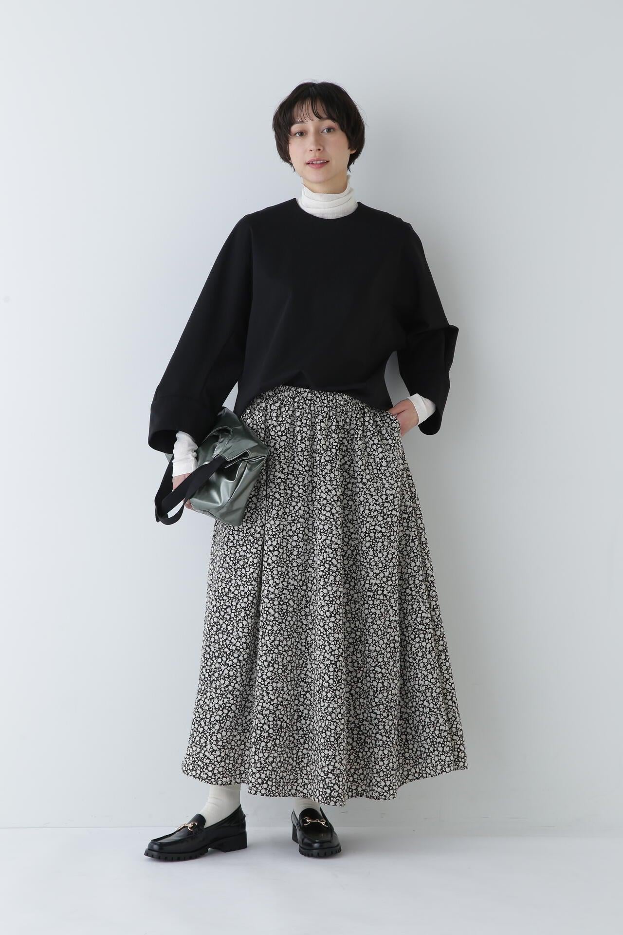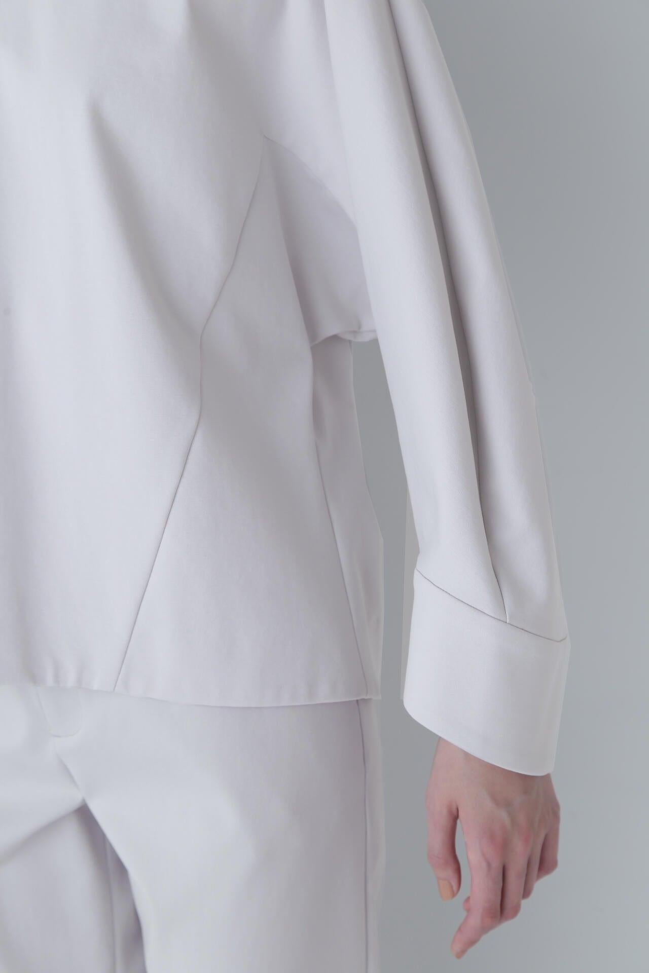 以三維切換設計為輪廓的套頭上衣 [設計特點] 從衣領開始採用褶襉細節的箱形套頭上衣。 上衣採用彈力蓬鬆面料,使用絨毛少的緊密紗線。面料具有彈跳感。 由於前後不同,上衣很容易與各種下裝(從裙子到褲子)搭配。