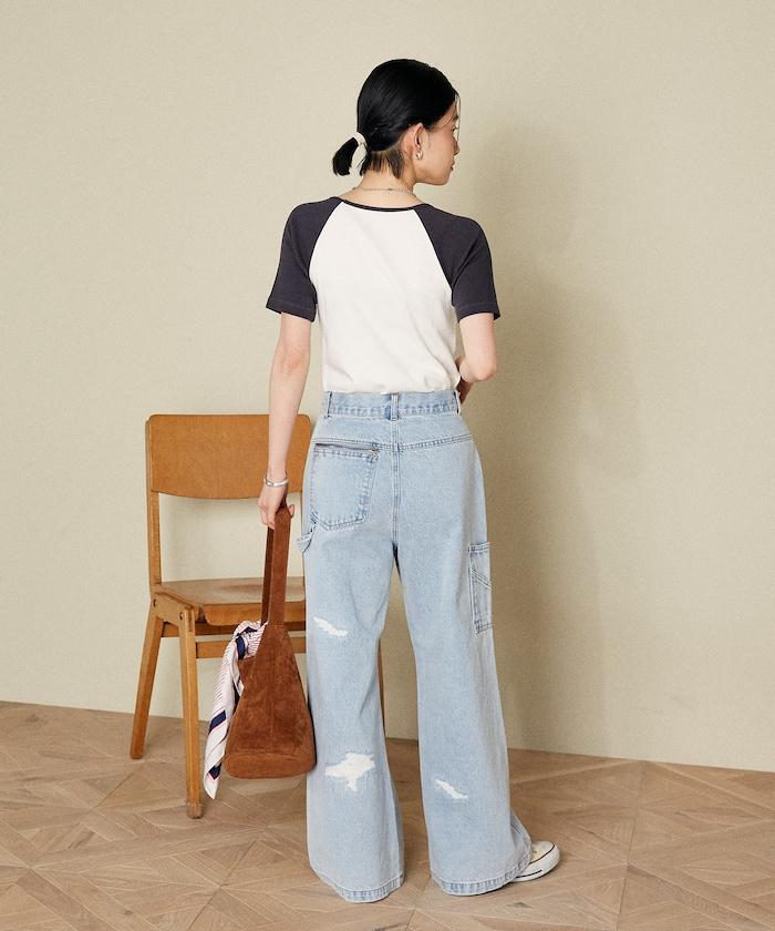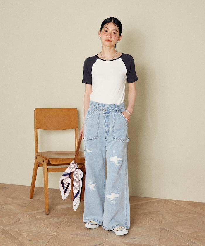 小巧的上衣建議搭配寬大的牛仔褲或寬大的塔克褲等有體積感的褲子。