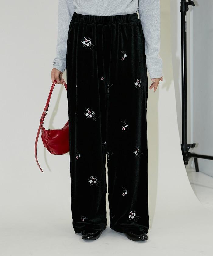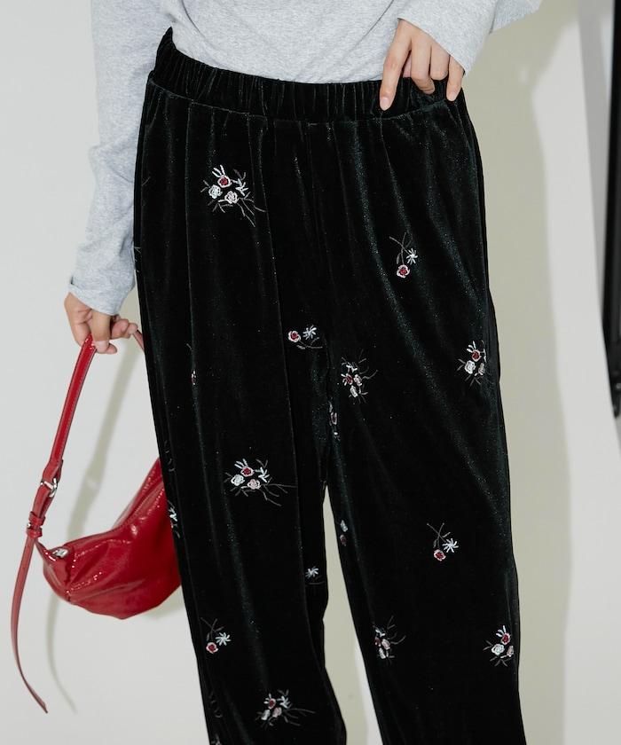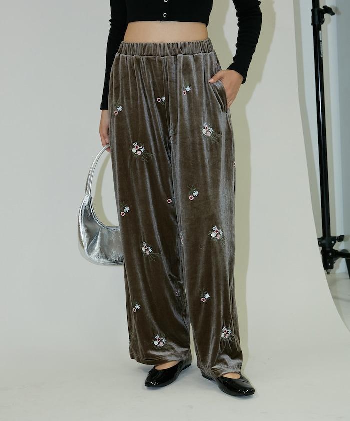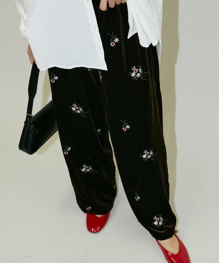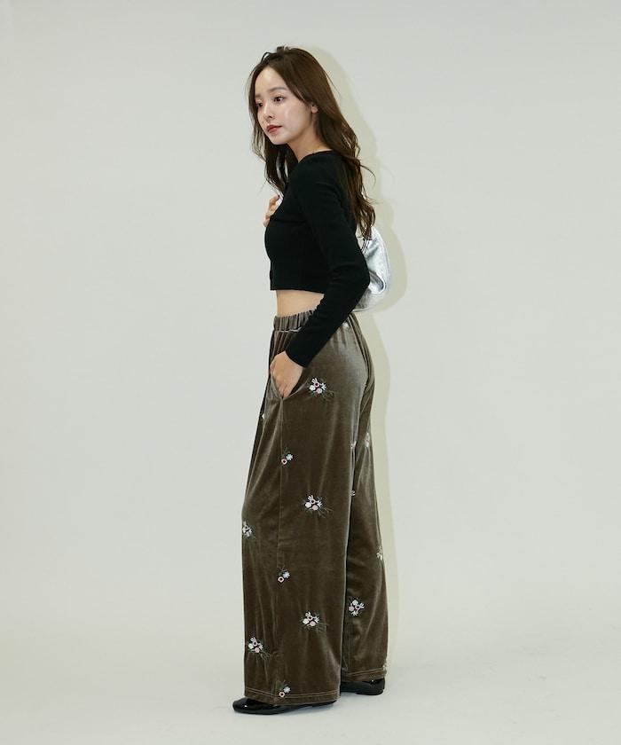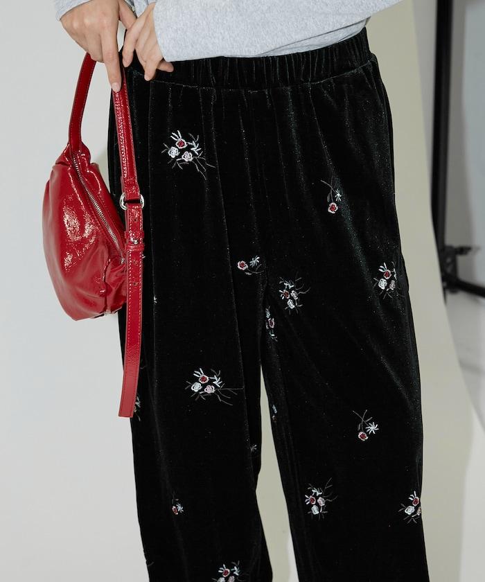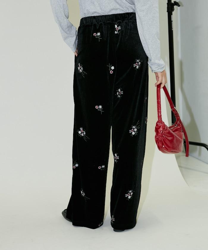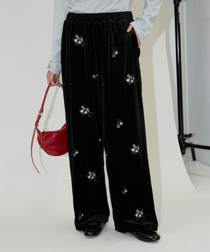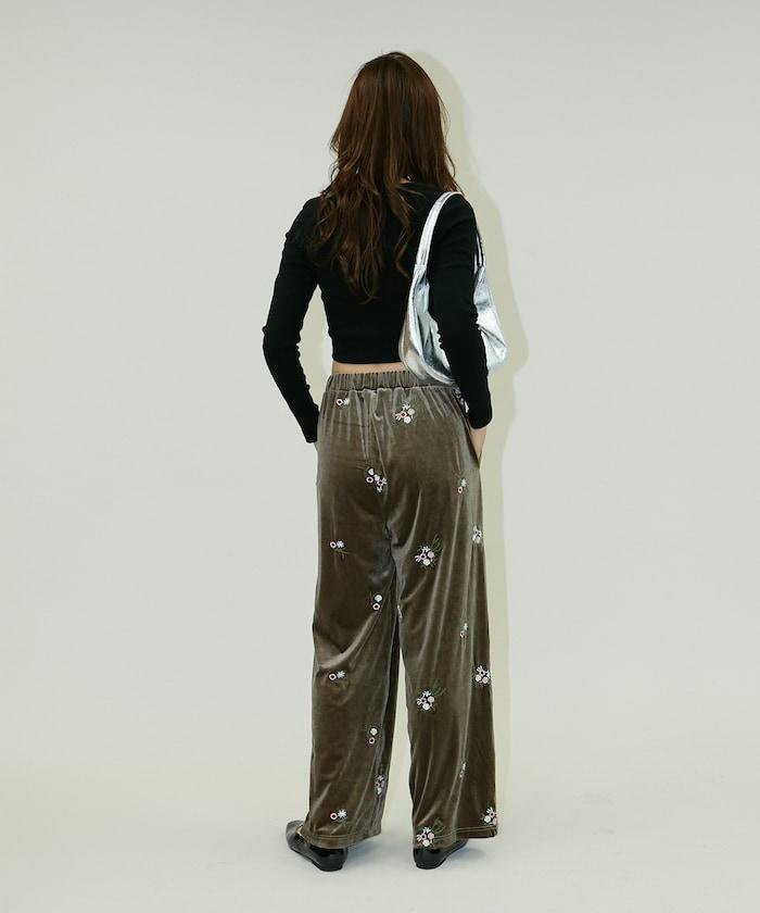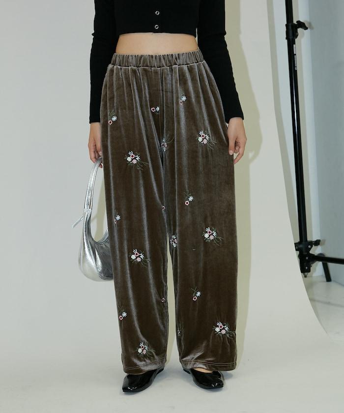 寬鬆長褲,復古花朵刺繡與絲絨面料的復古可愛組合。