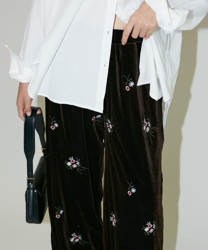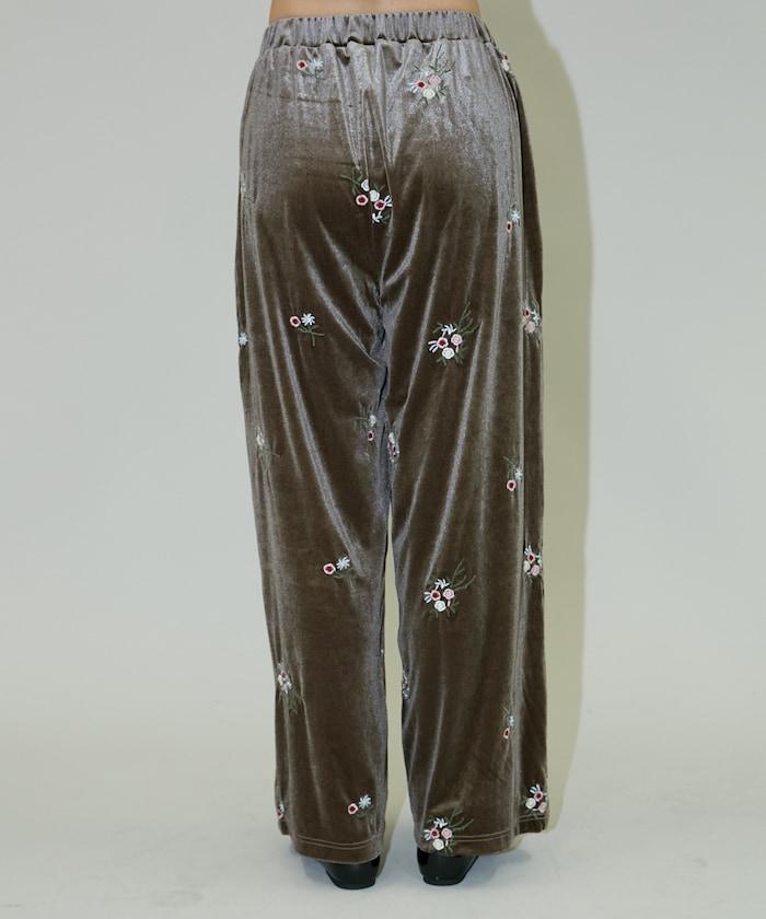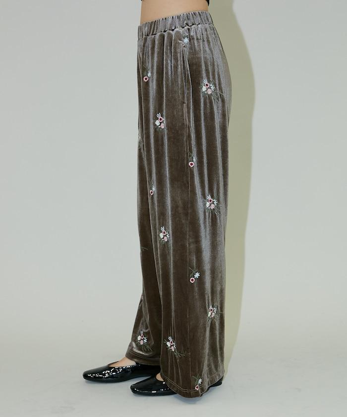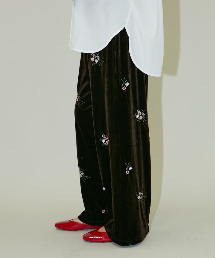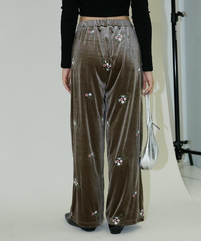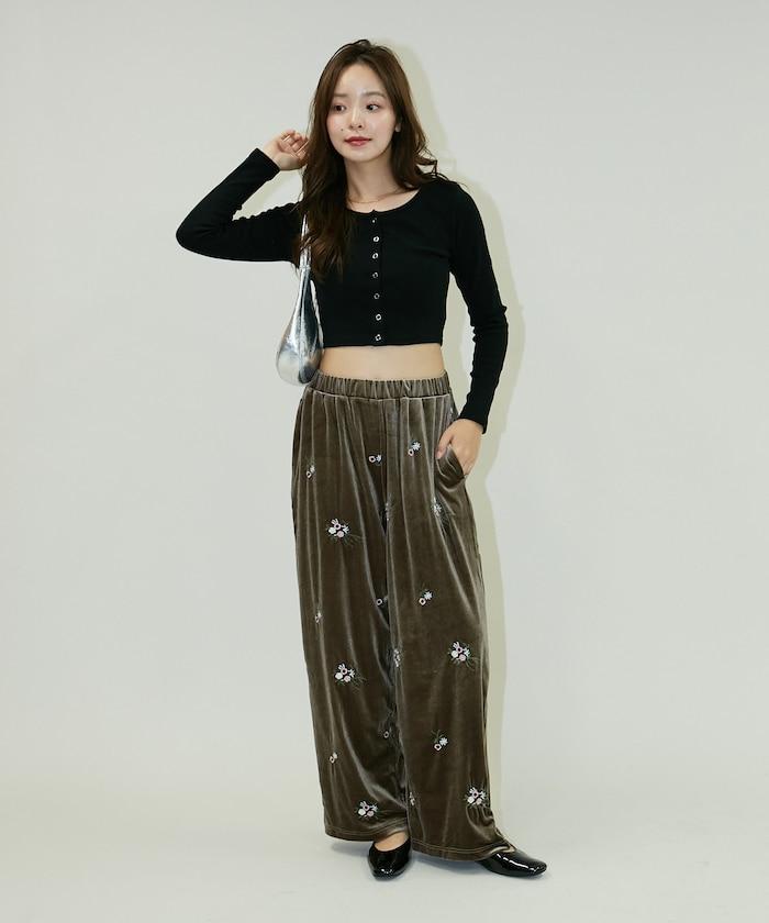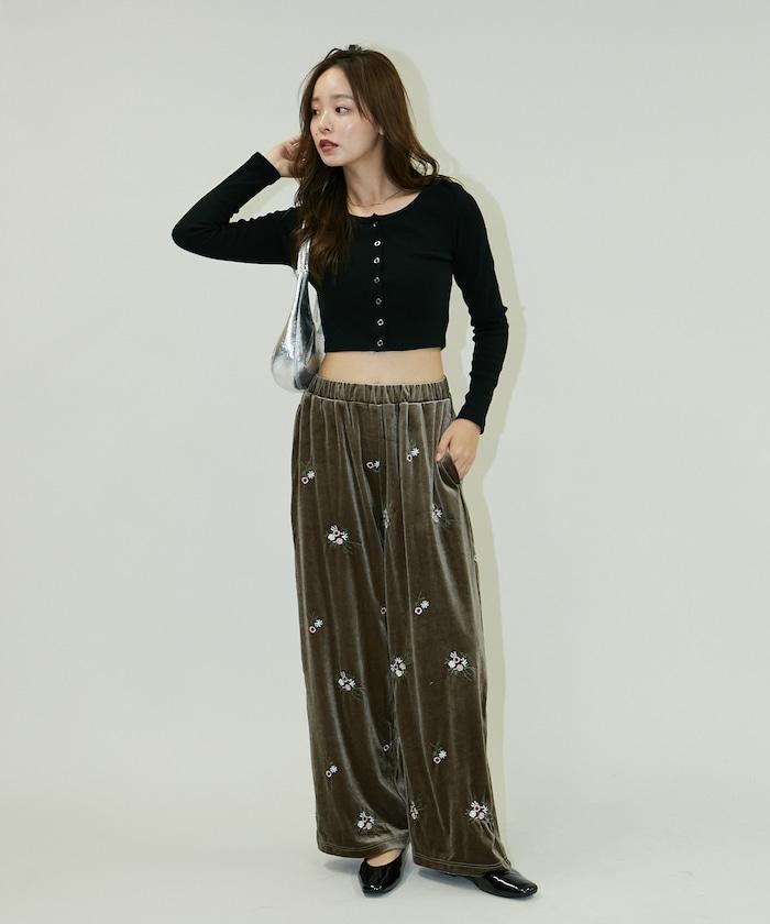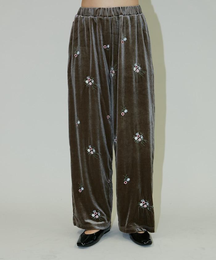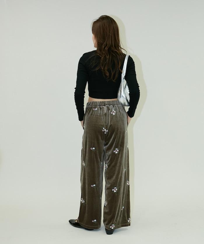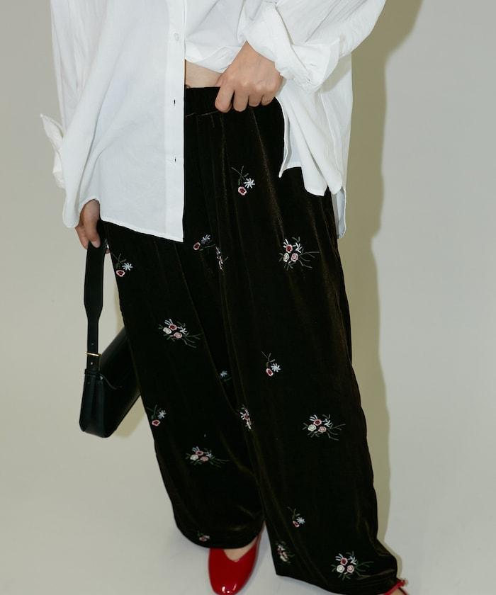 寬鬆長褲,復古花朵刺繡與絲絨面料的復古可愛組合。