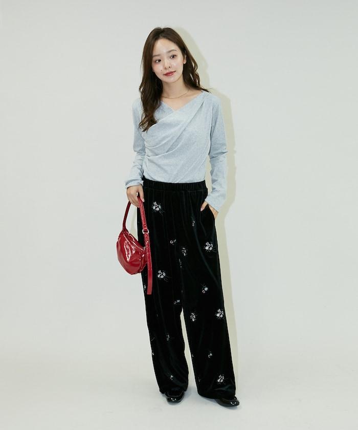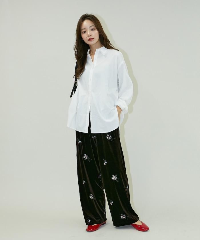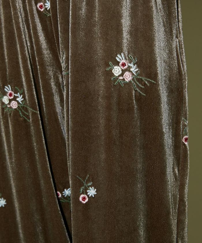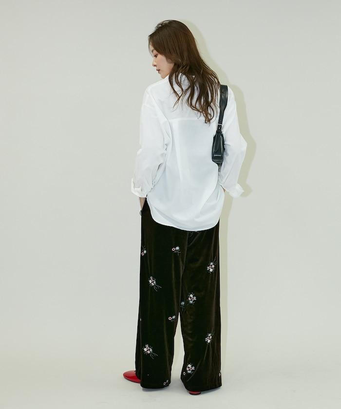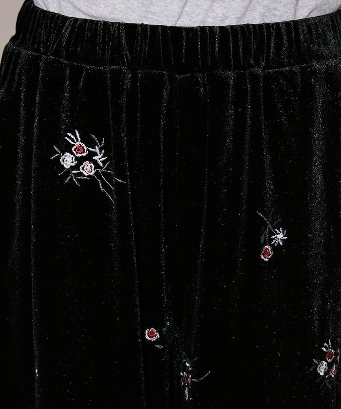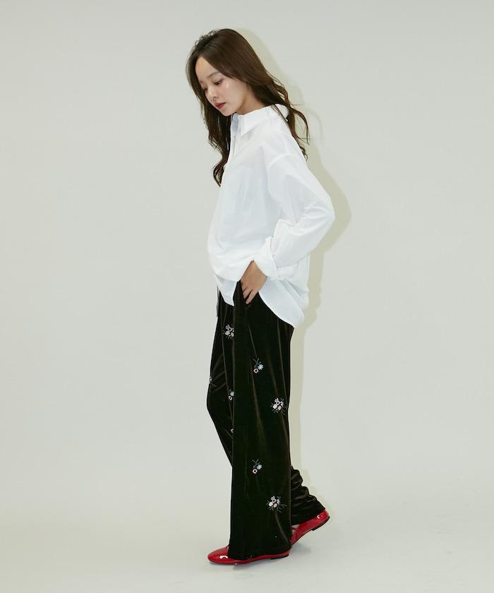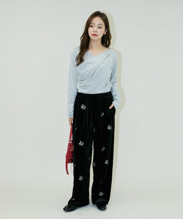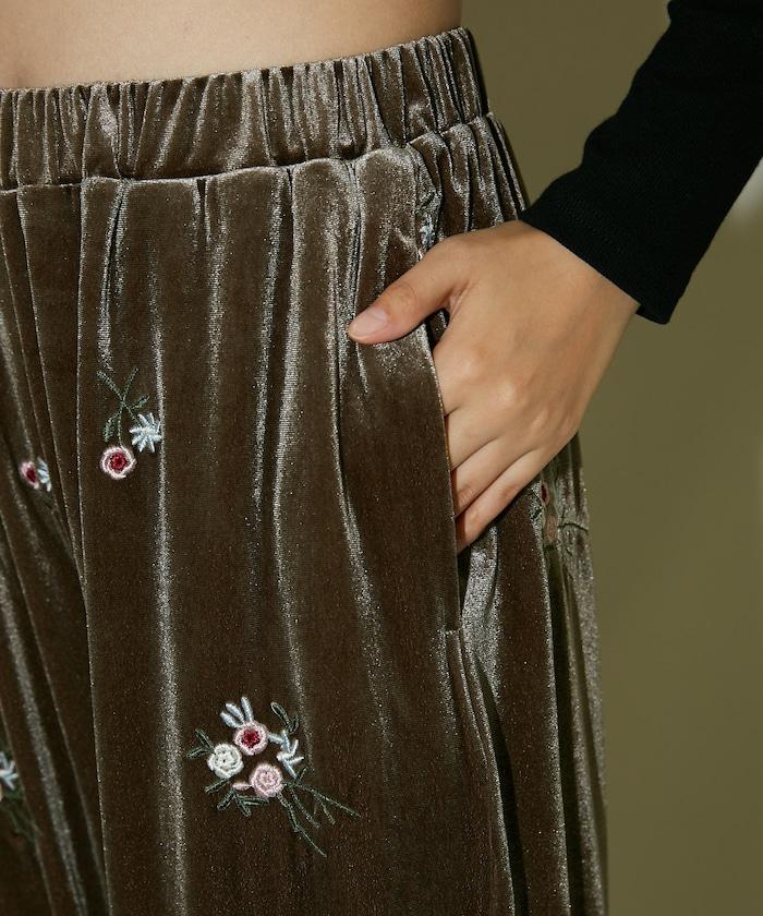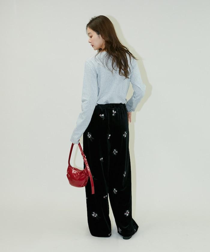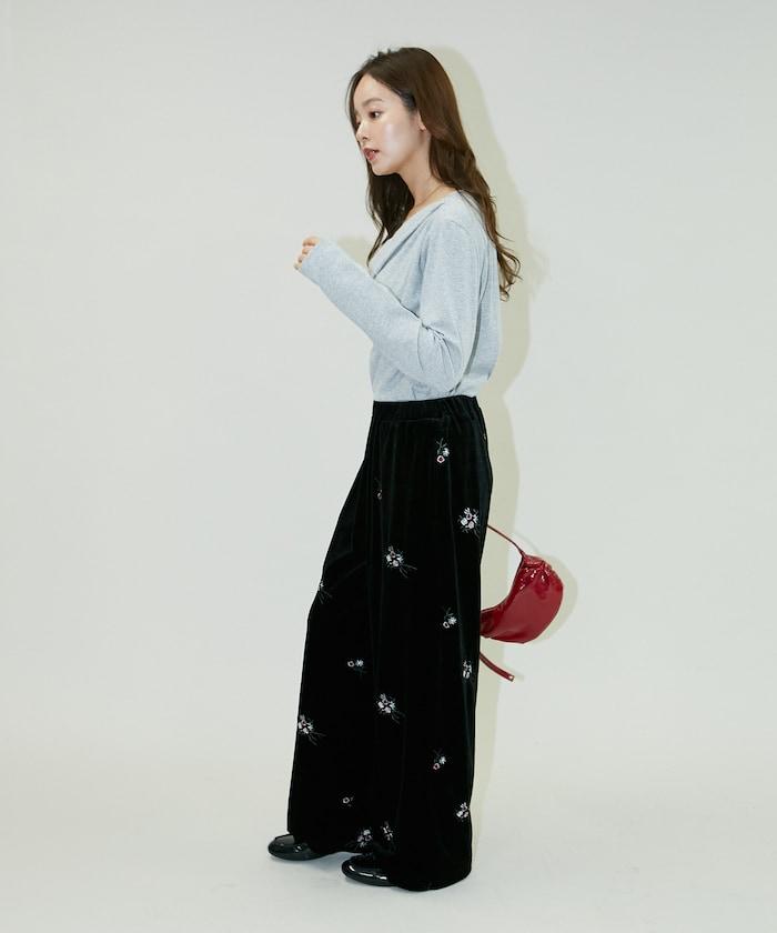 寬鬆長褲,復古花朵刺繡與絲絨面料的復古可愛組合。