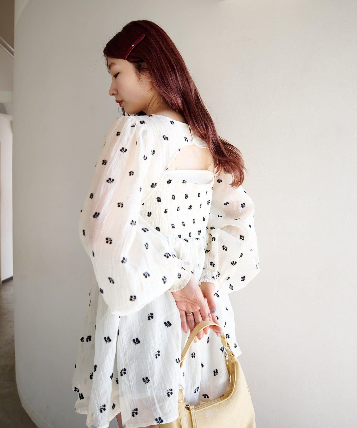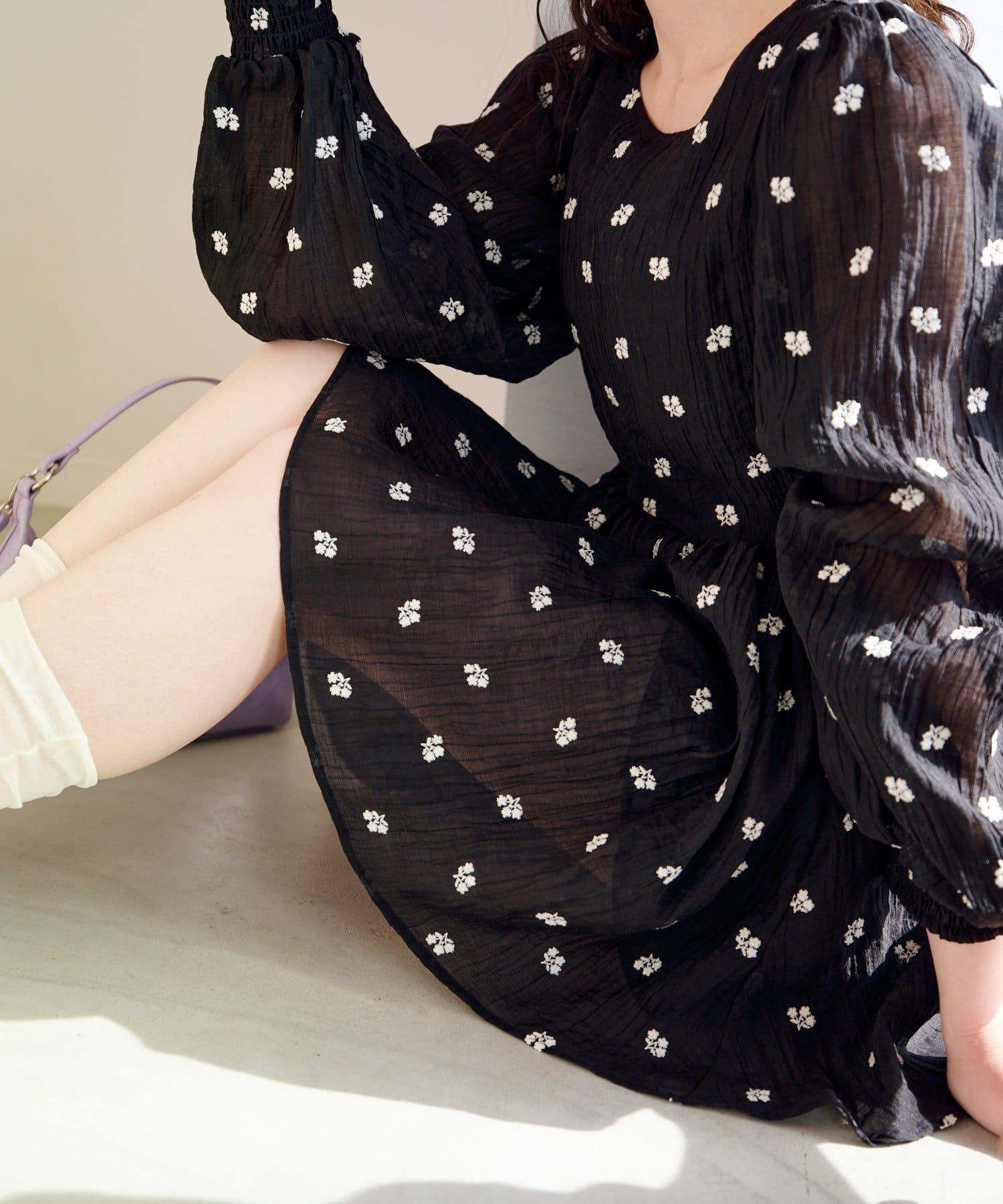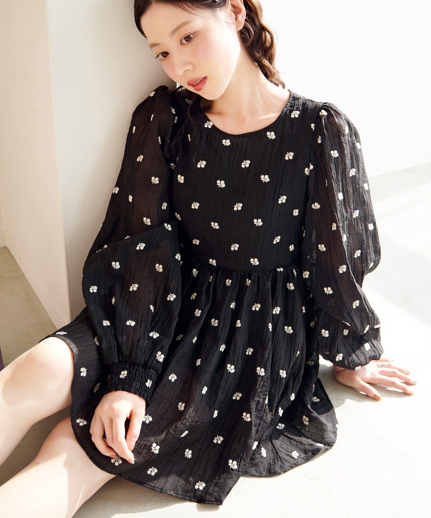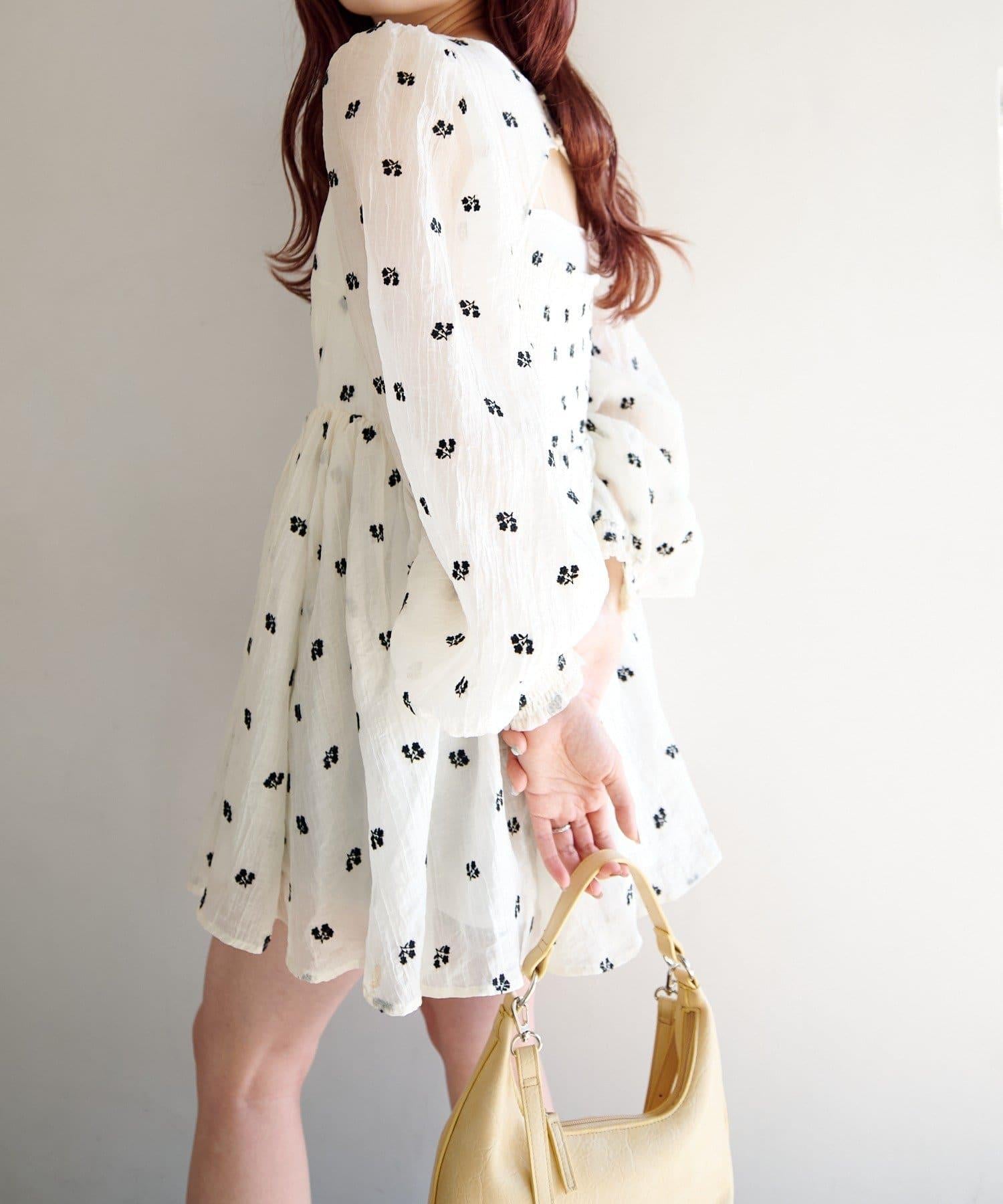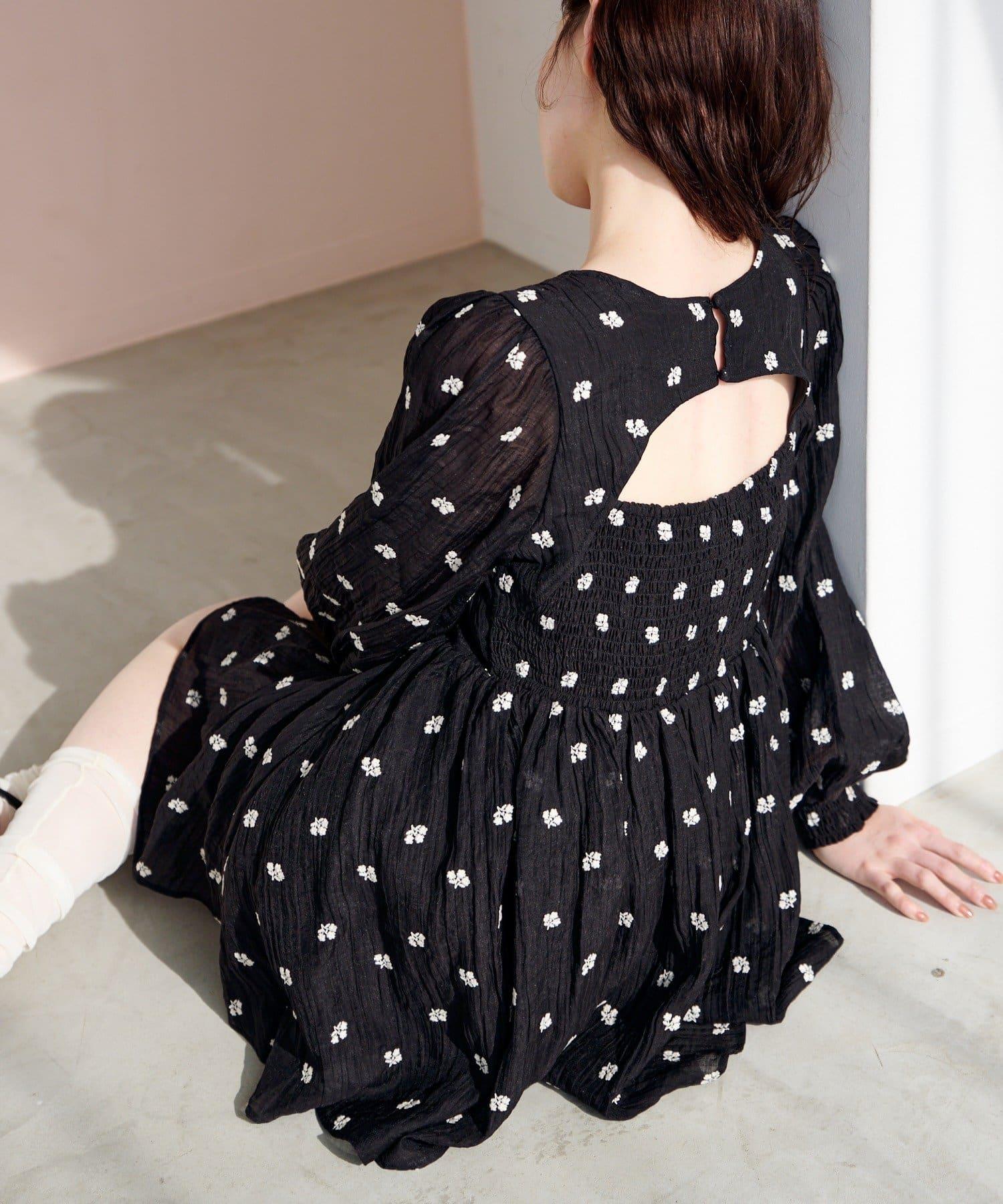 這款迷你連衣裙遍佈精緻的花朵縫線,給人一種甜美無憂的感覺。
