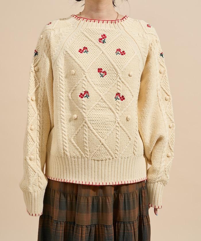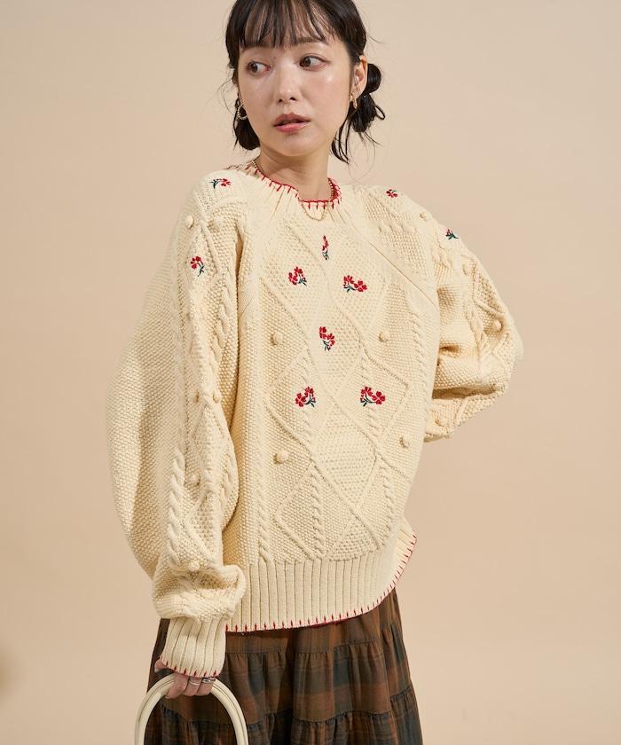 復古針織開衫,細節處繡有花朵、絨球和縫線。