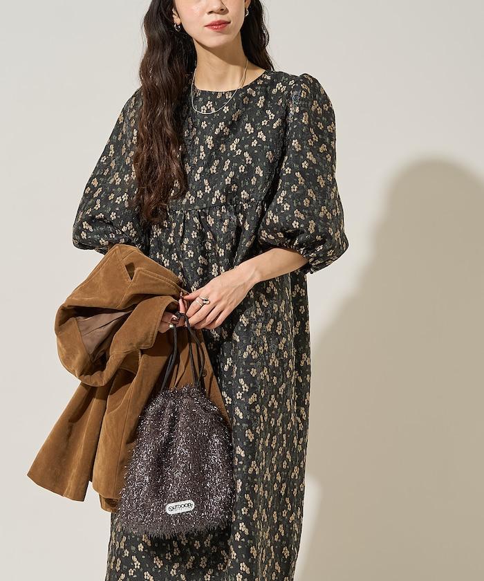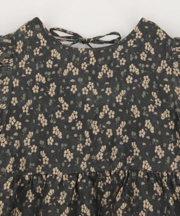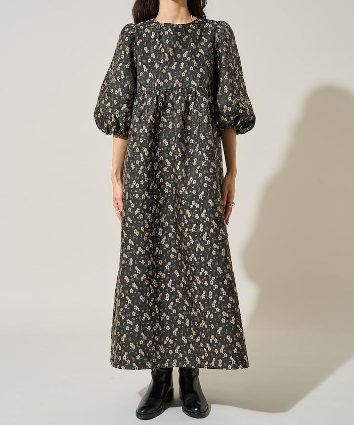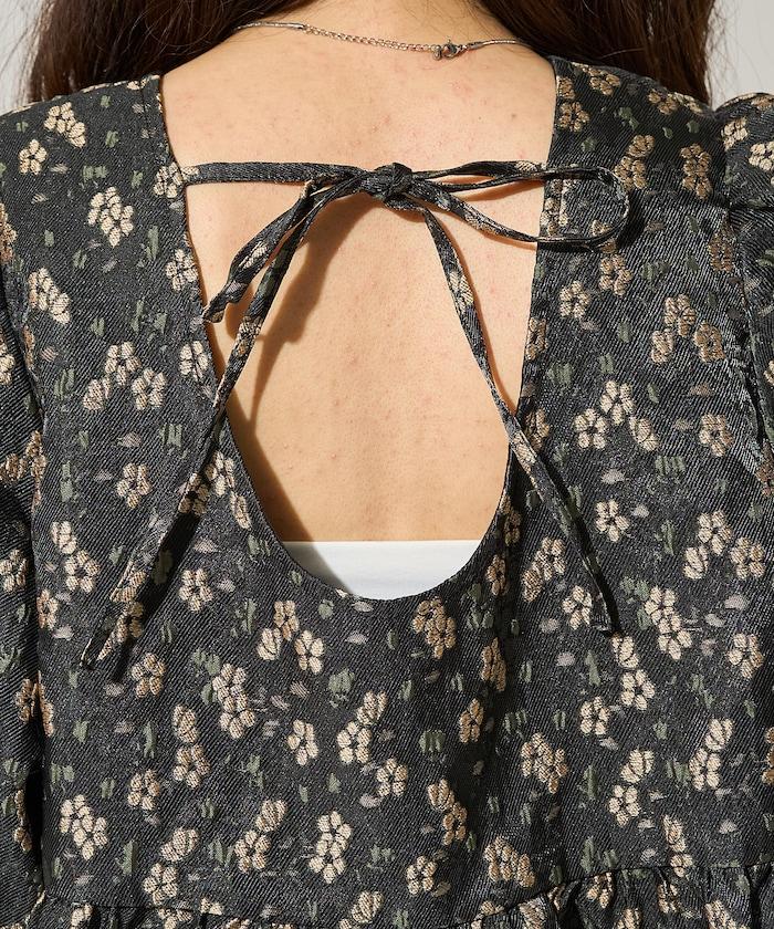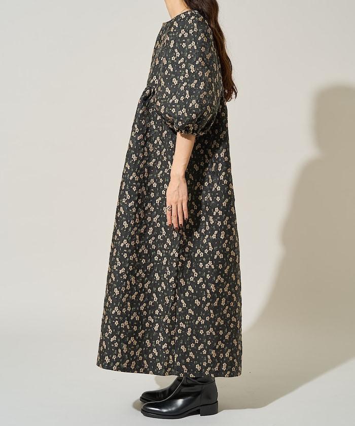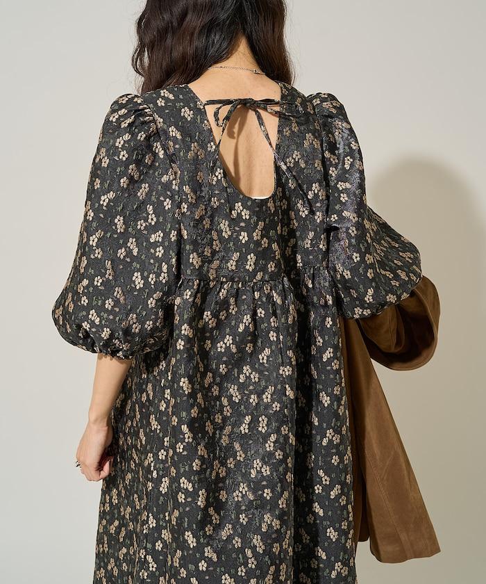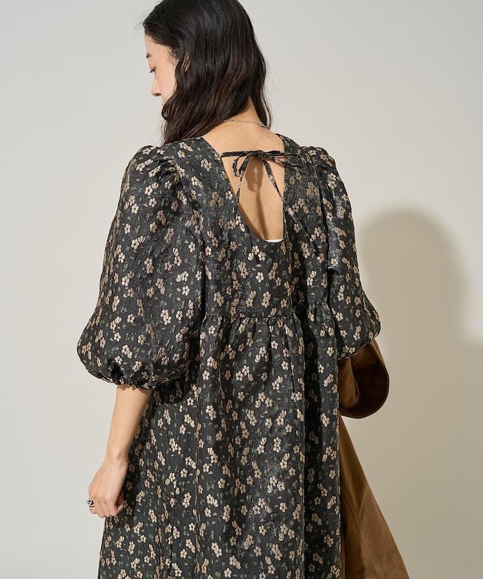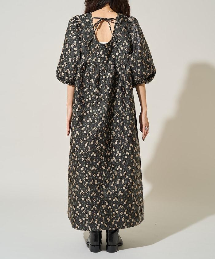 花卉提花後系蝴蝶結長款連衣裙