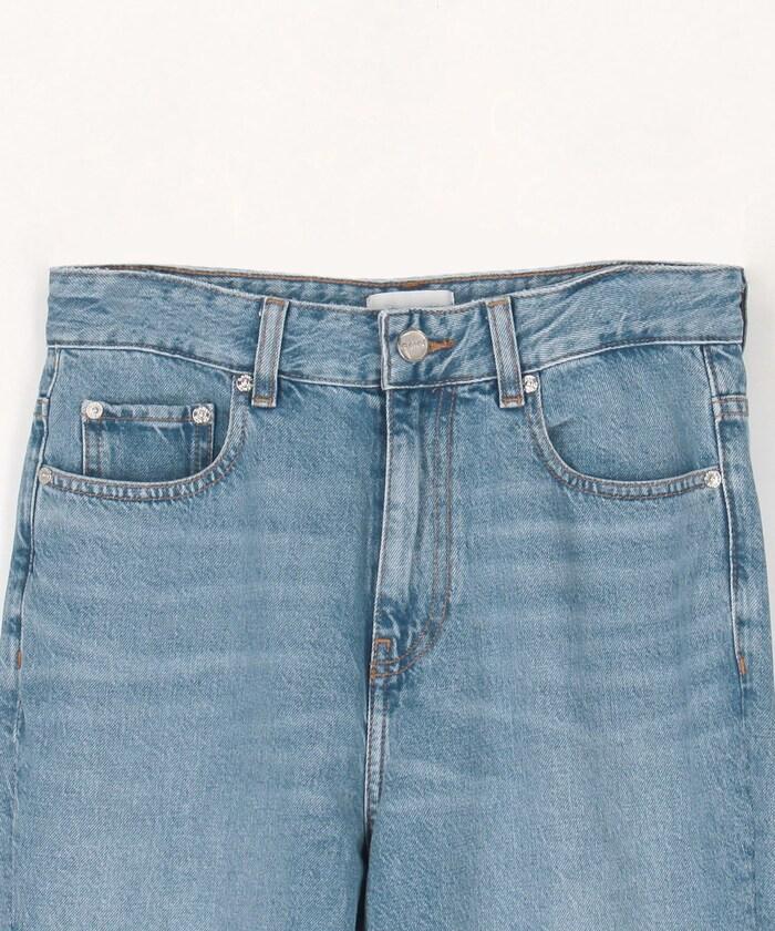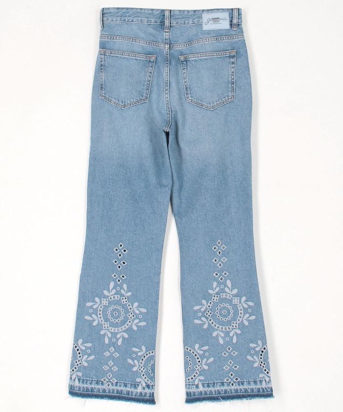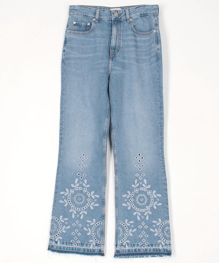 高腰直筒牛仔長褲,下襬有醒目的英式刺繡細節。