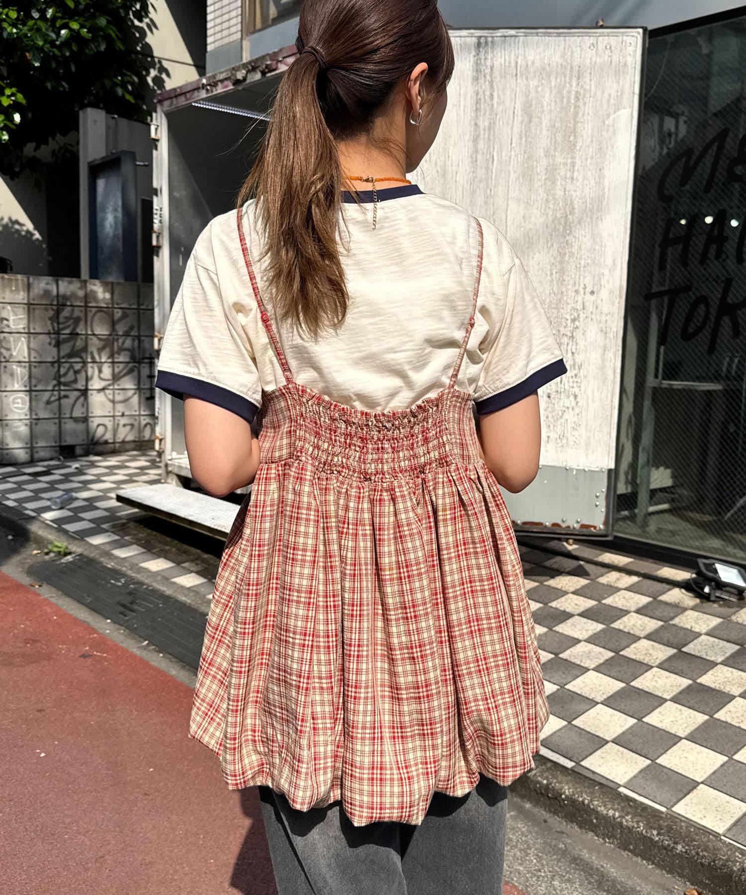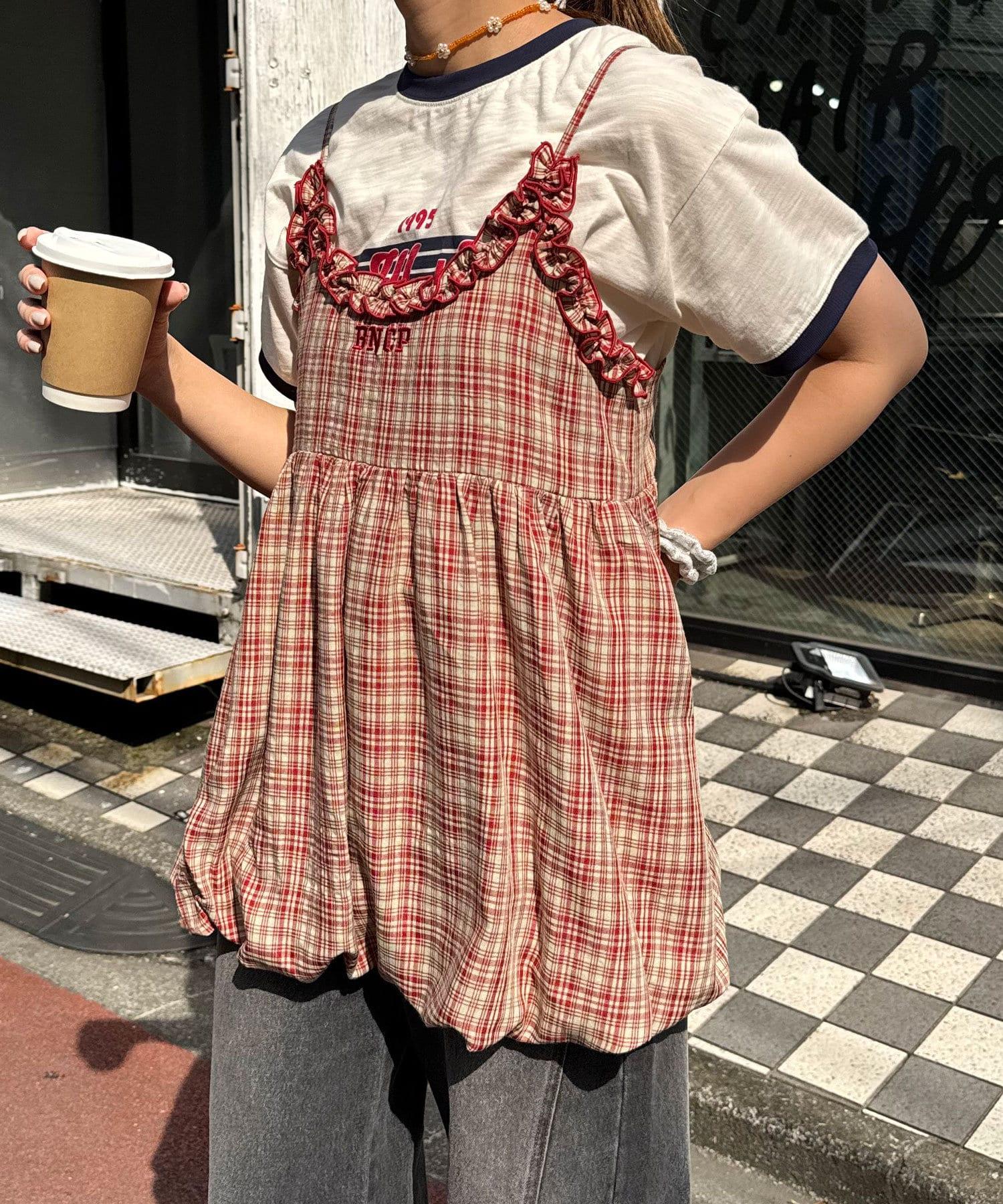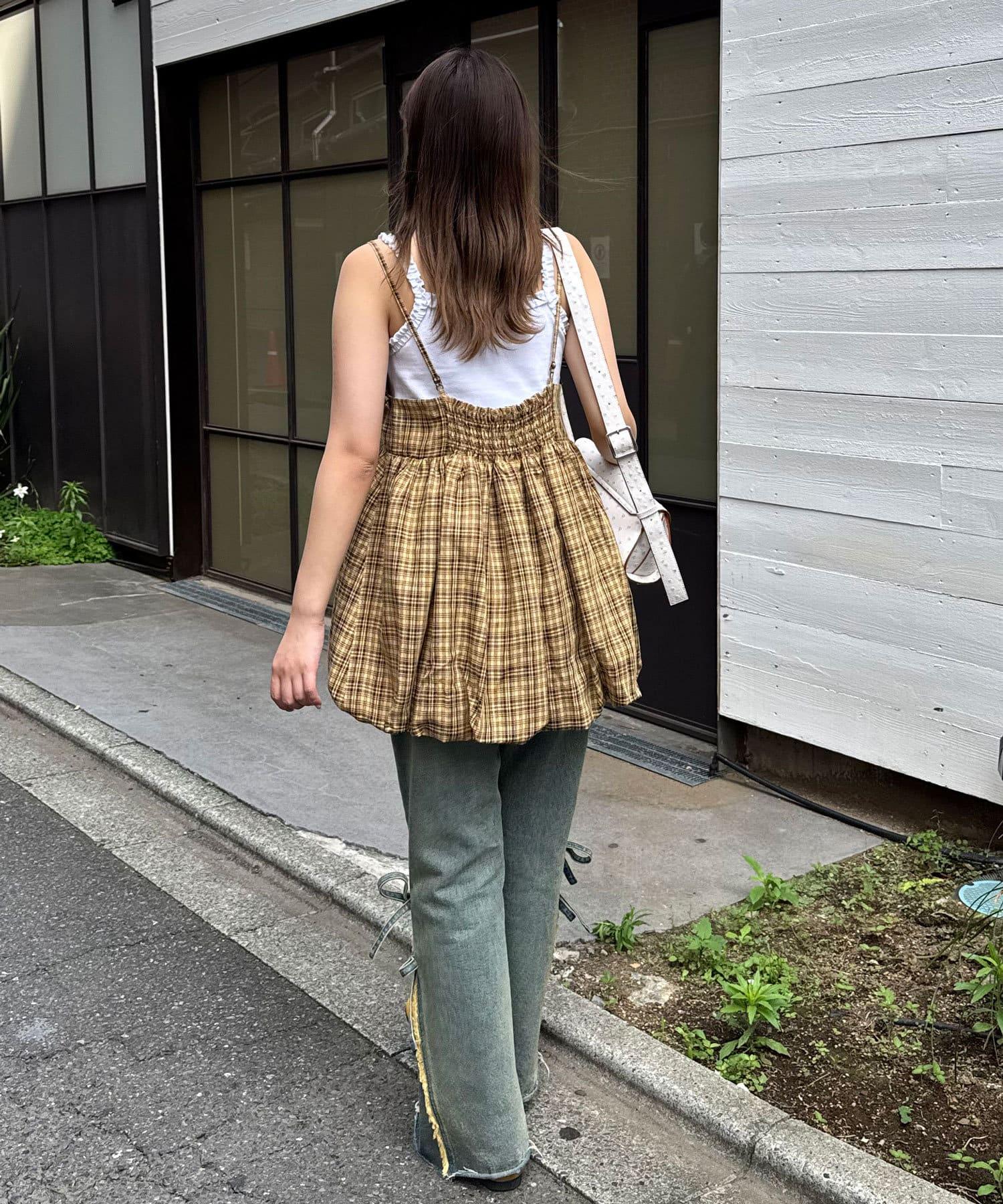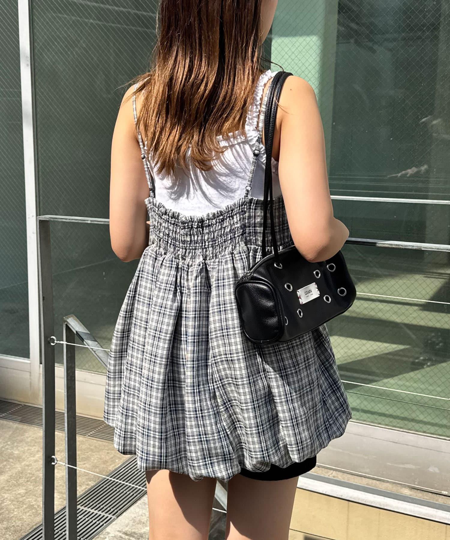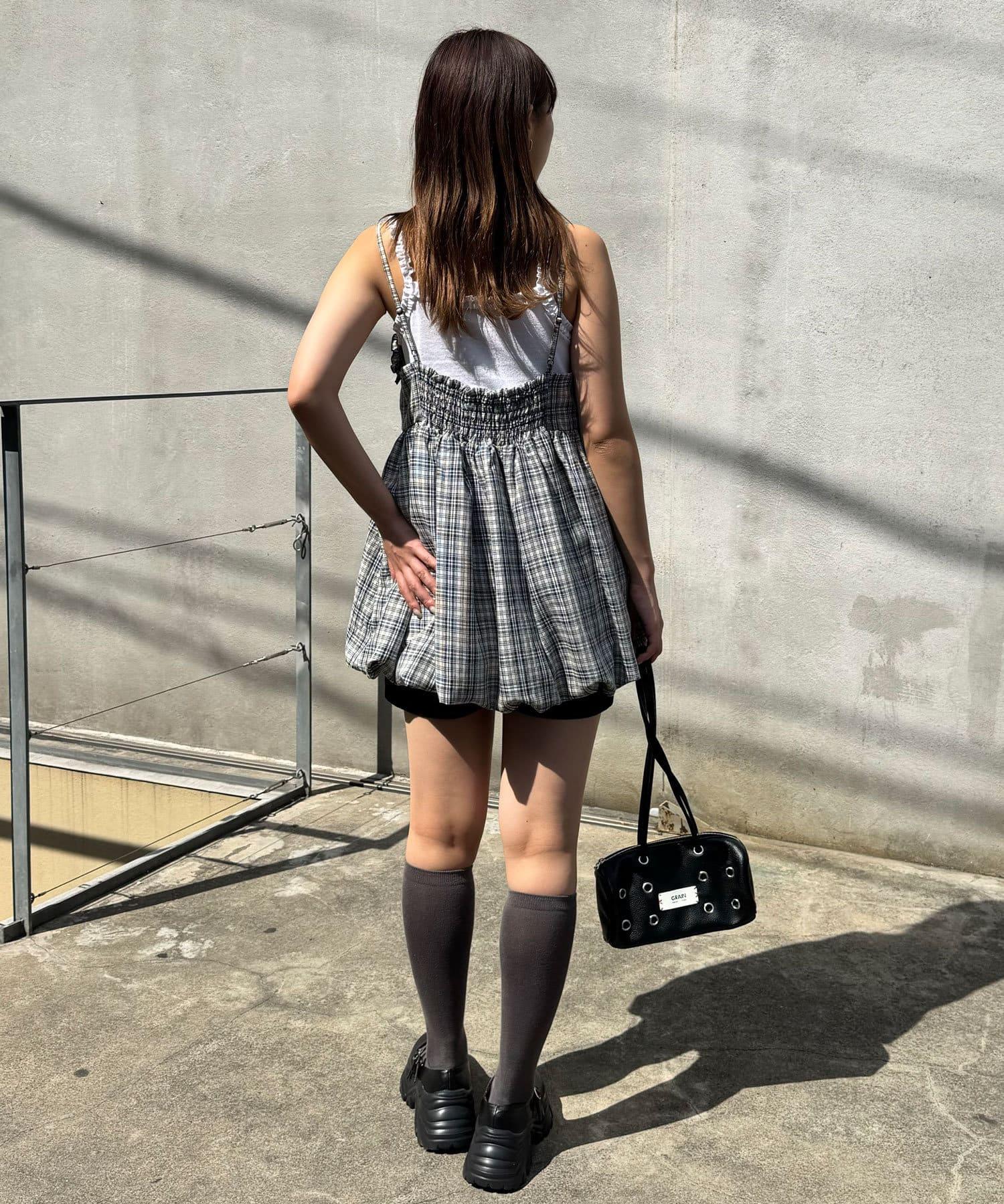 氣球吊帶半身裙,帶有可愛的復古流蘇格紋圖案。
