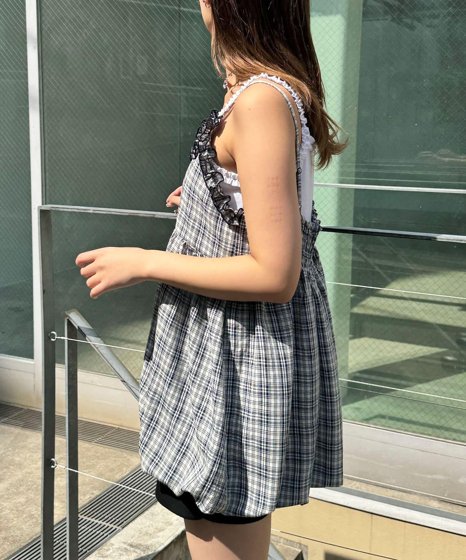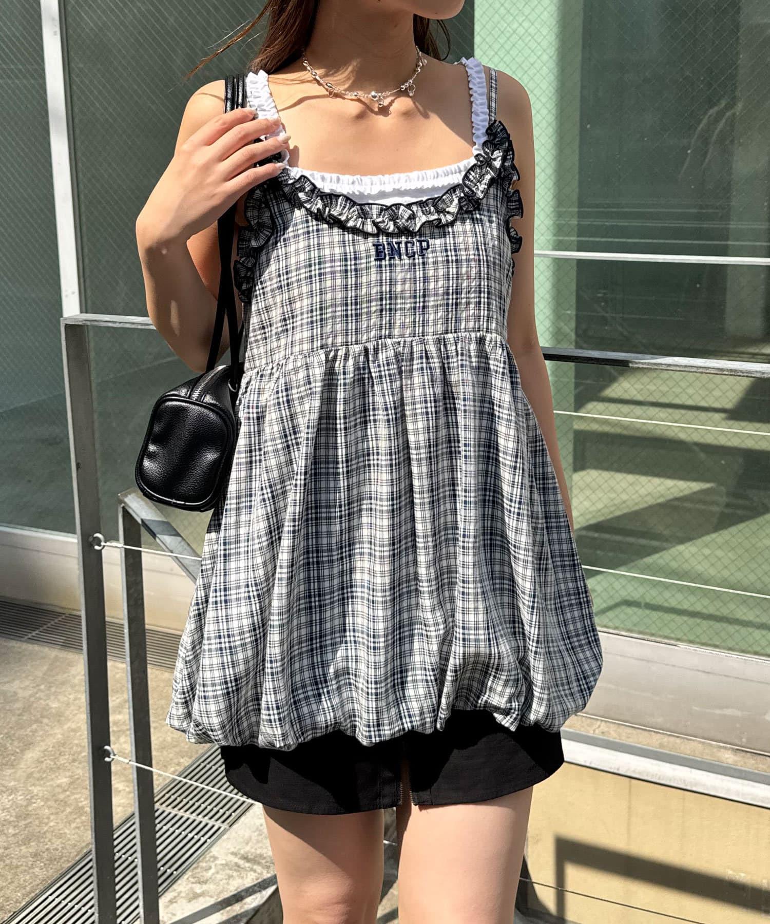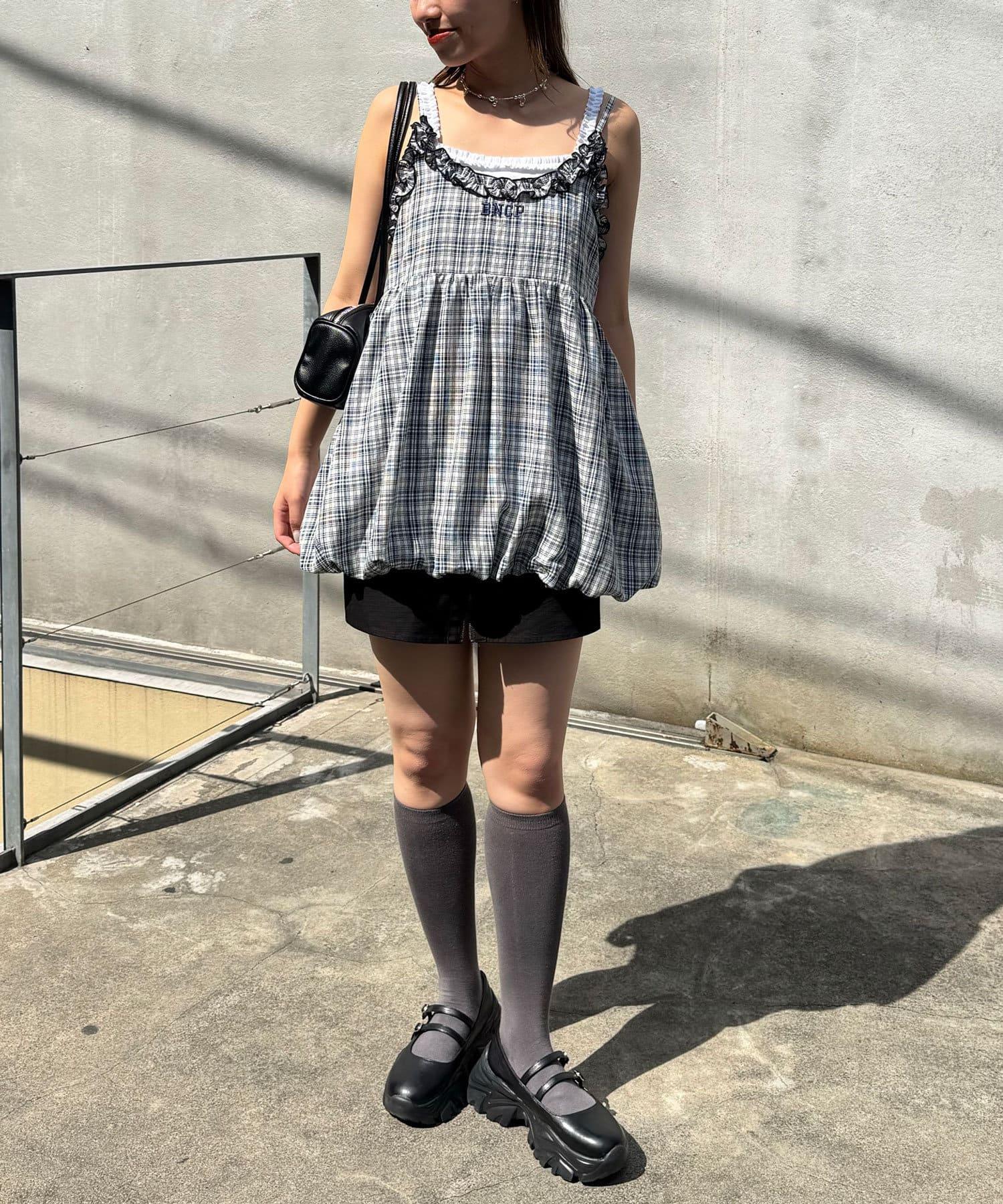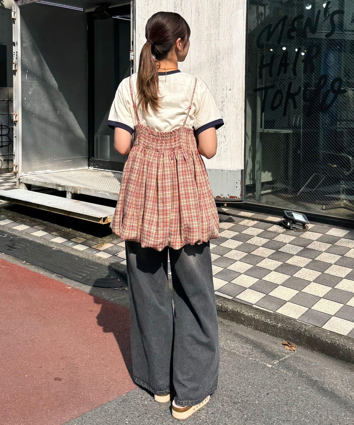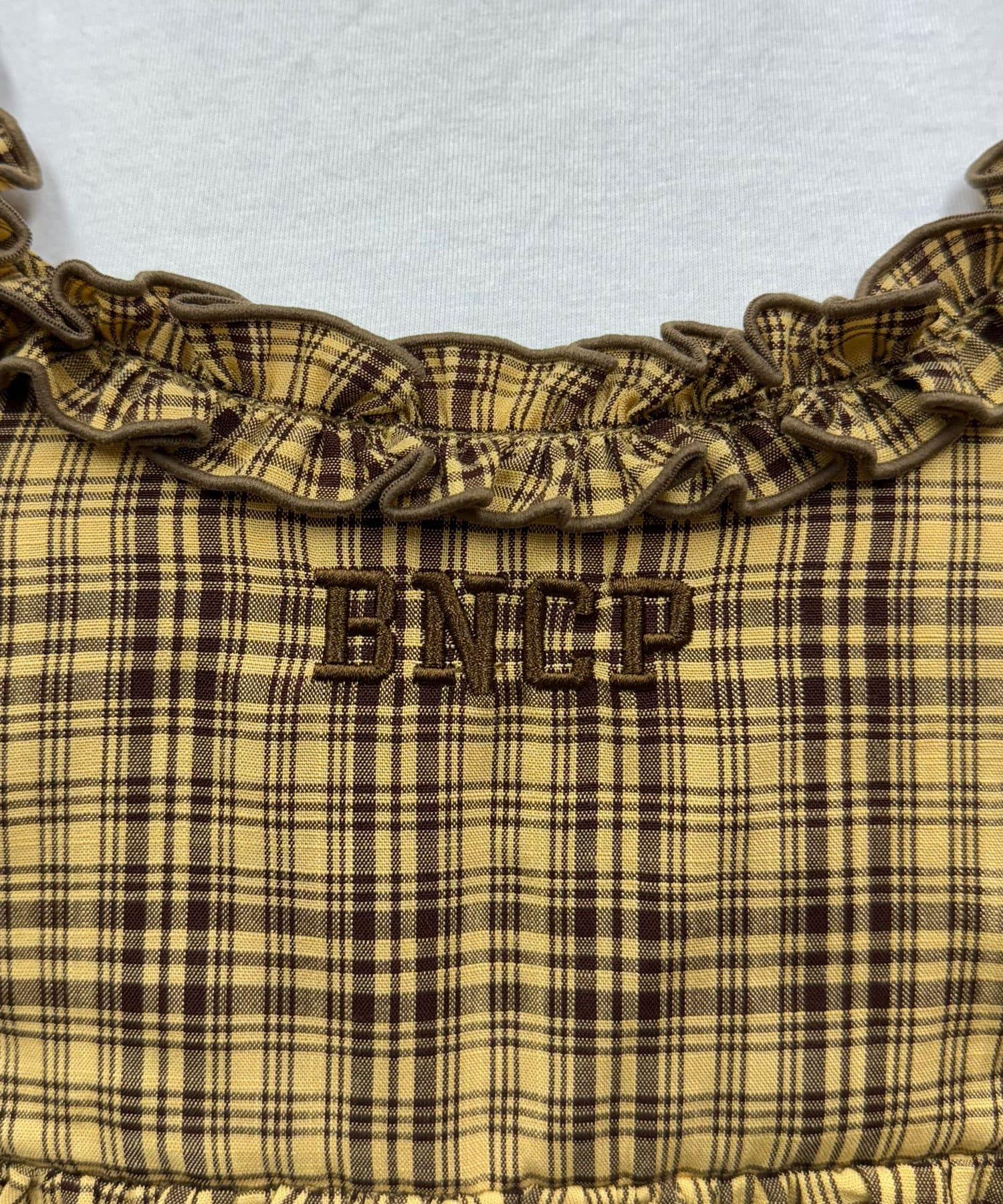 氣球吊帶半身裙,帶有可愛的復古流蘇格紋圖案。