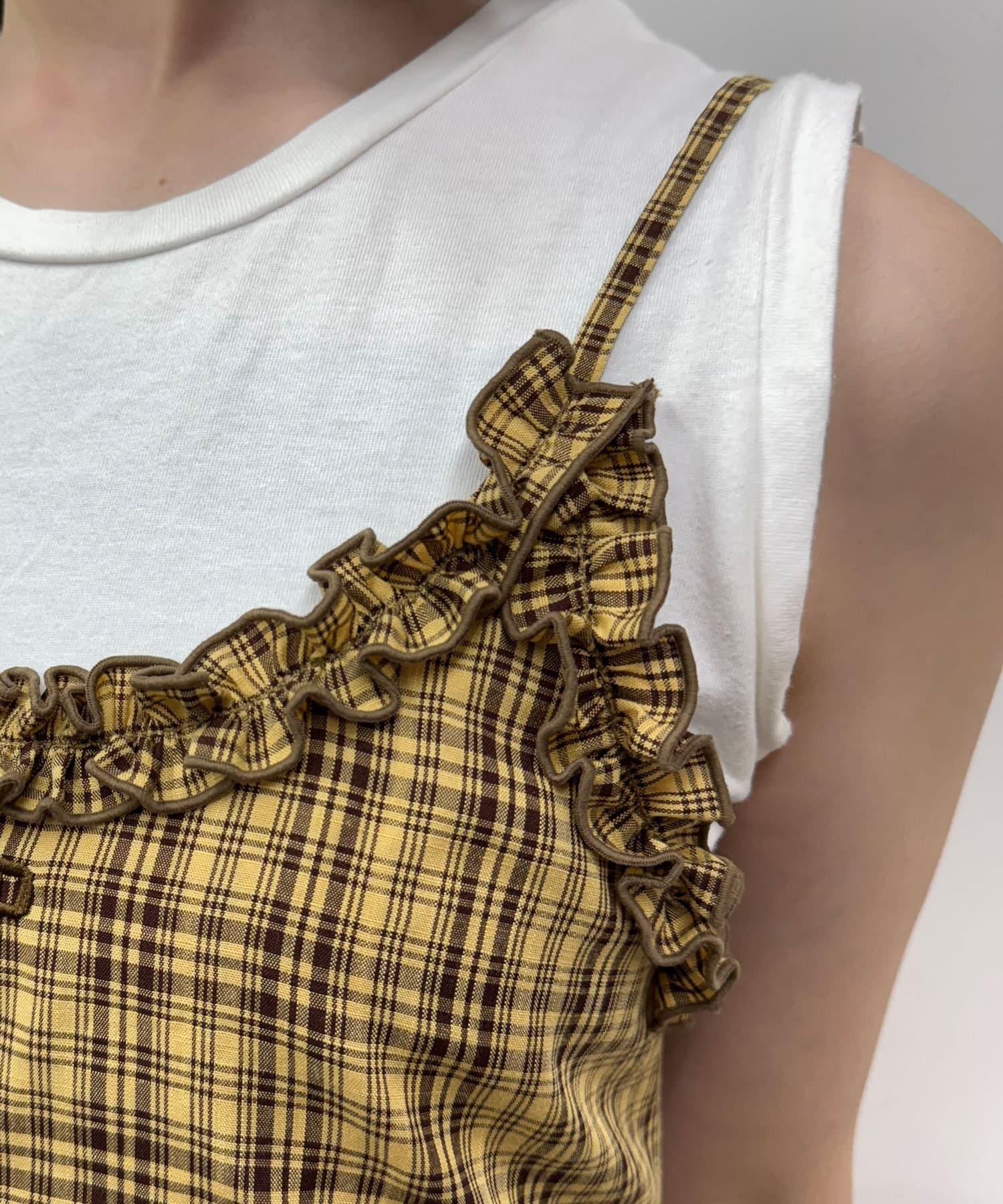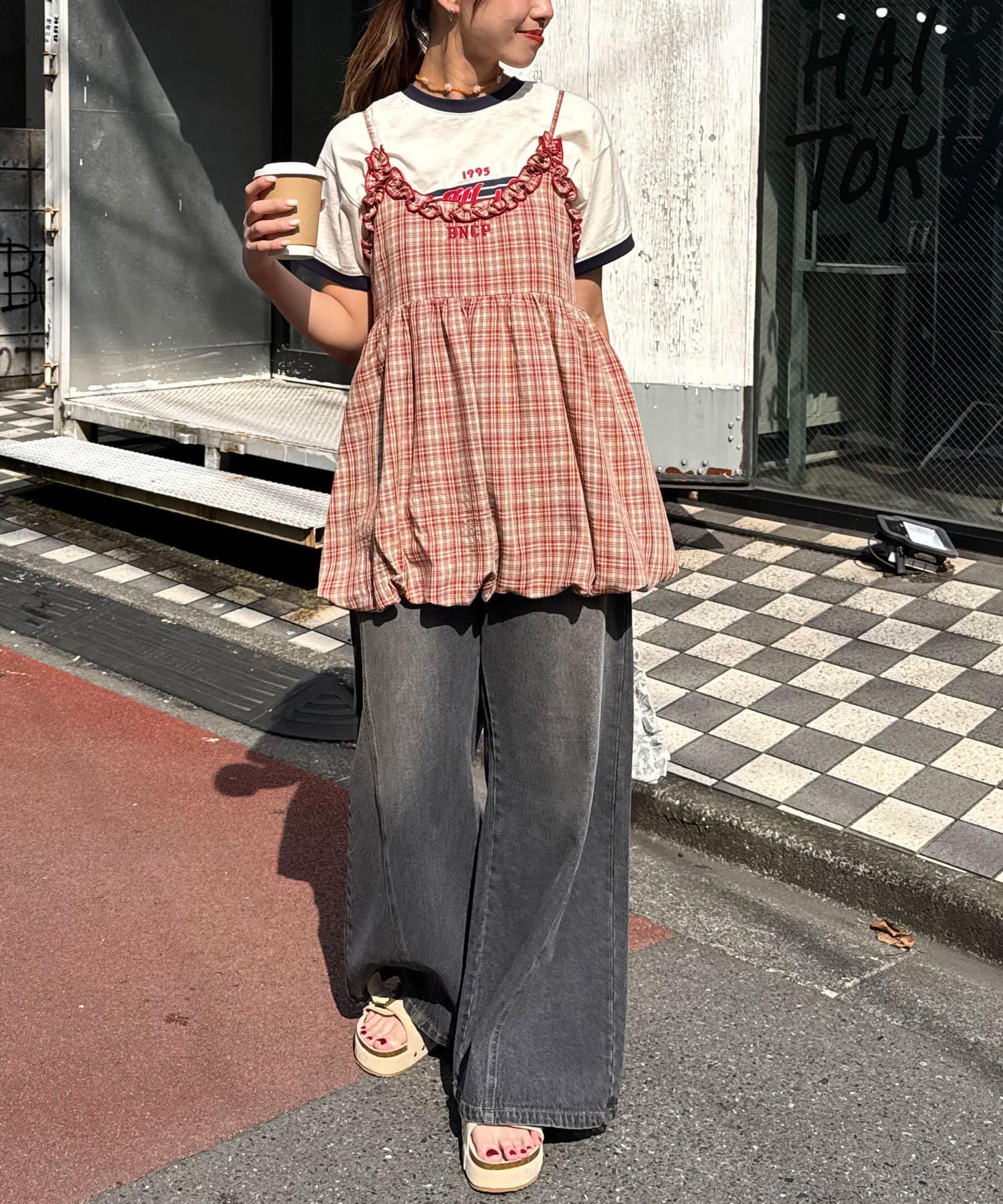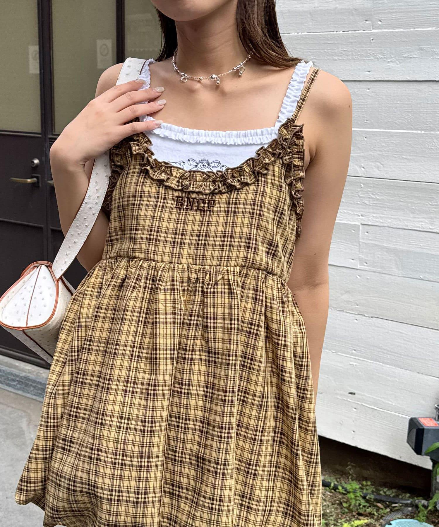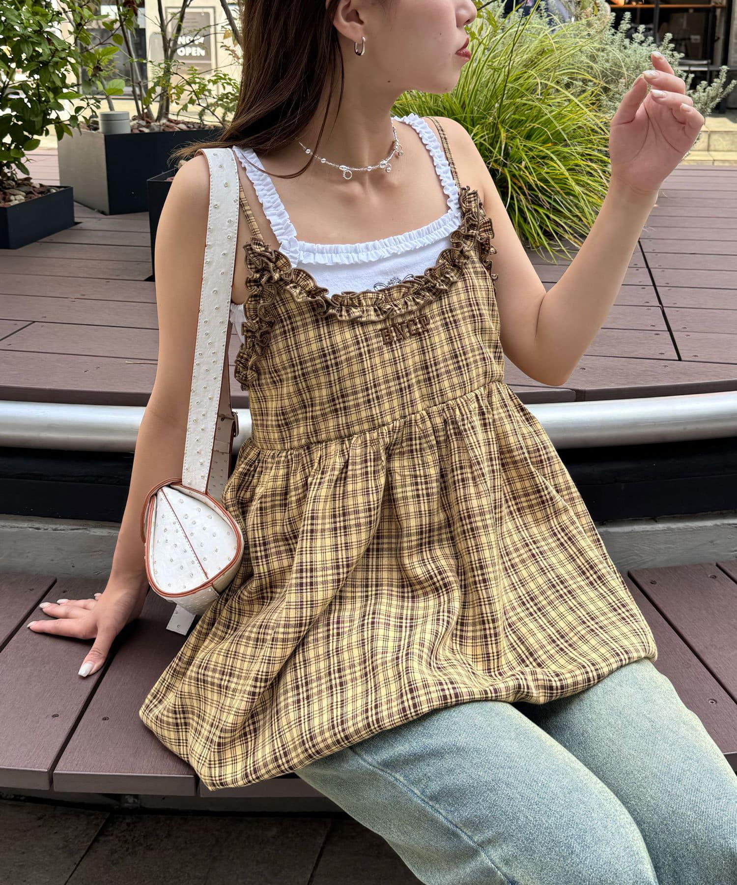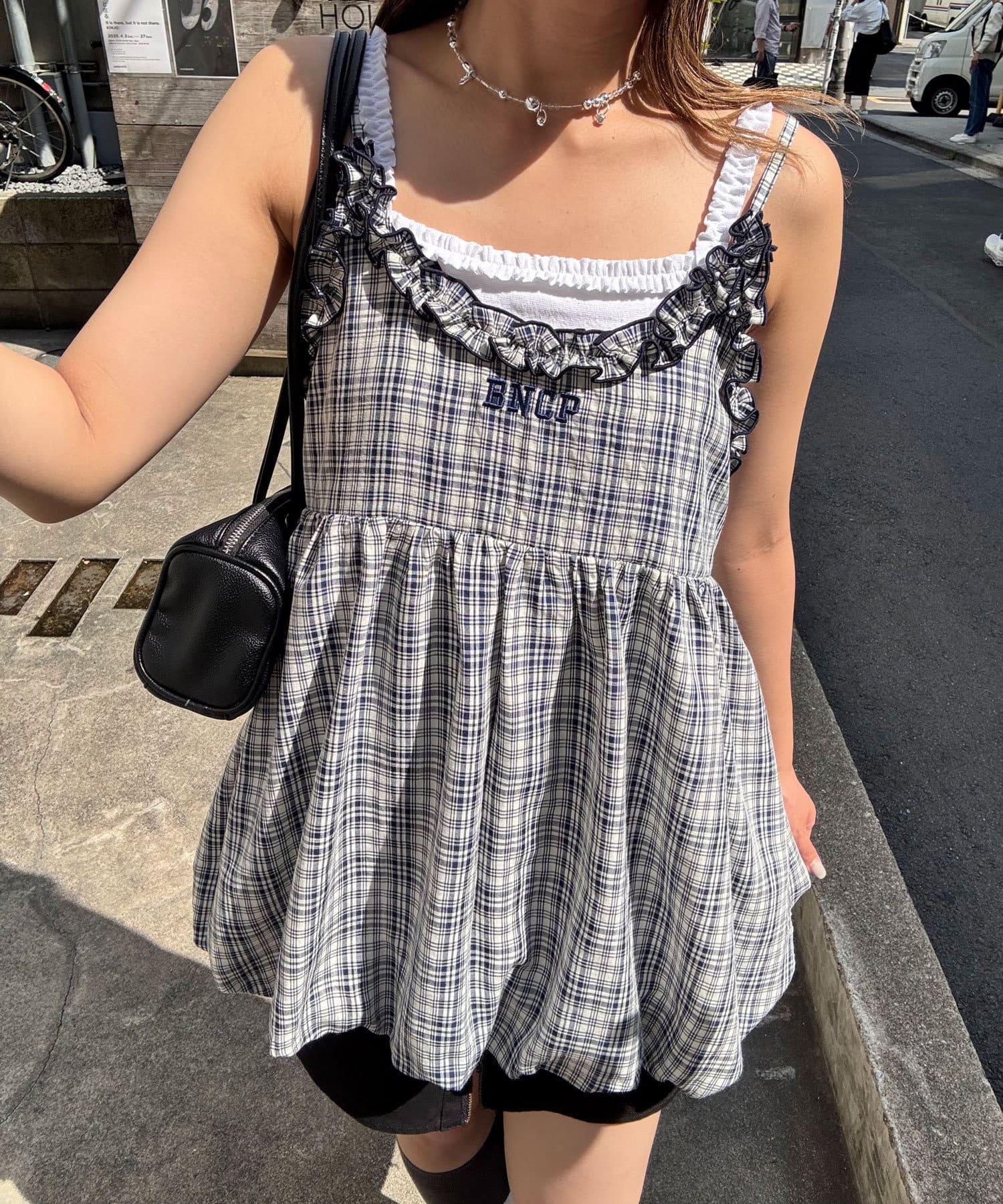 氣球吊帶半身裙,帶有可愛的復古流蘇格紋圖案。