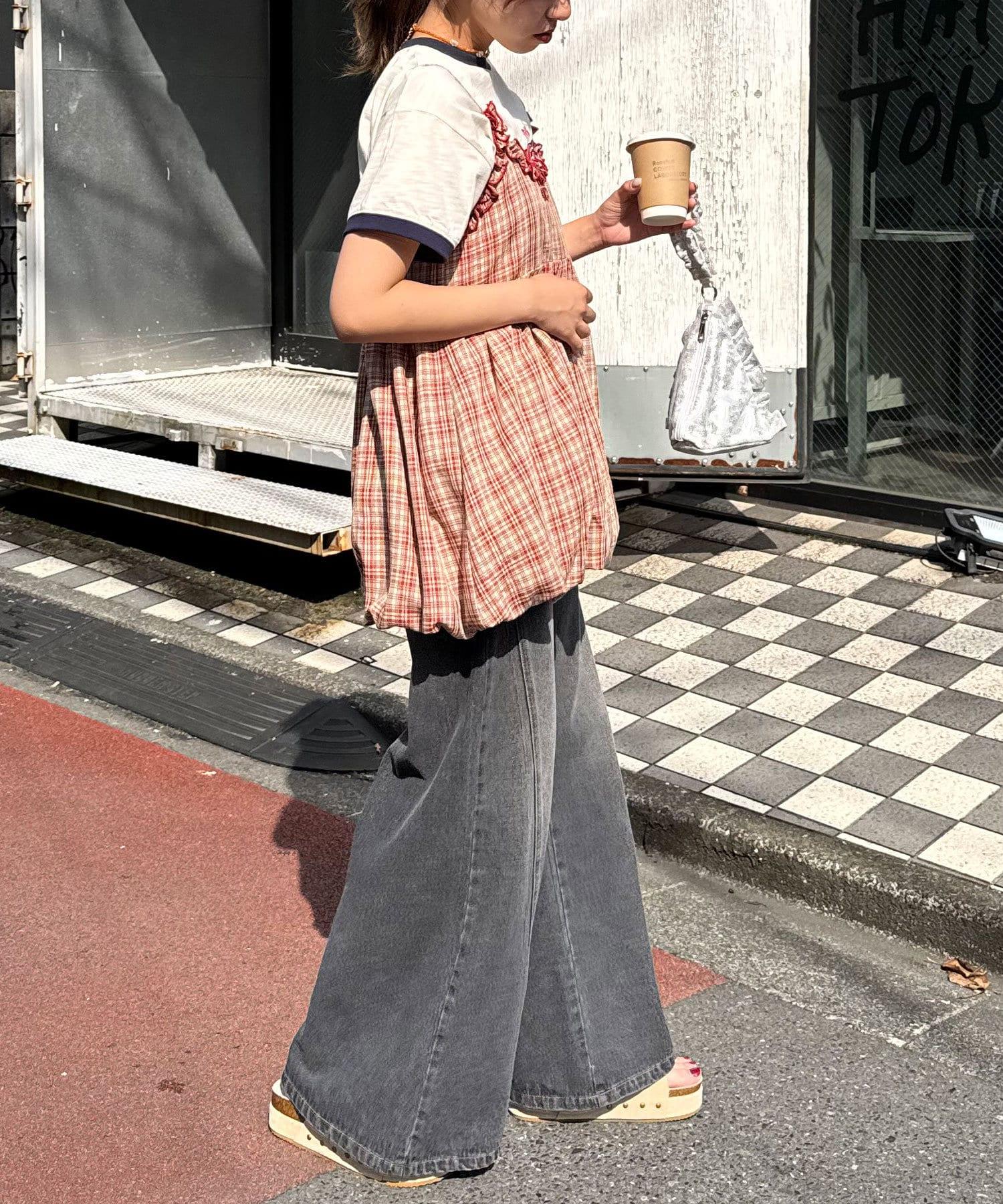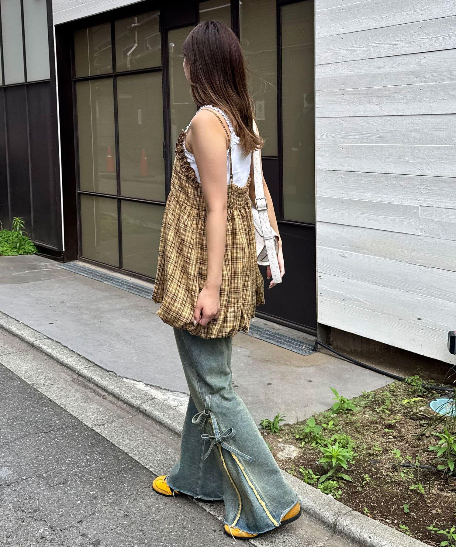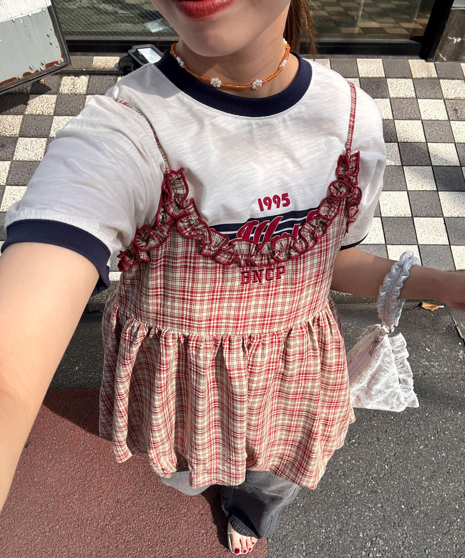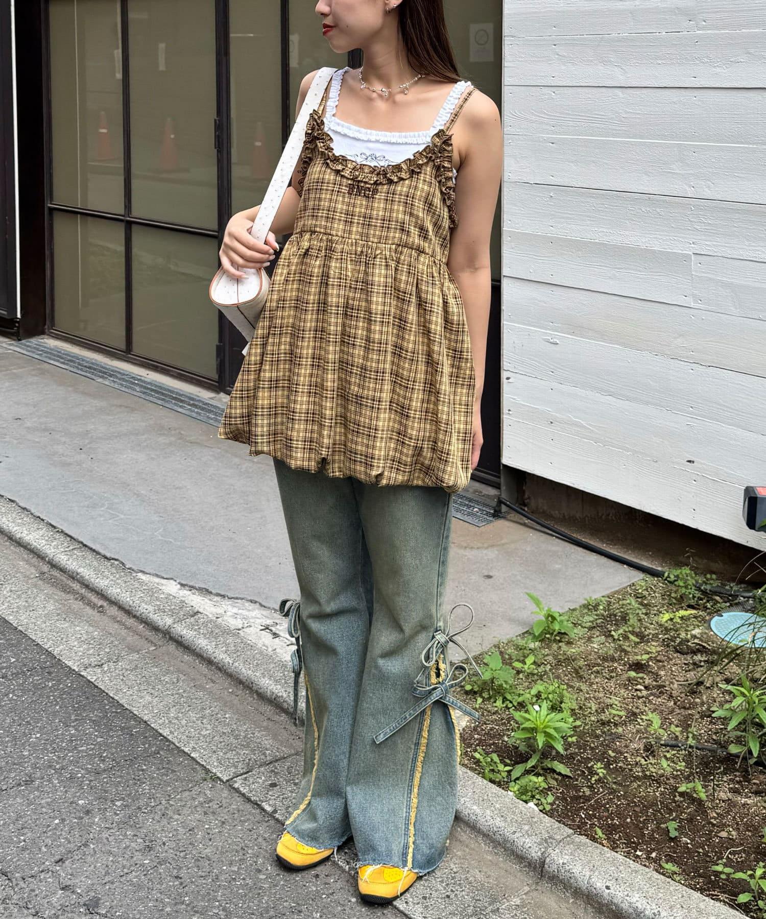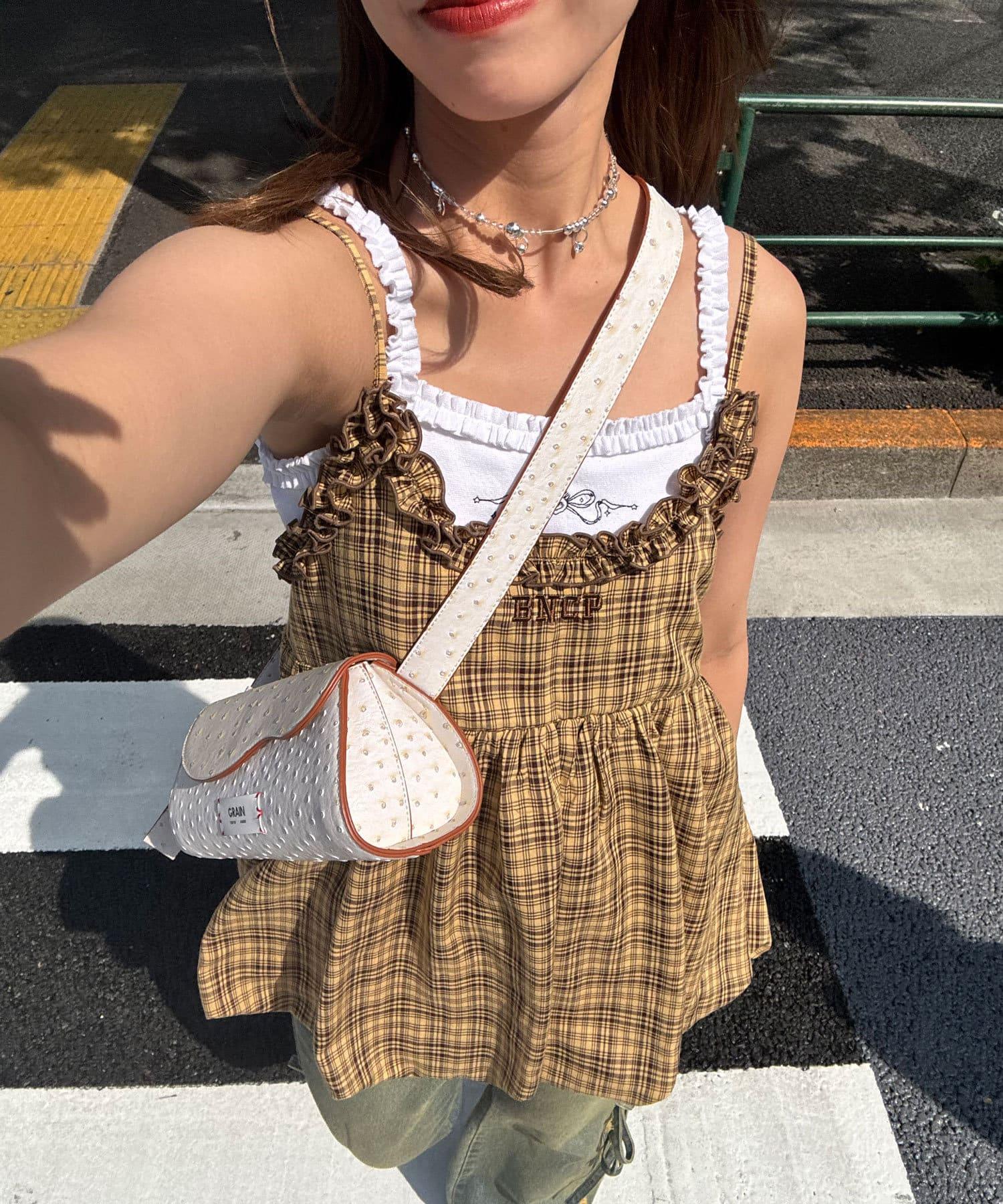 氣球吊帶半身裙,帶有可愛的復古流蘇格紋圖案。