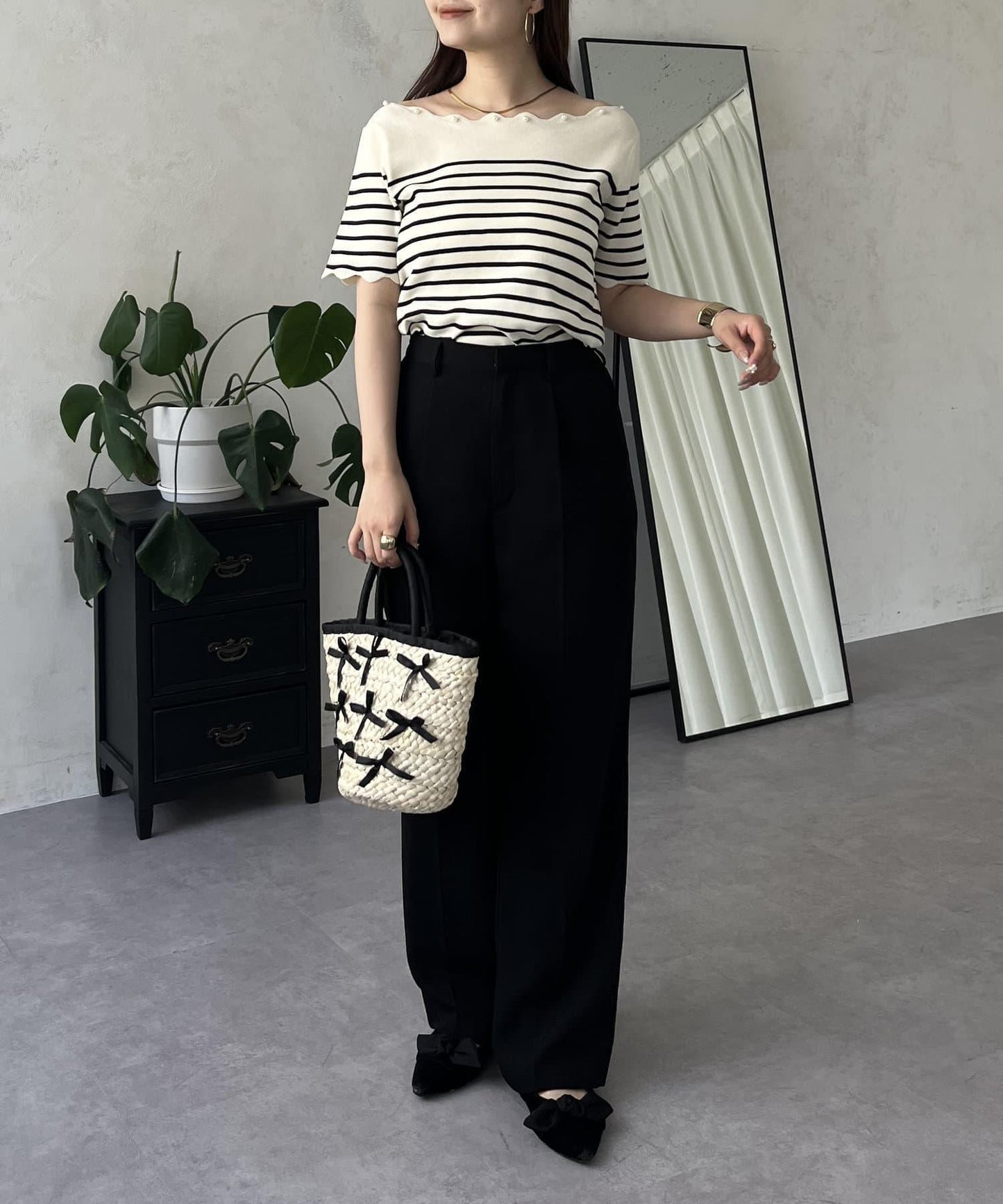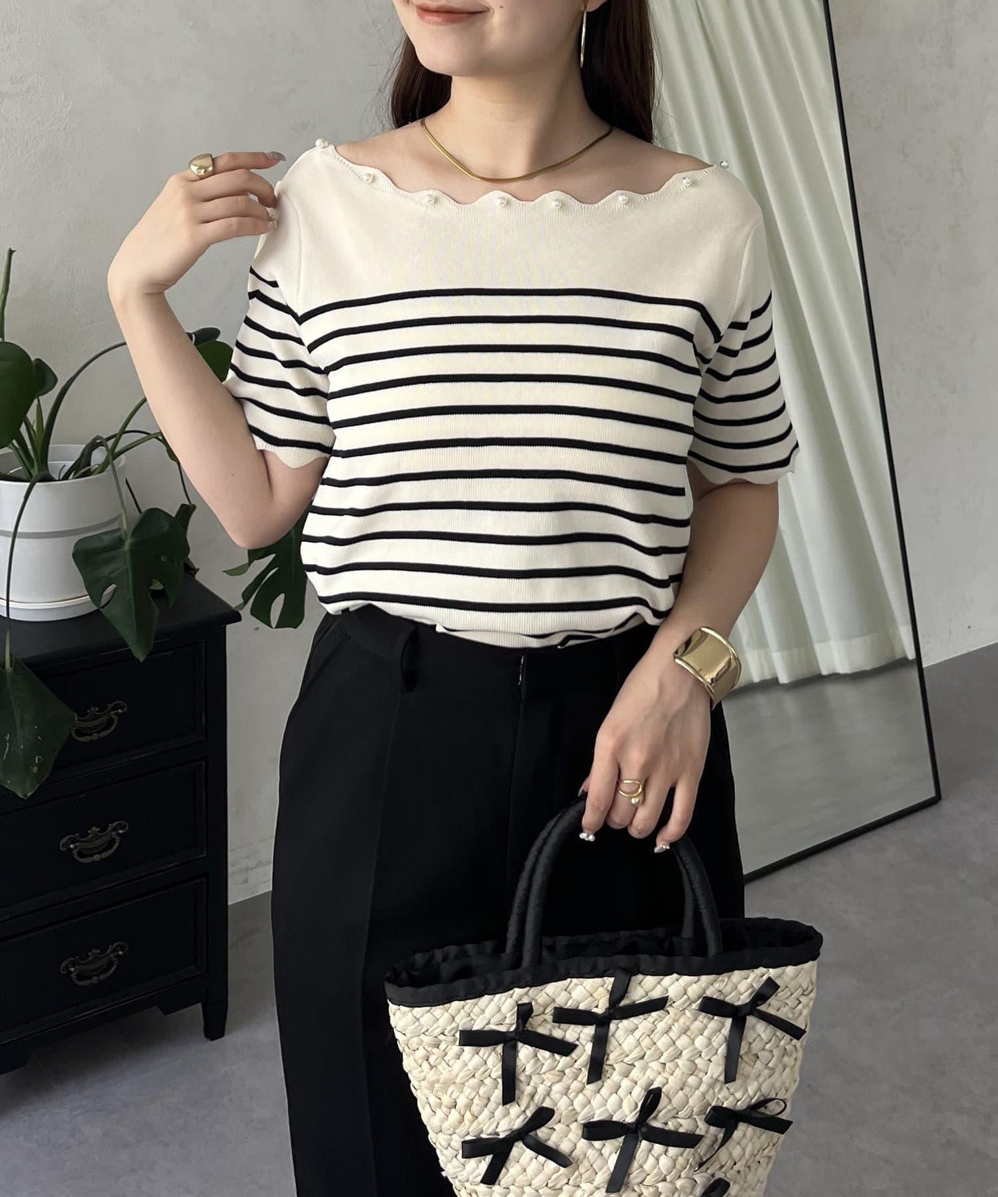 優雅的船領針織上衣。