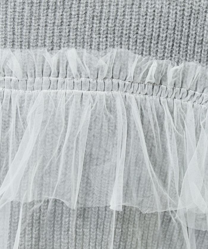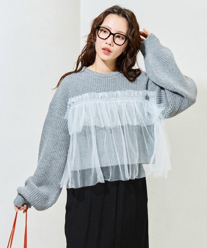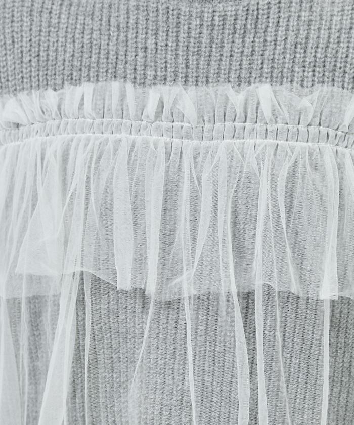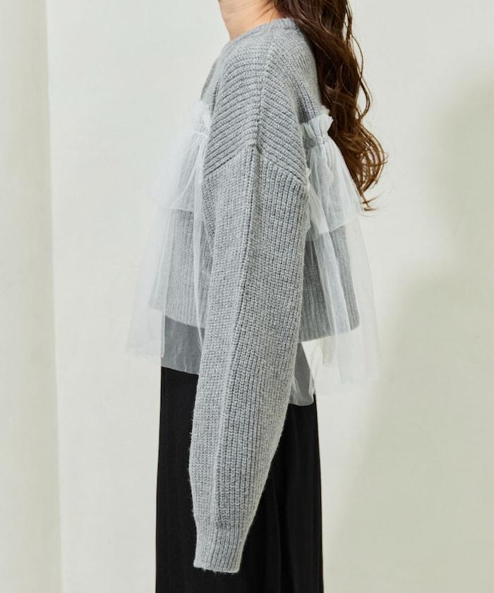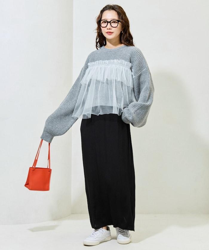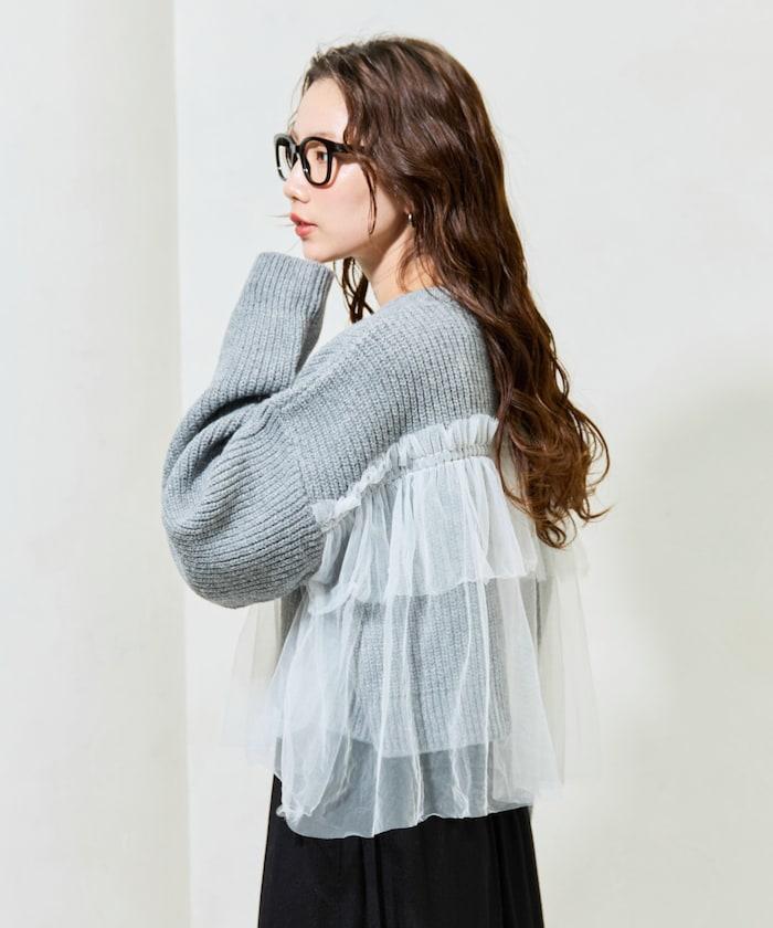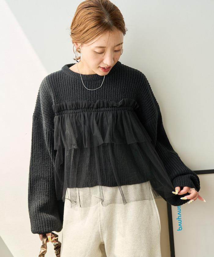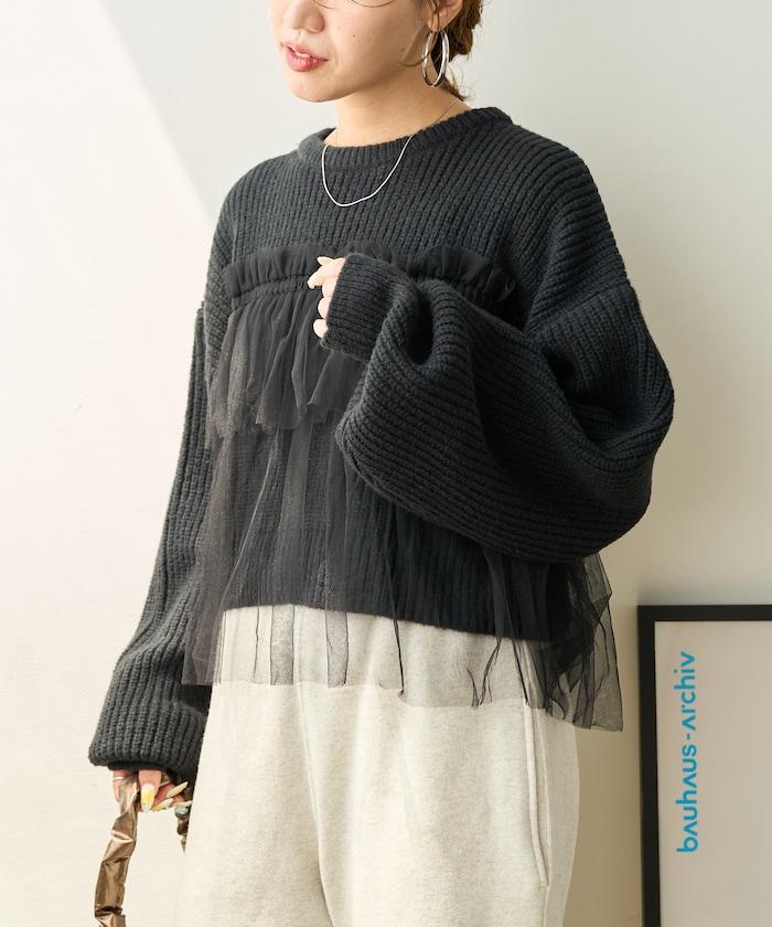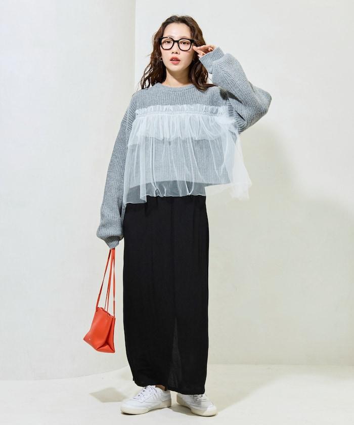 針織部分是時下流行的短款,顯得乾淨利落,薄紗則遮住腰部。
