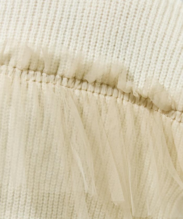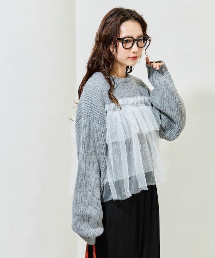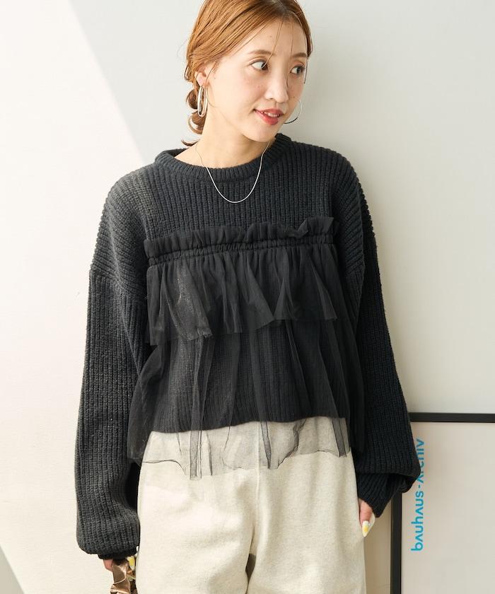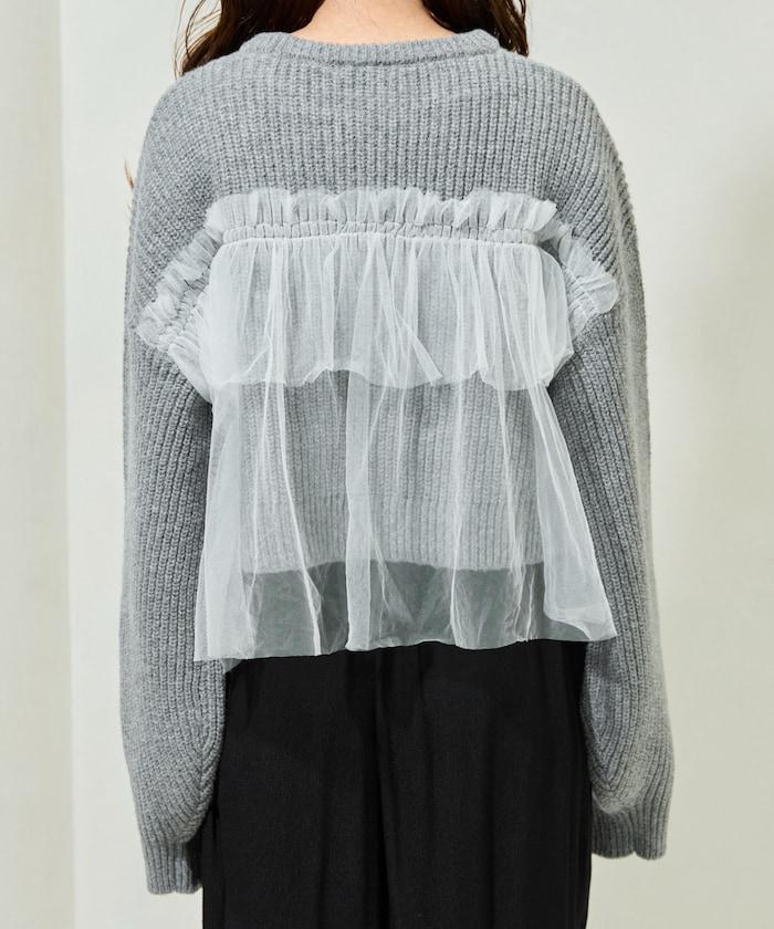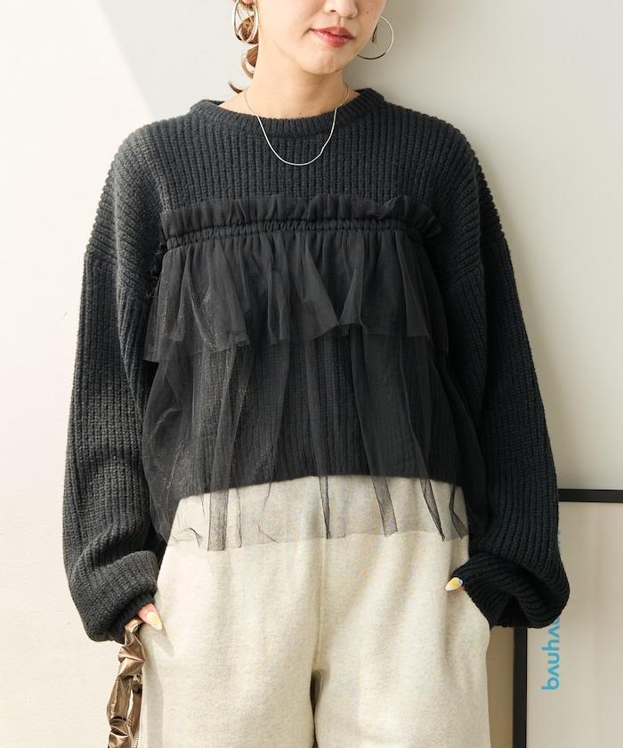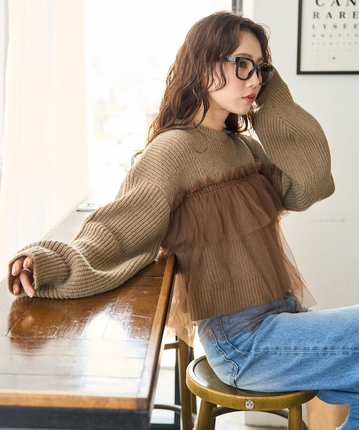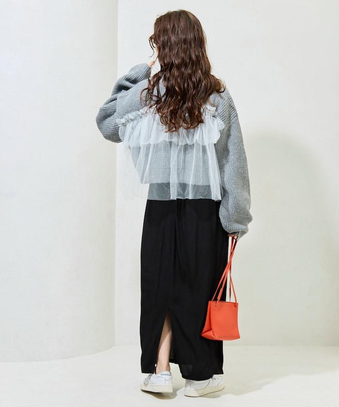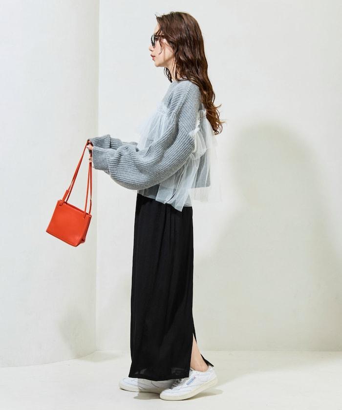 針織部分是時下流行的短款,顯得乾淨利落,薄紗則遮住腰部。