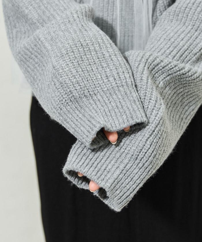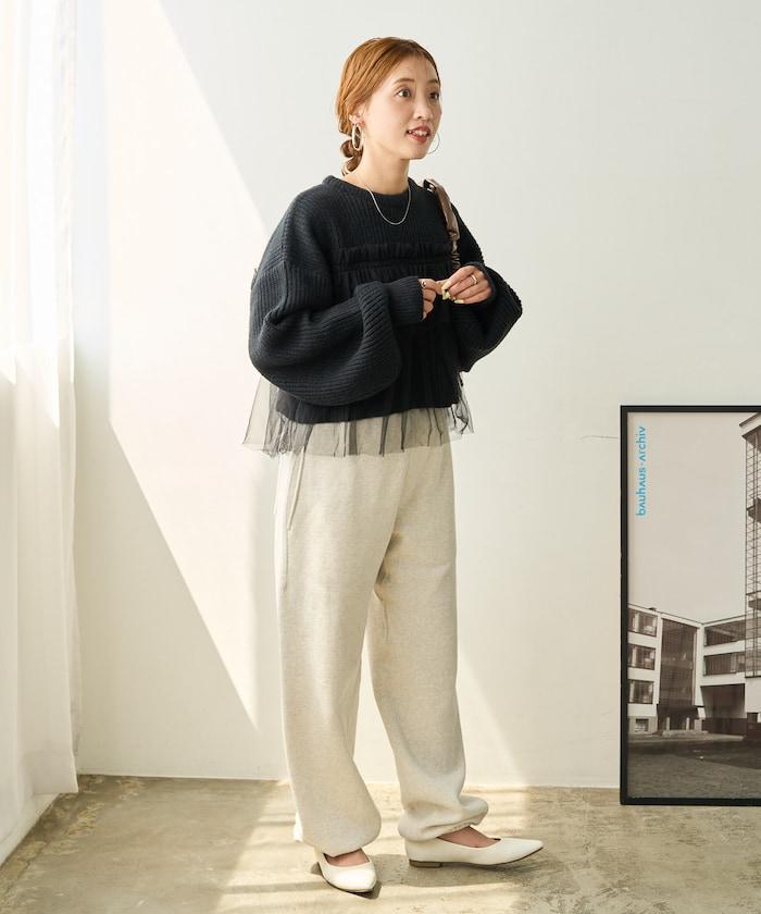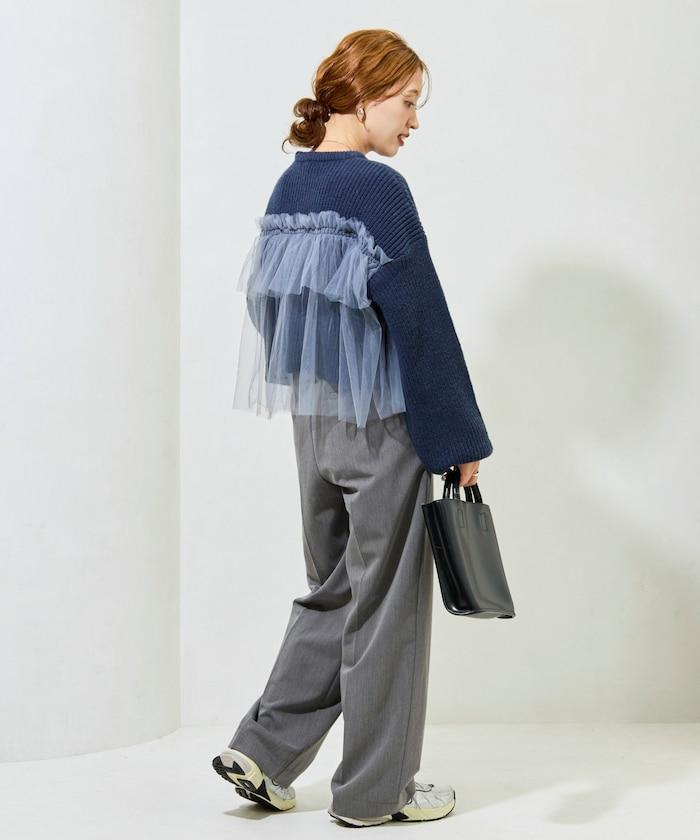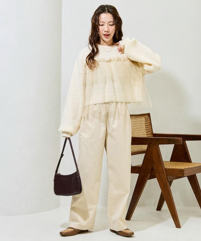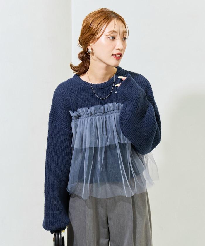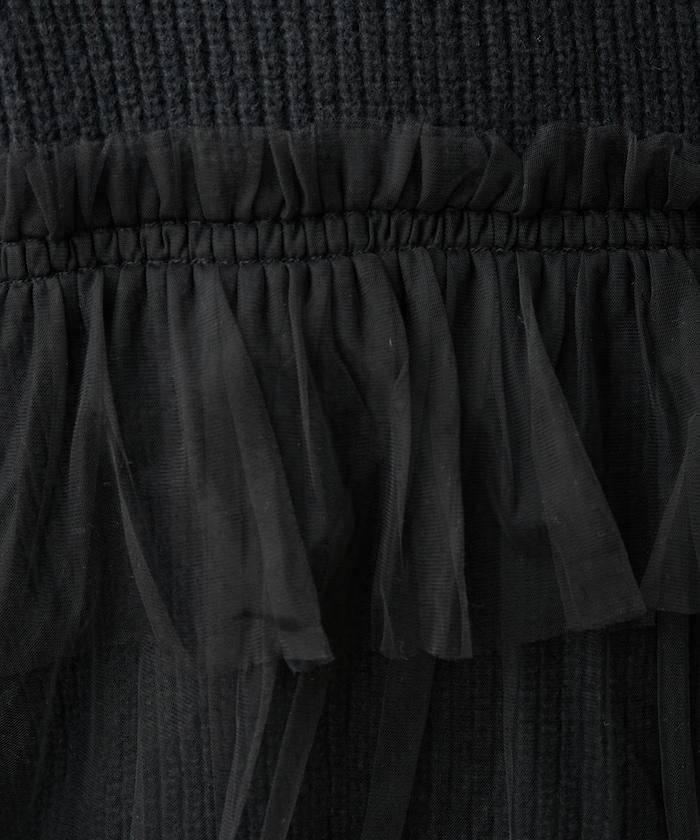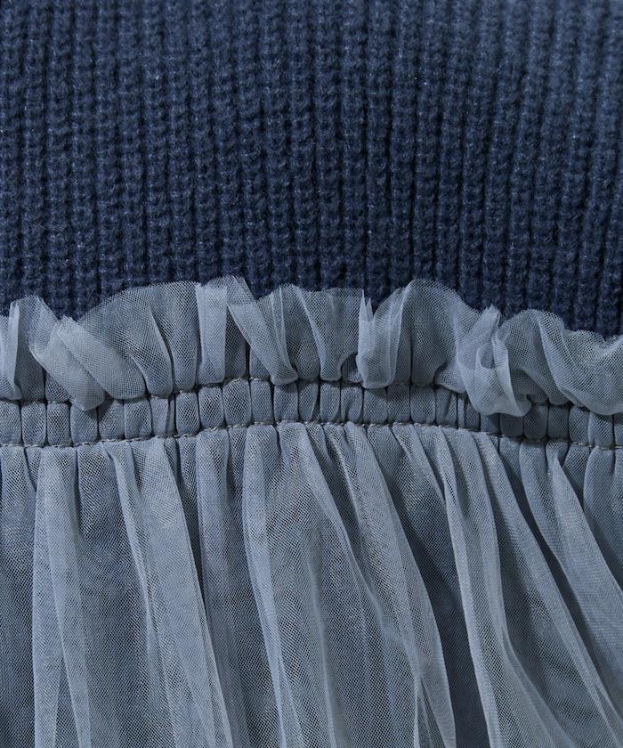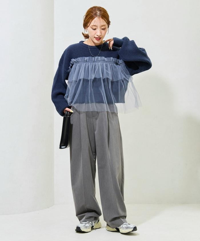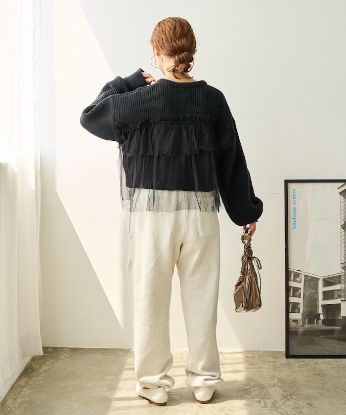 針織部分是時下流行的短款,顯得乾淨利落,薄紗則遮住腰部。
