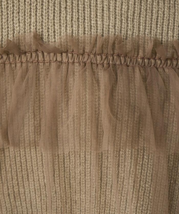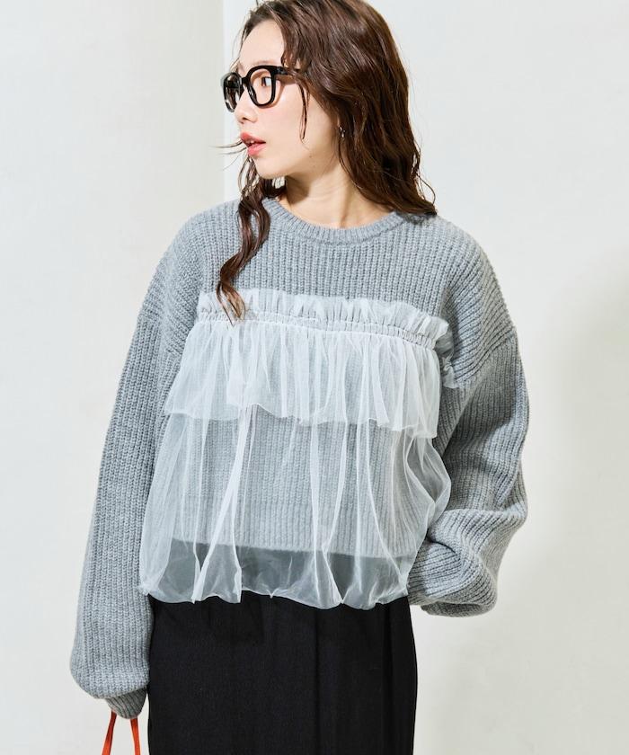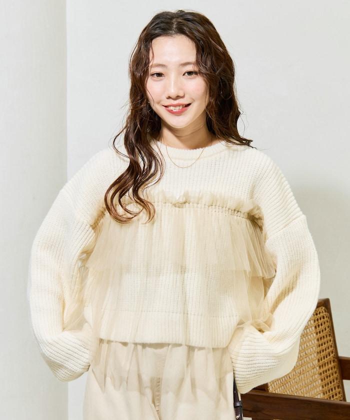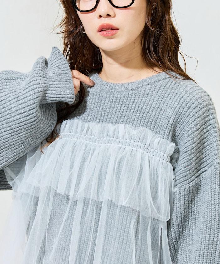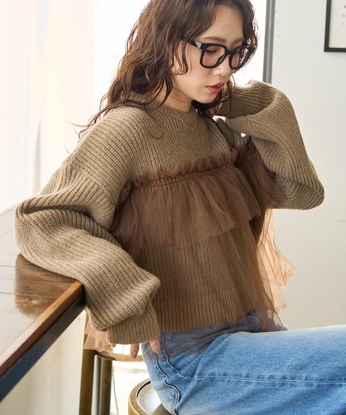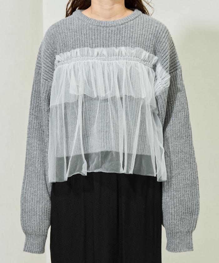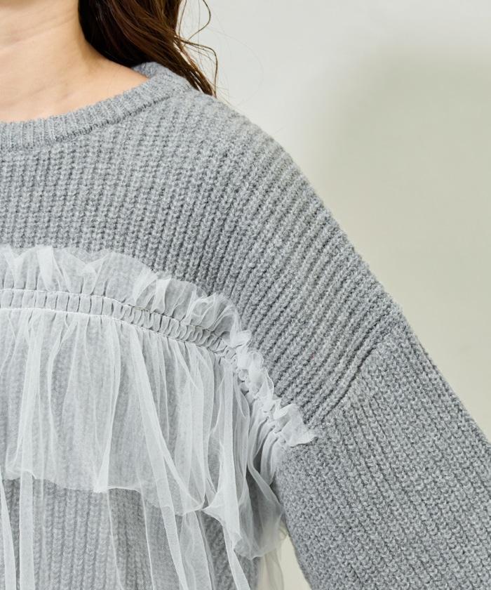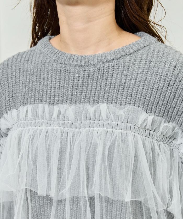 荷葉邊網紗拼接單面針織套頭衫