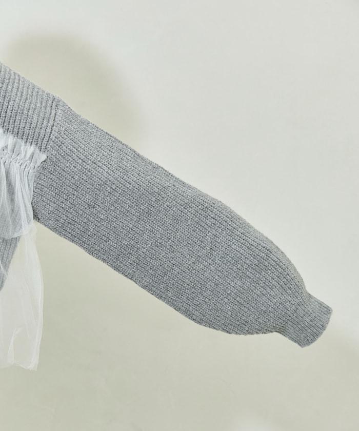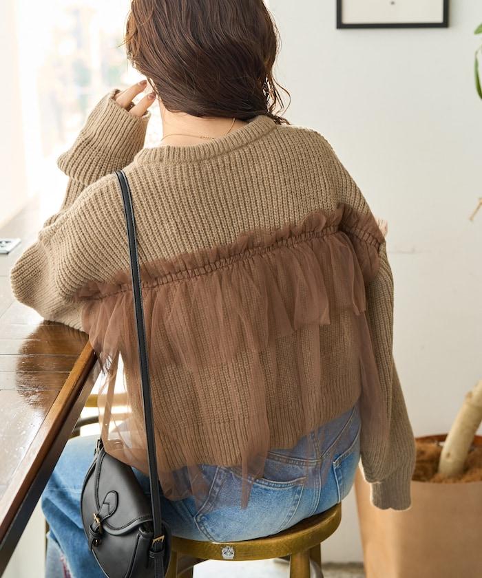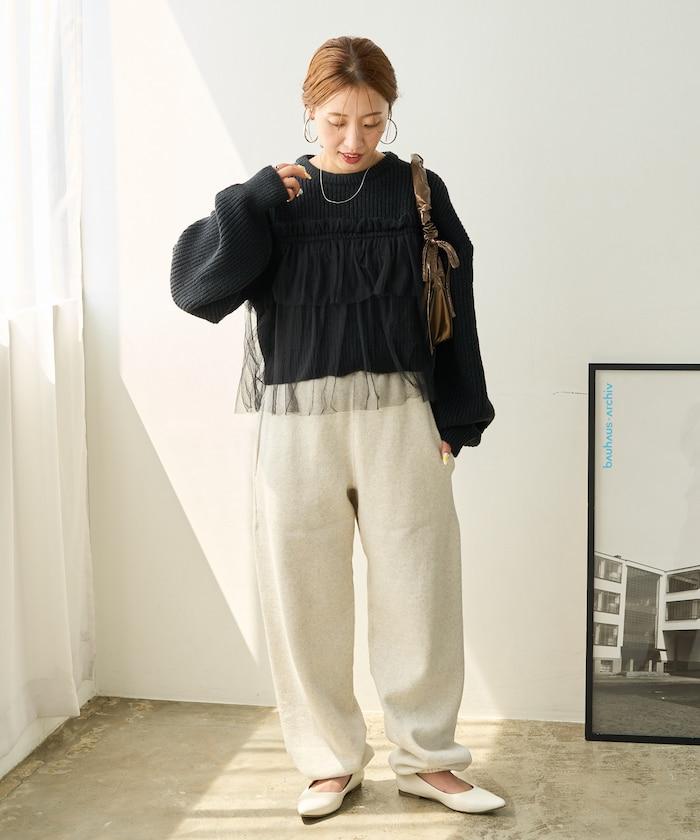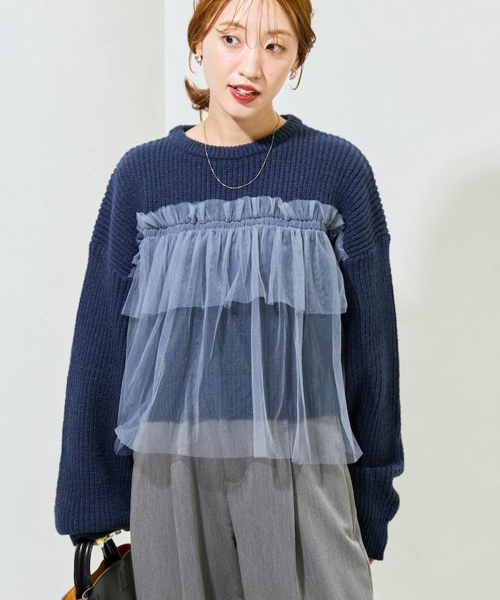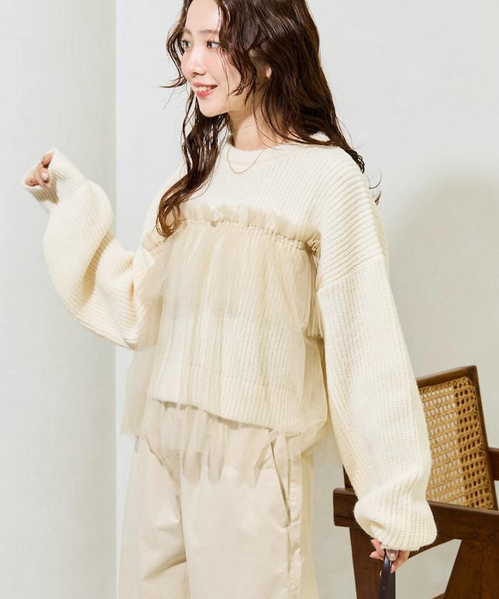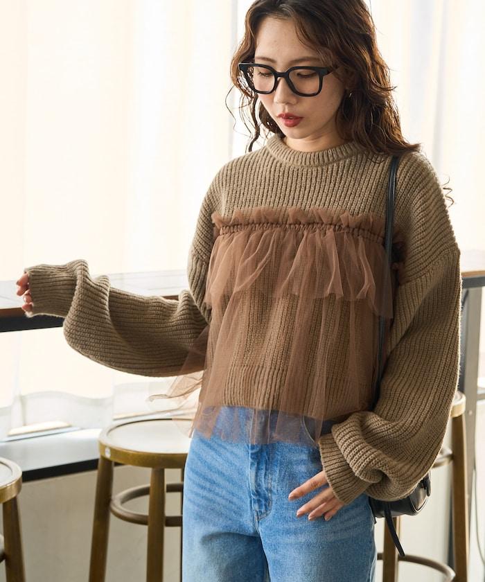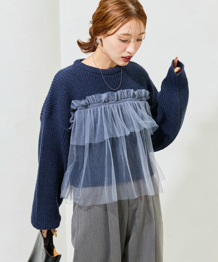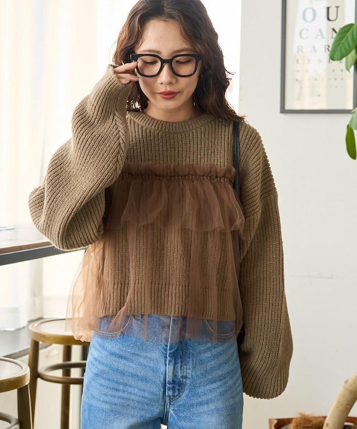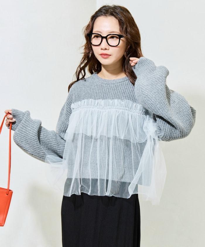 荷葉邊網紗拼接單面針織套頭衫