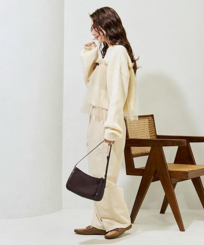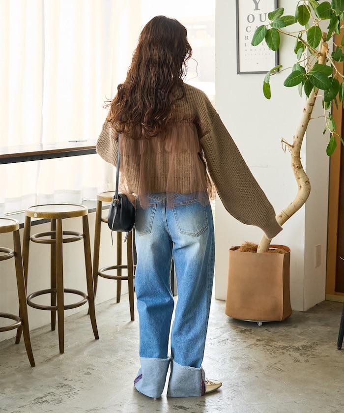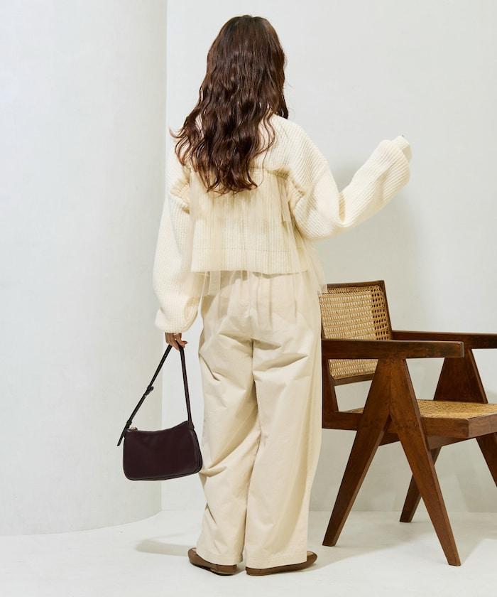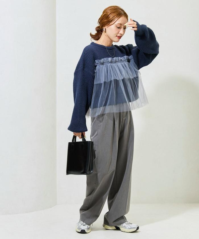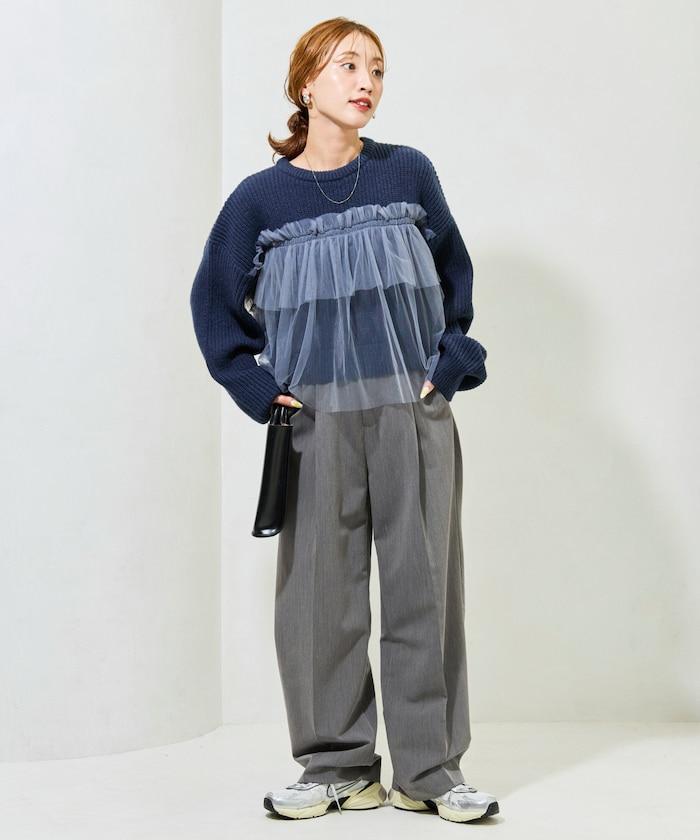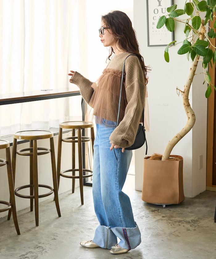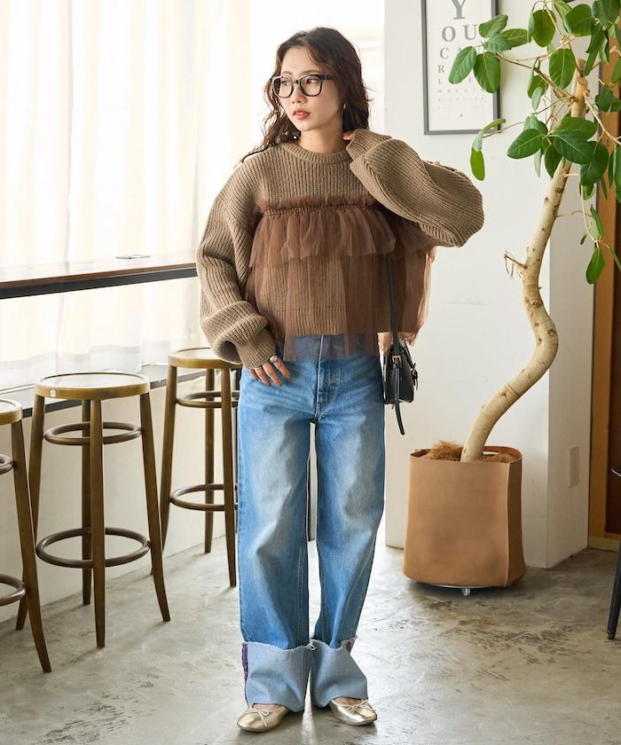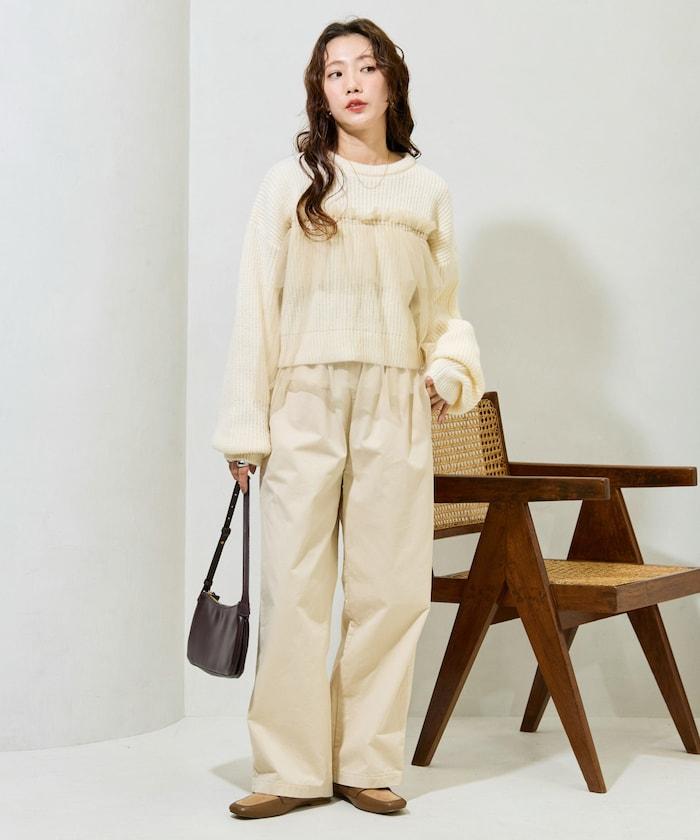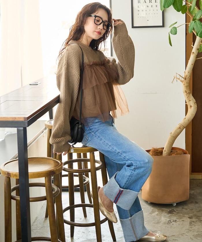 大面積聚攏的薄紗所帶來的甜美感,可搭配修身牛仔褲或錐形褲,打造可愛與成熟的平衡。