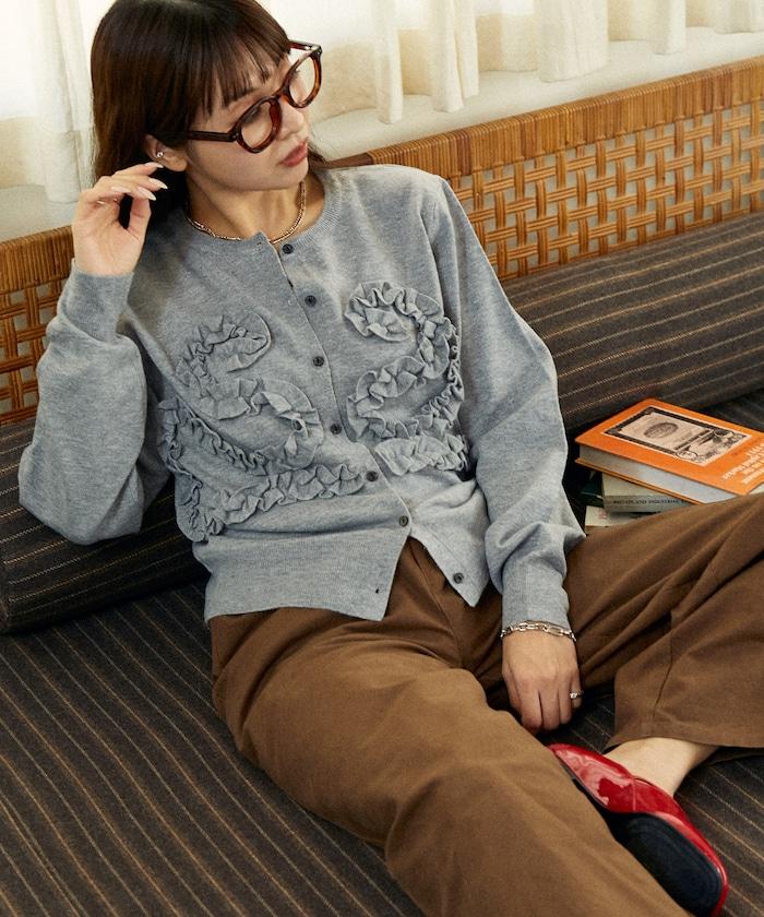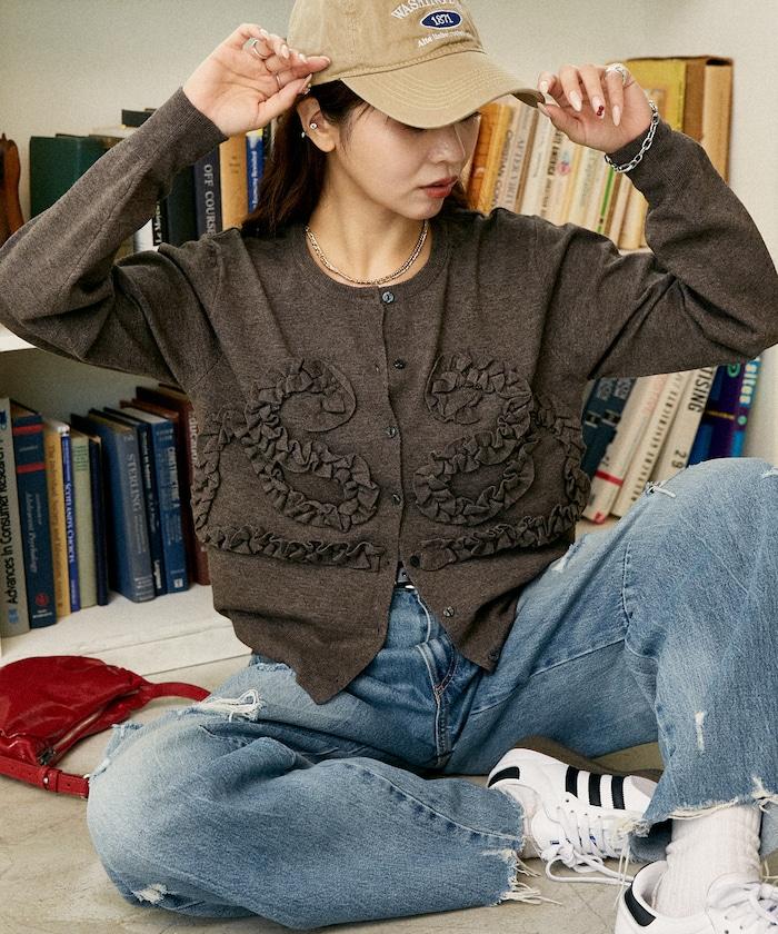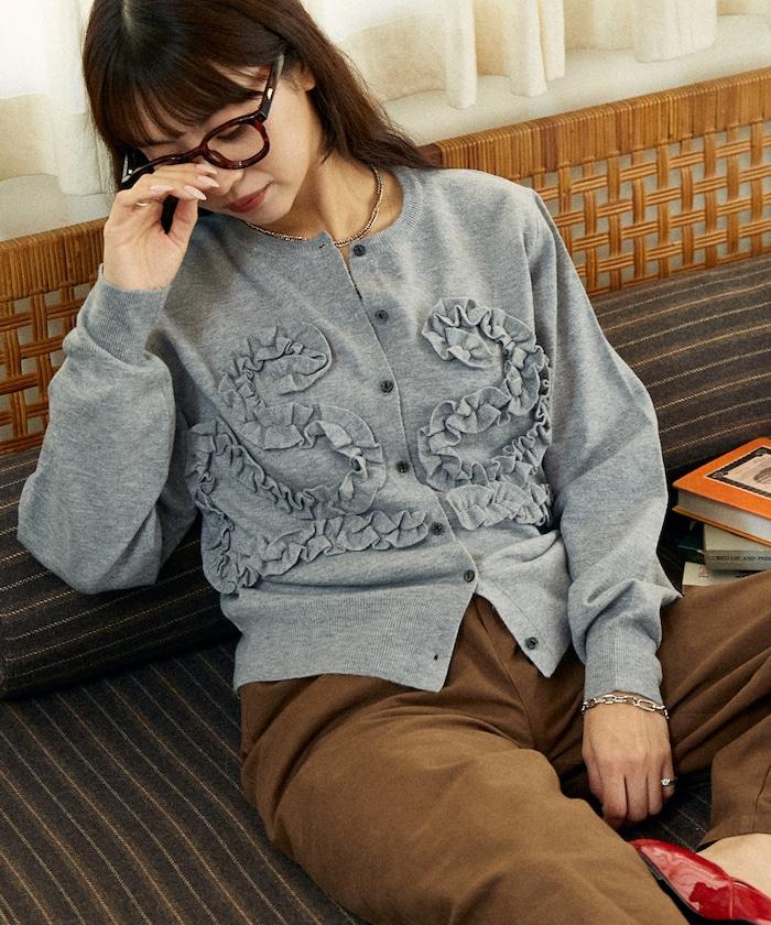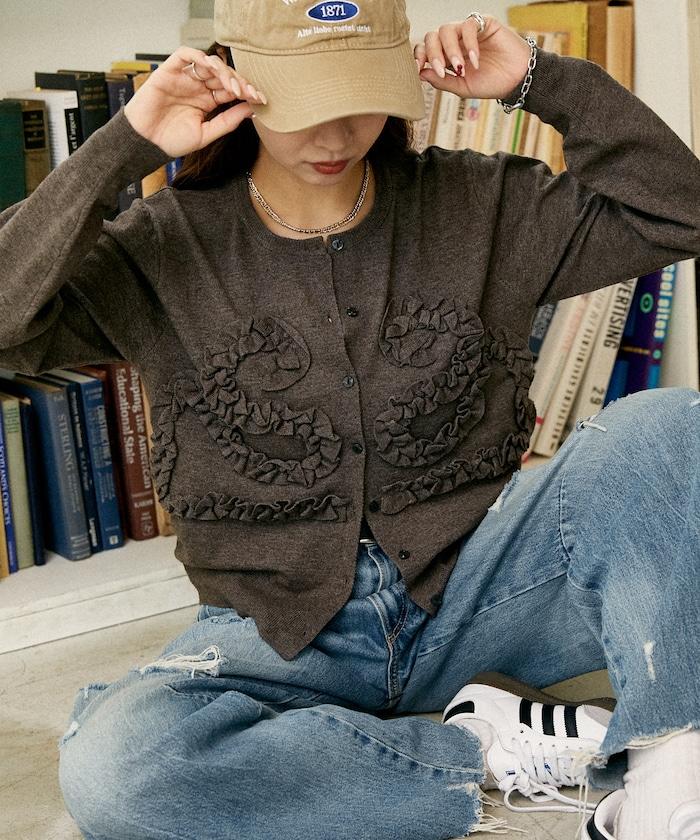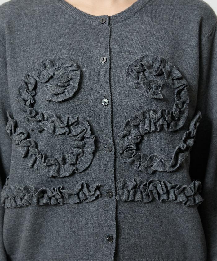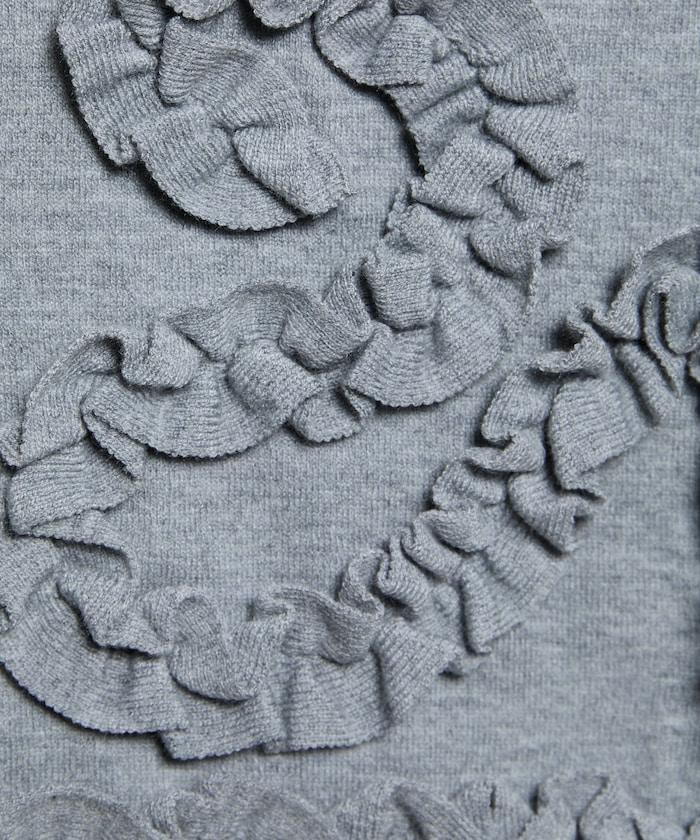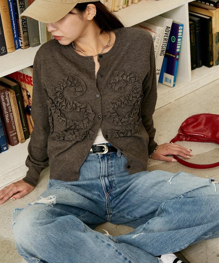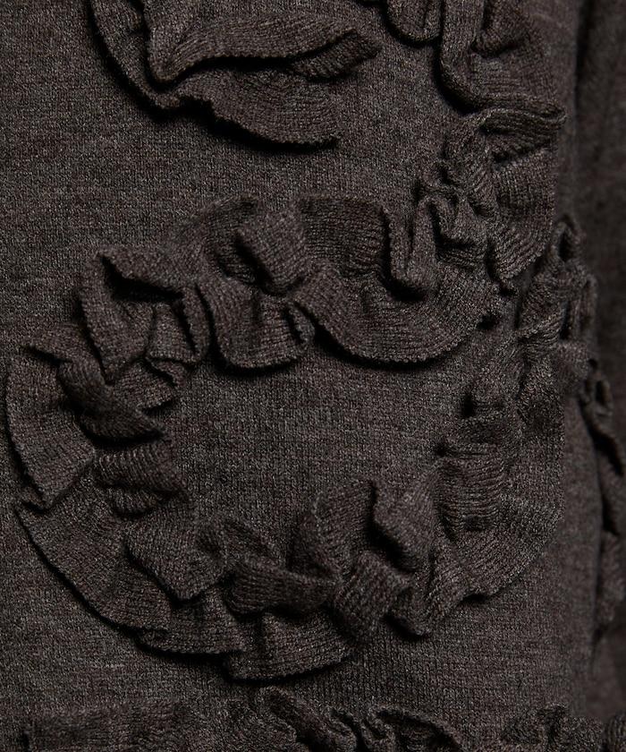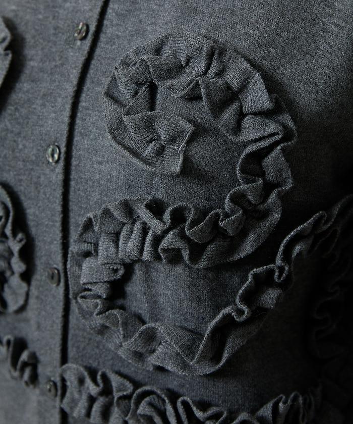 圓領針織開衫,醒目的大膽荷葉邊藝術圖案使其成為全場的焦點。