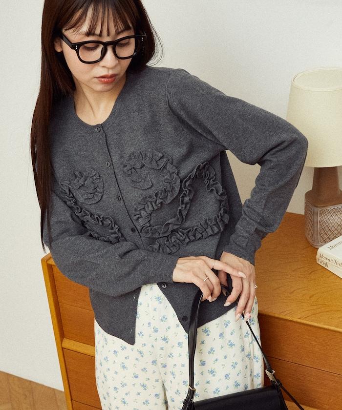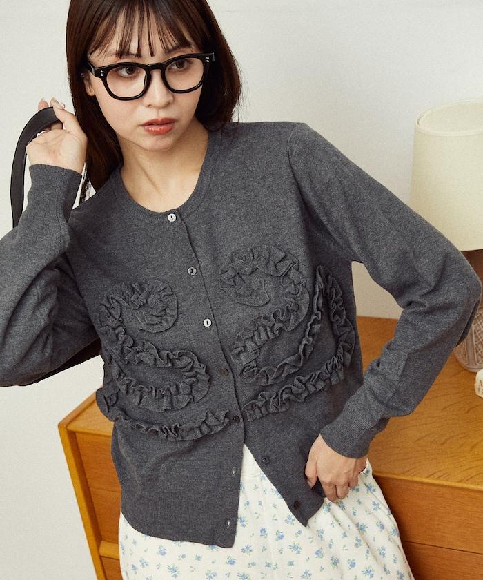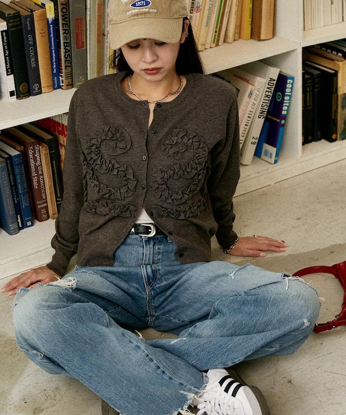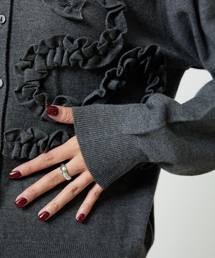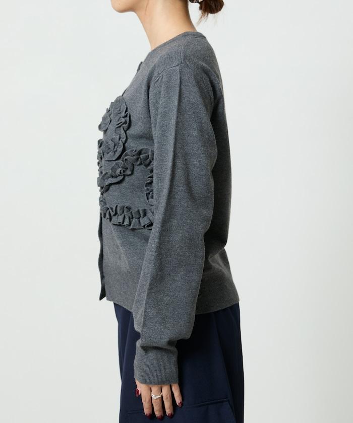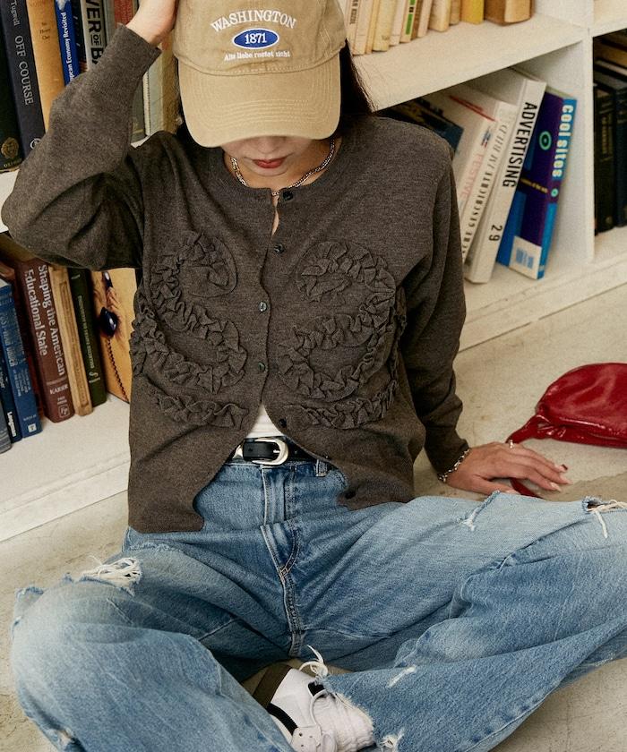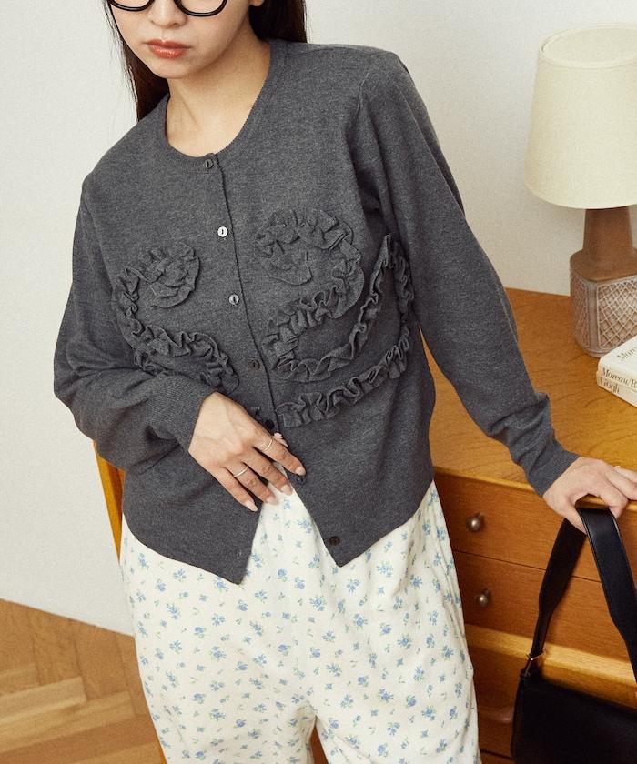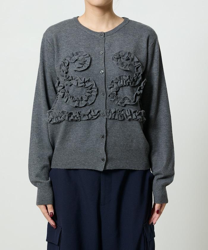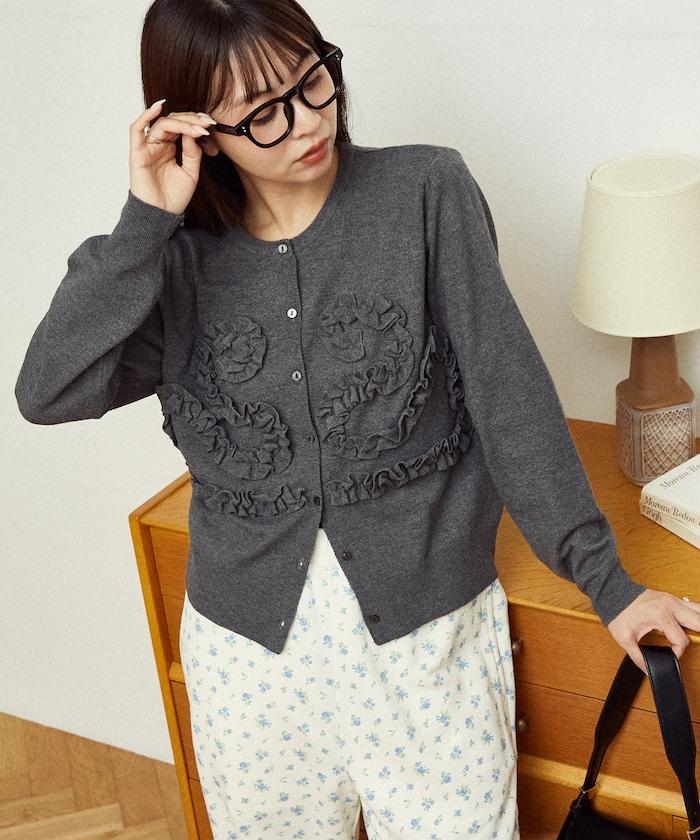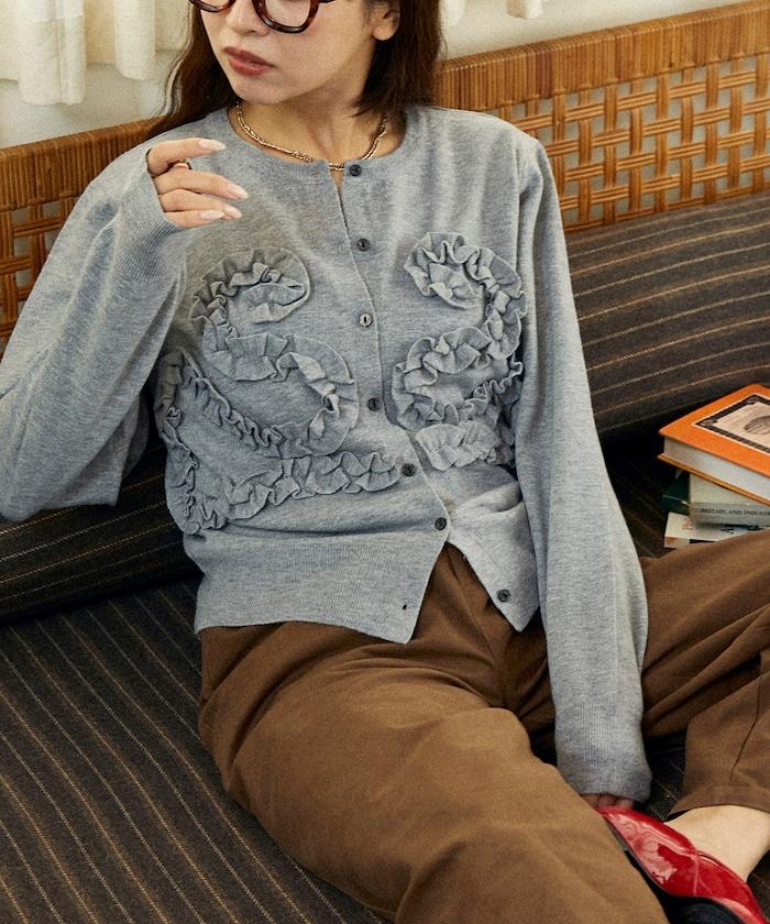 圓領針織開衫,醒目的大膽荷葉邊藝術圖案使其成為全場的焦點。