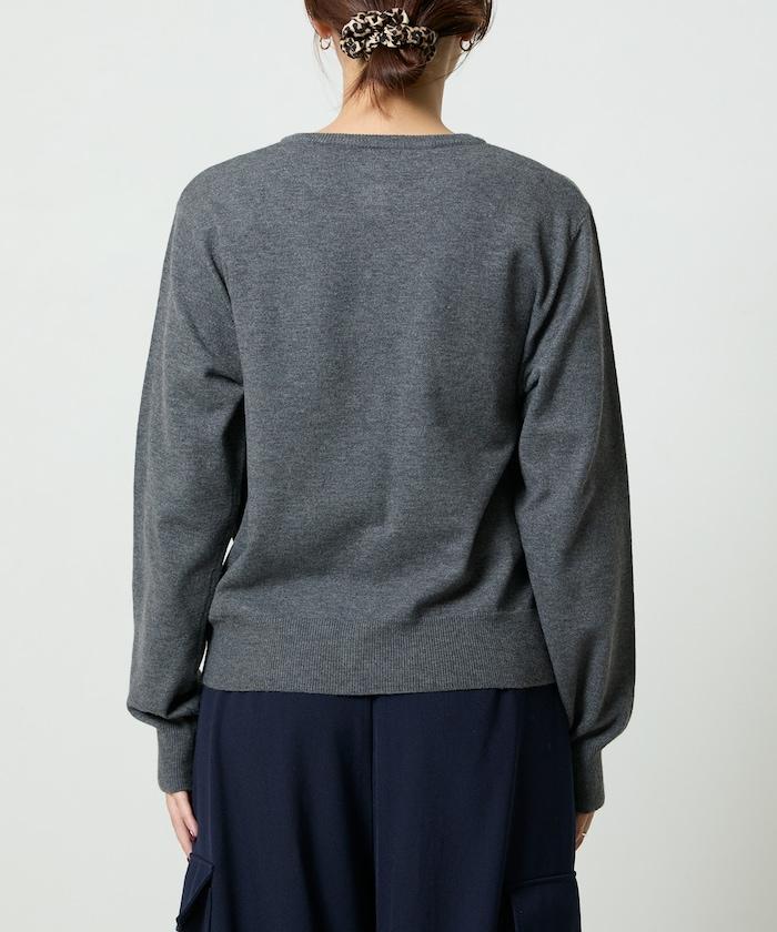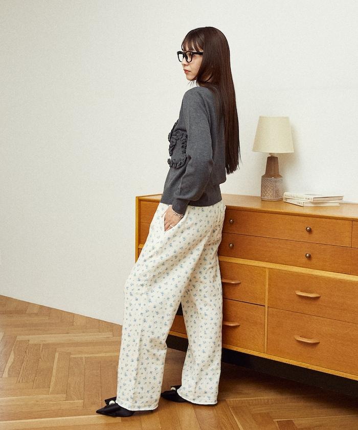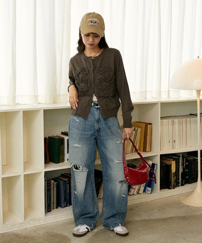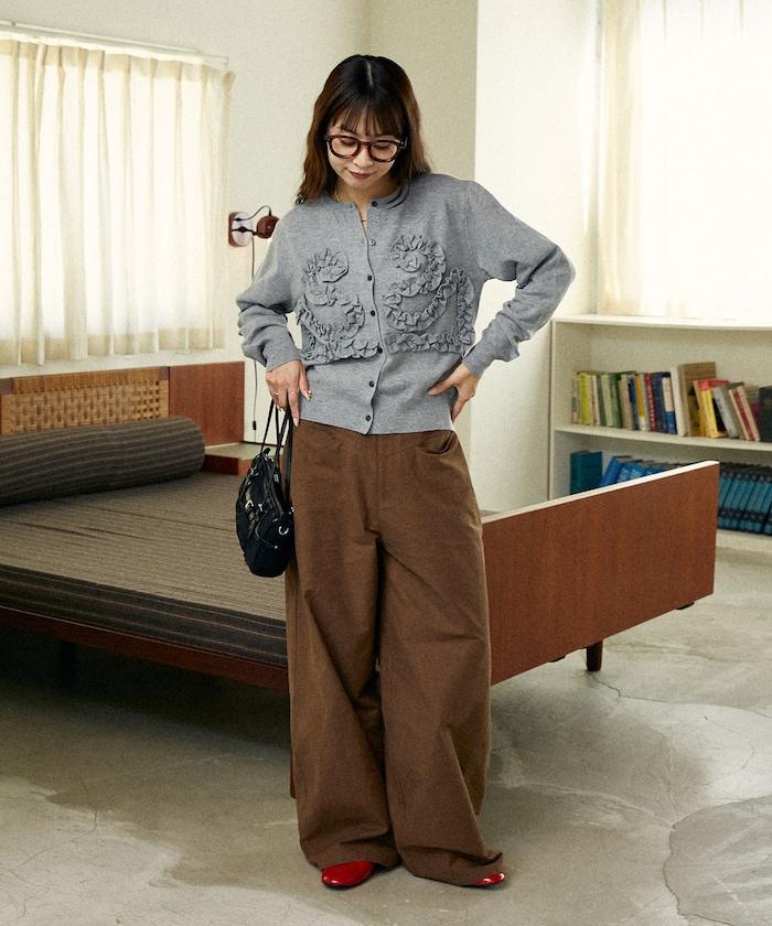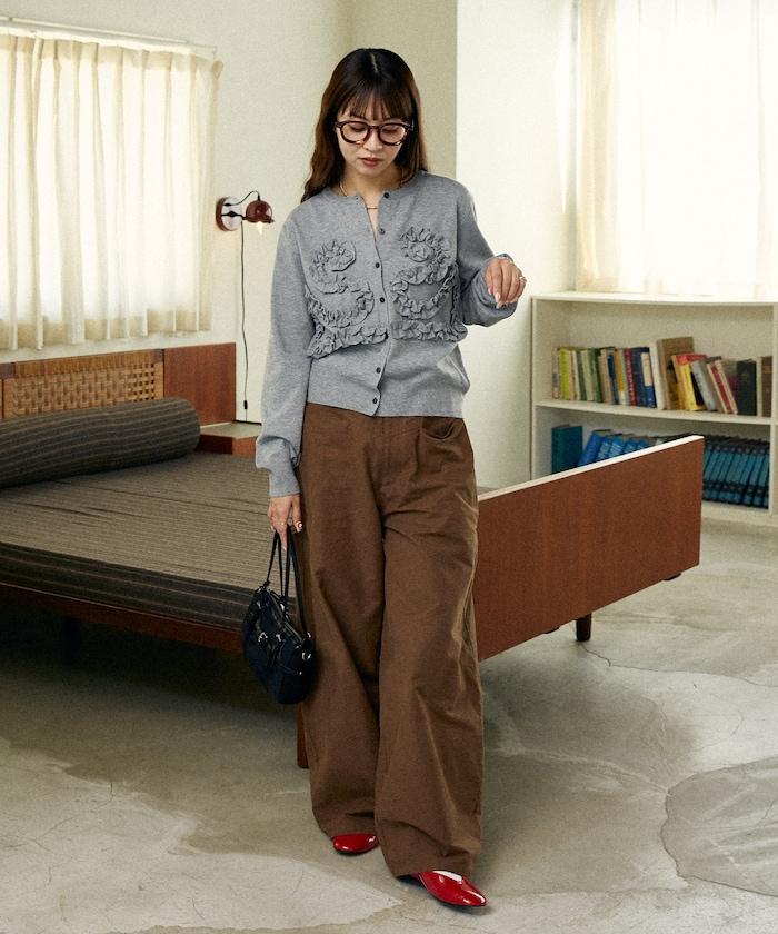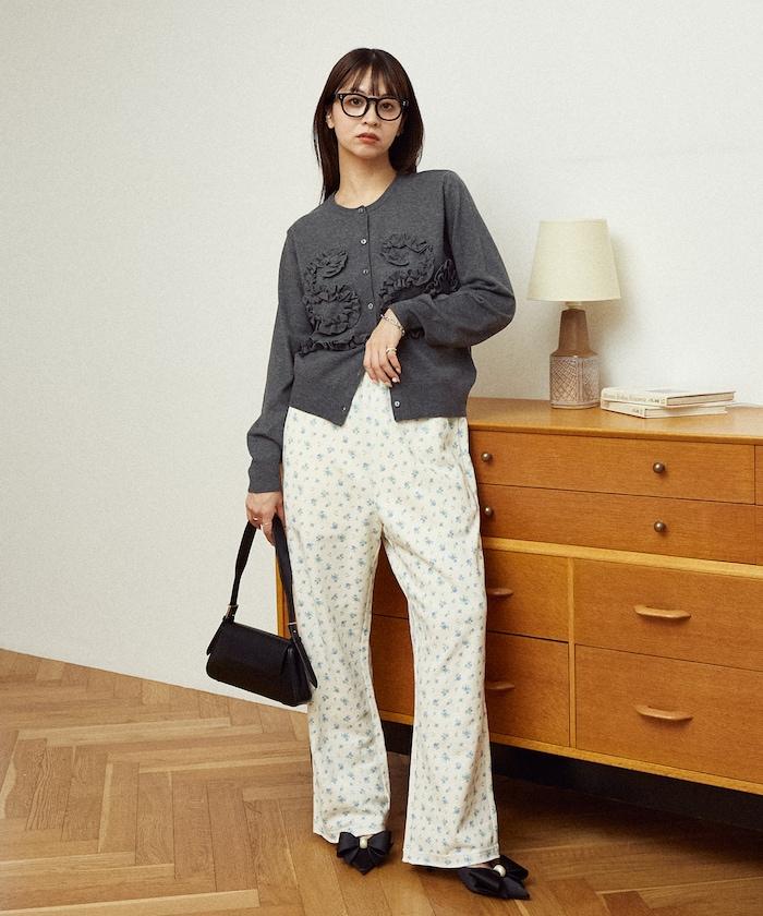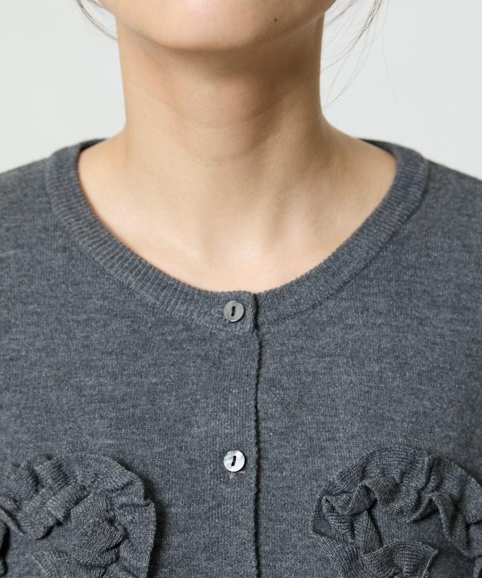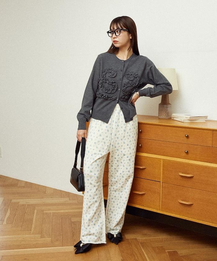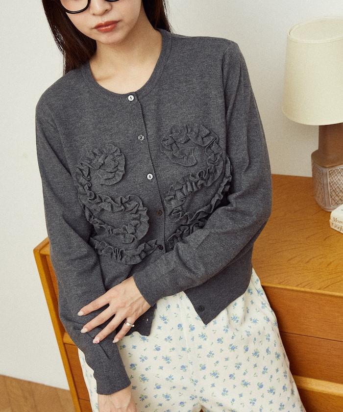 圓領針織開衫,醒目的大膽荷葉邊藝術圖案使其成為全場的焦點。