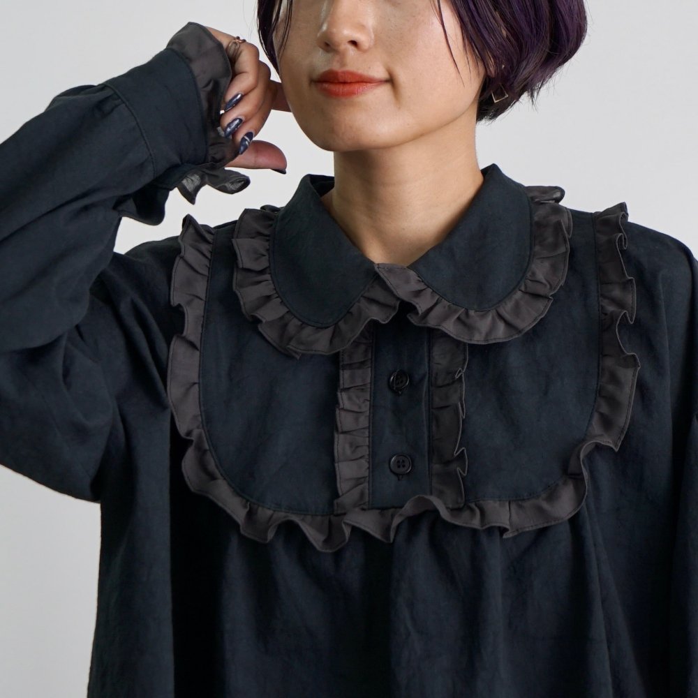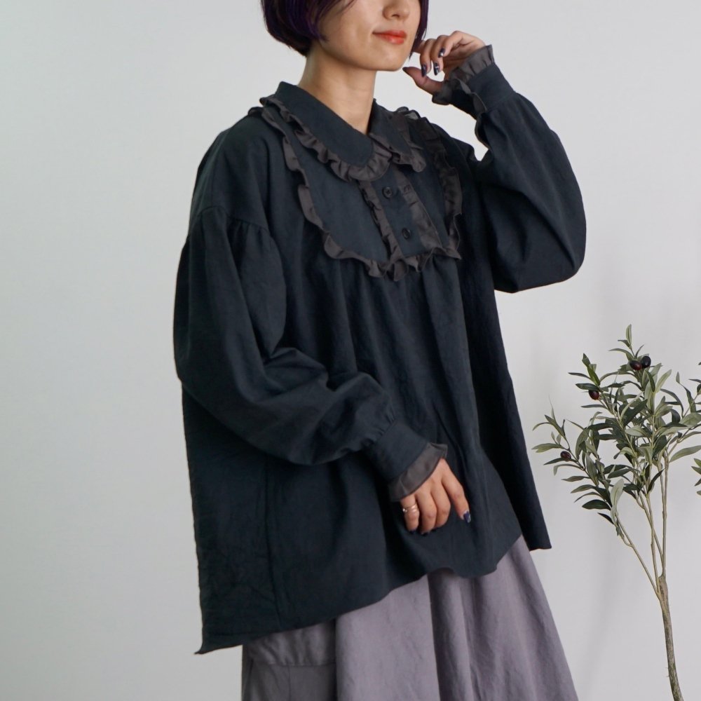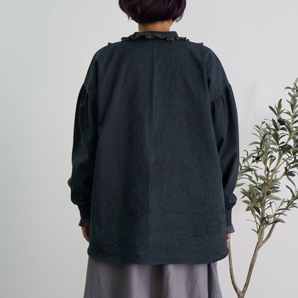 荷葉邊襯衫/黑色/三河織物