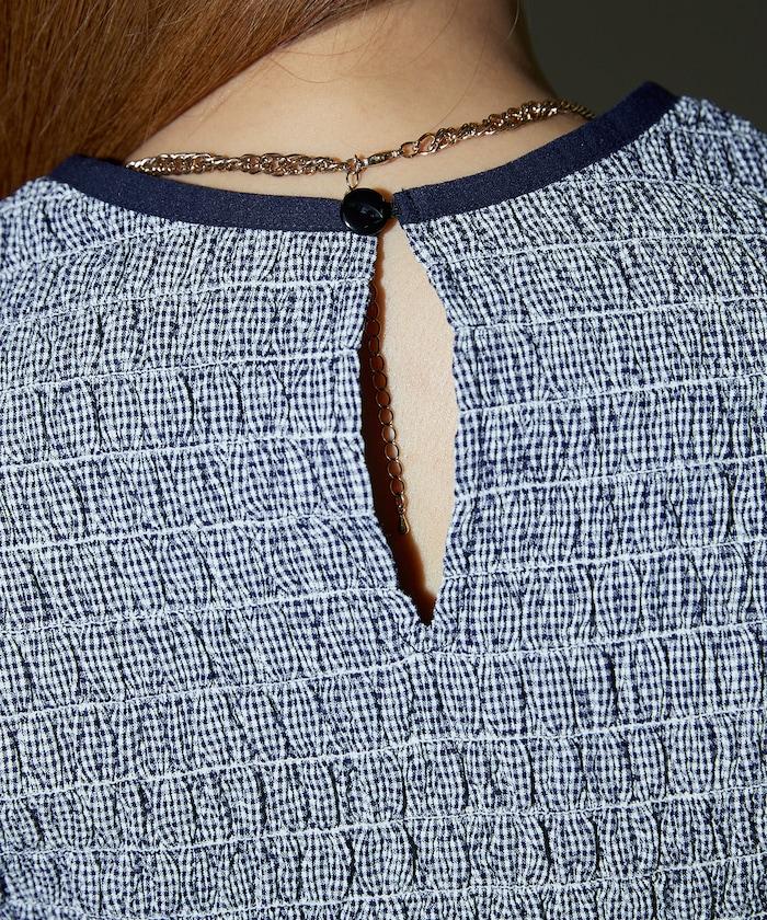 從胸前到下襬採用的圓領處理是極具表現力的設計要點。